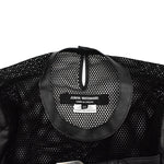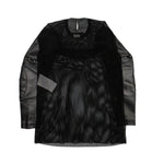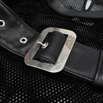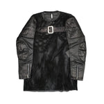 Junya Watanabe mesh top in black perforated velour with quilted pleather sleeves and a leather harness strap across the chest with silver buckle hardware.
