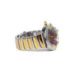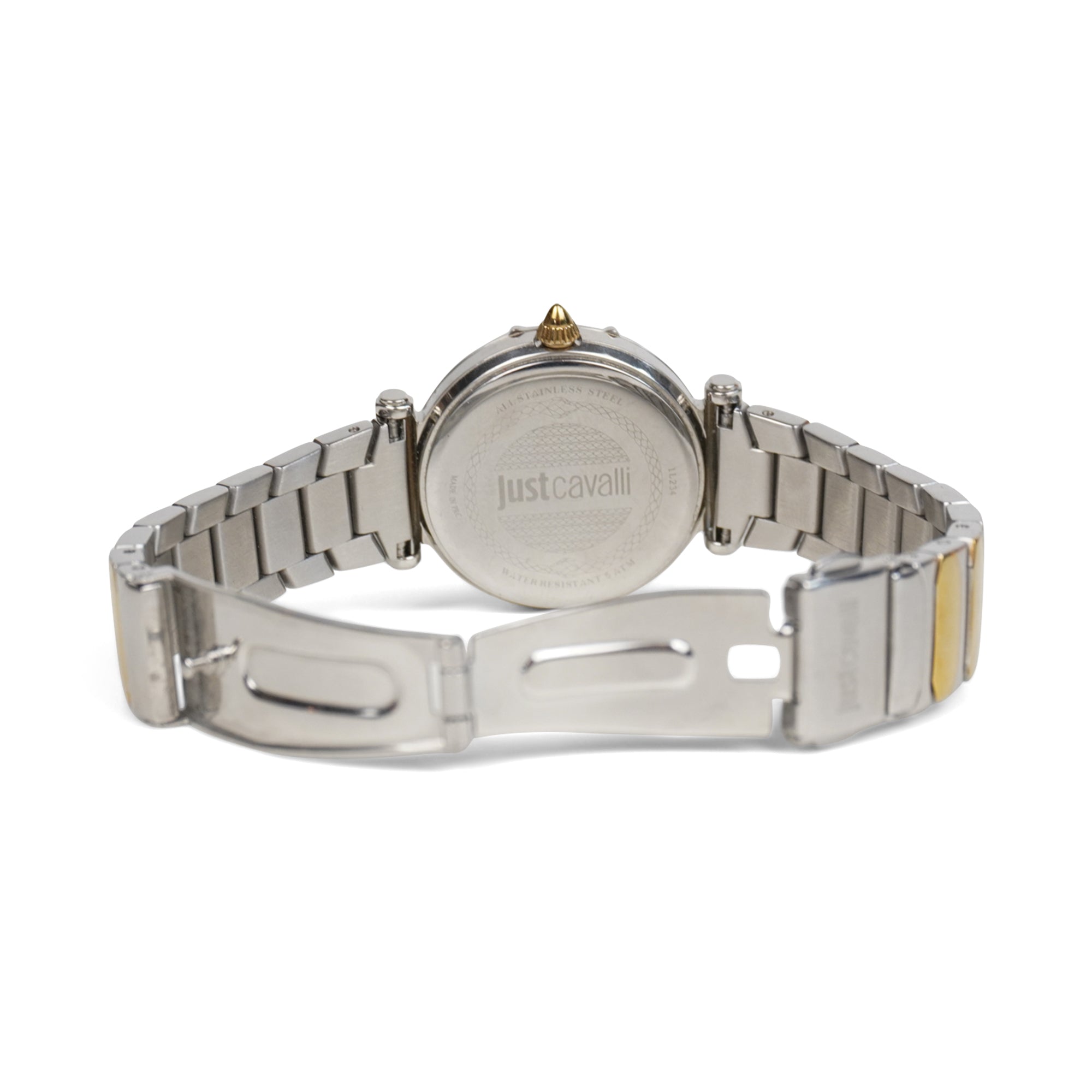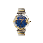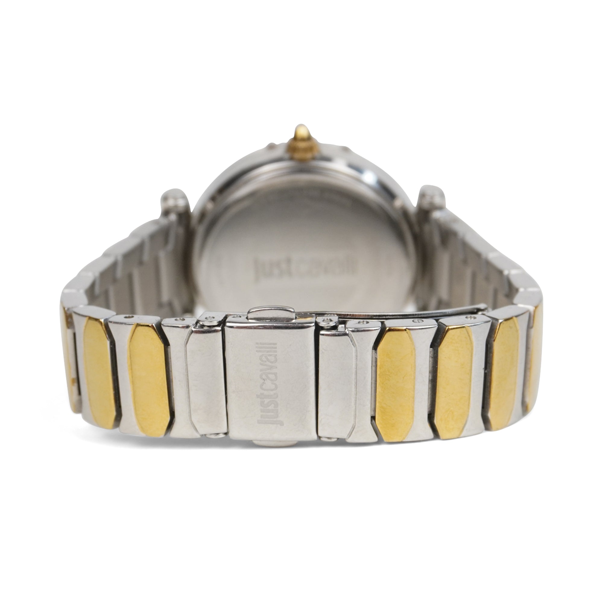 Just Cavalli watch in gold and silver stainless steel with a blue face. Features a snake-head embossed face rim, gold textured snake around the face, a butterfly clasp closure, and gold hardware hands and hour markers with diamonds on the face.