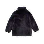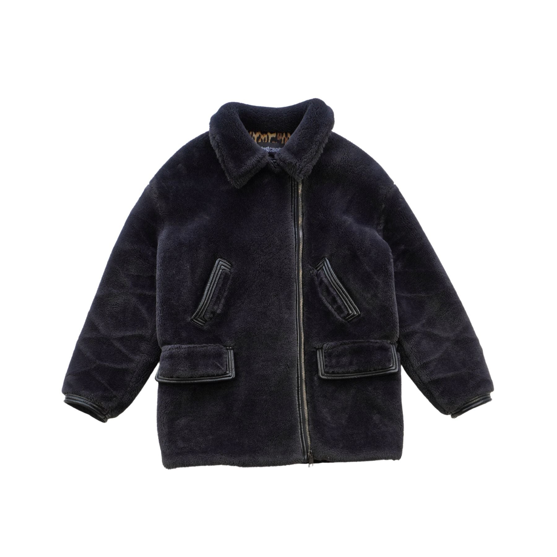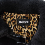 Just Cavalli oversized fur coat in black faux fur with black leather trim, large flap pockets and asymmetrical double zip closure in gunmetal hardware. Features a leopard lining.