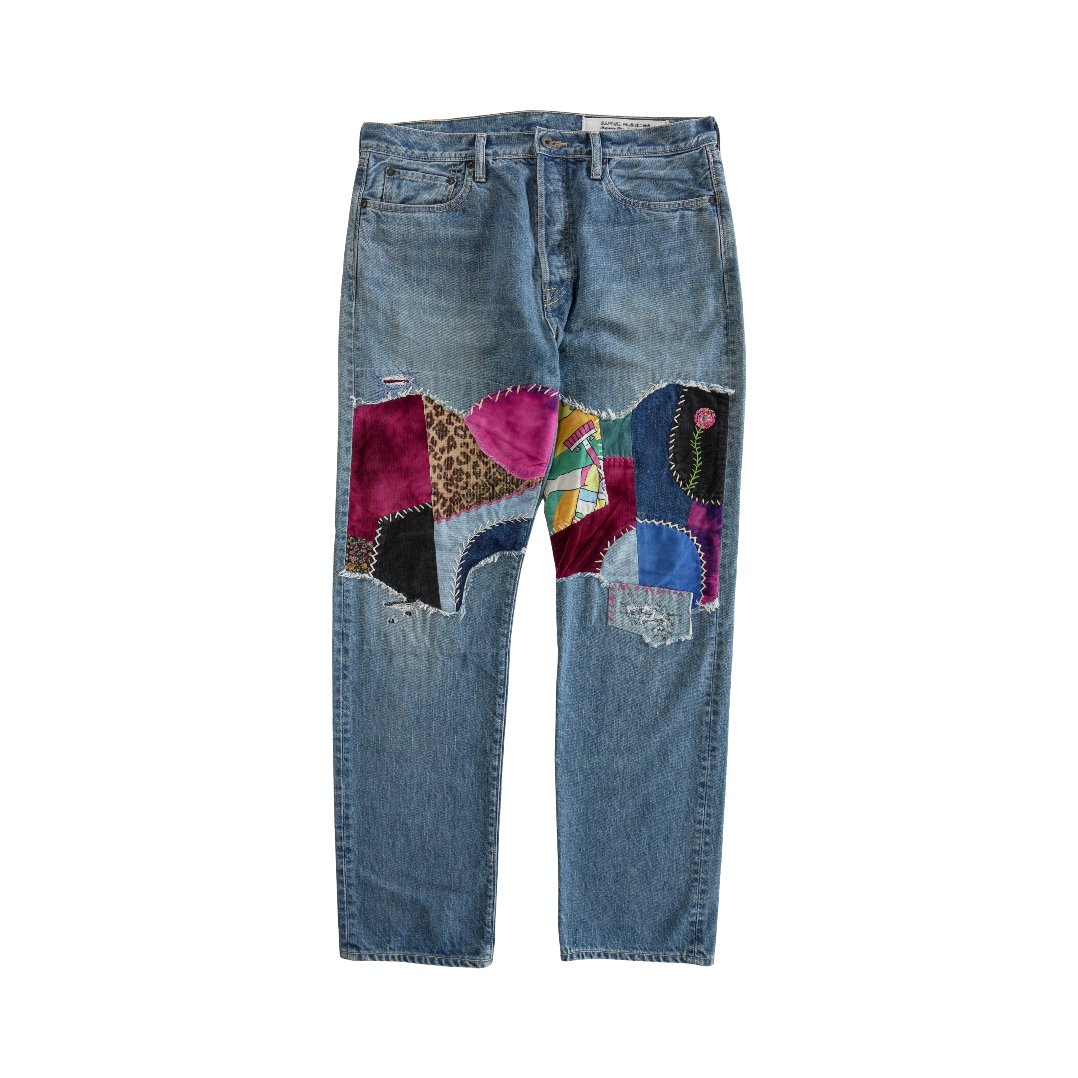 Kapital 'Monkey Cisco Patchwork' straight-leg jeans in light washed blue denim with multi-pattern patchwork on the thighs and knees and embroidered flowers on the back pocket.