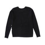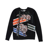 Kenzo long-sleeve sweater in black wool. Features sequin stripe details on the front in orange, green, and blue, rose-gold and white embroidered tiger graphics, and green sparkle embroidered bamboo trees.