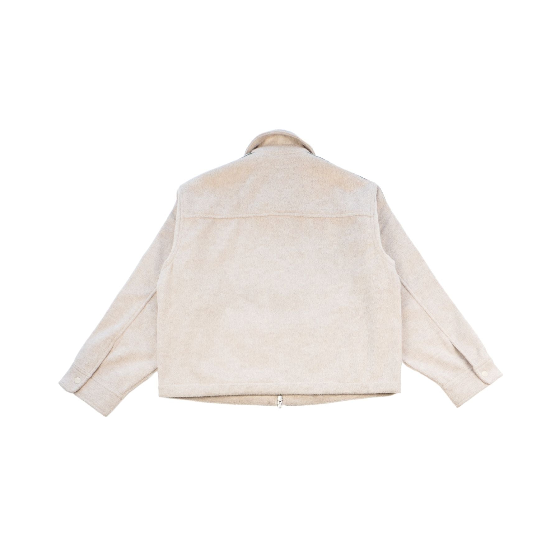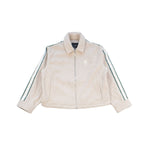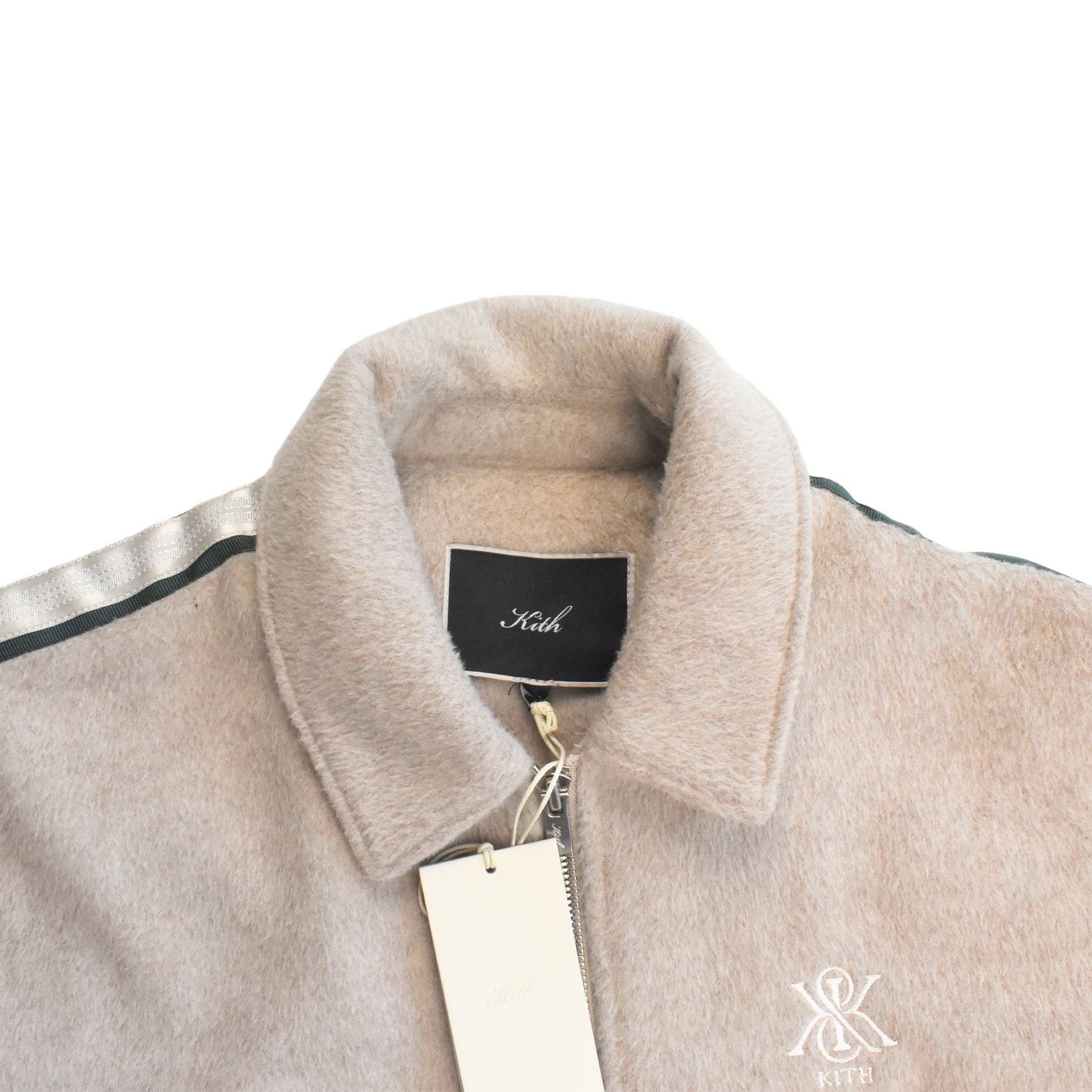 Kith 'Corwin Coach' jacket in beige double-face brushed jersey with a double zip closure in silver hardware. Features a green and beige stripe trim on the sleeves, open pockets and Kith embroidery at the chest.
