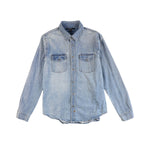 Ksubi Button-Down Shirt light blue washed denim with distressing detailing throughout and button-down closure in silver hardware.
