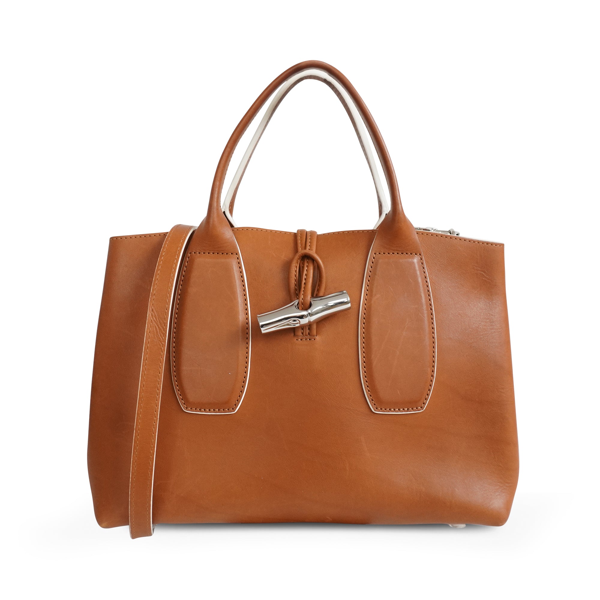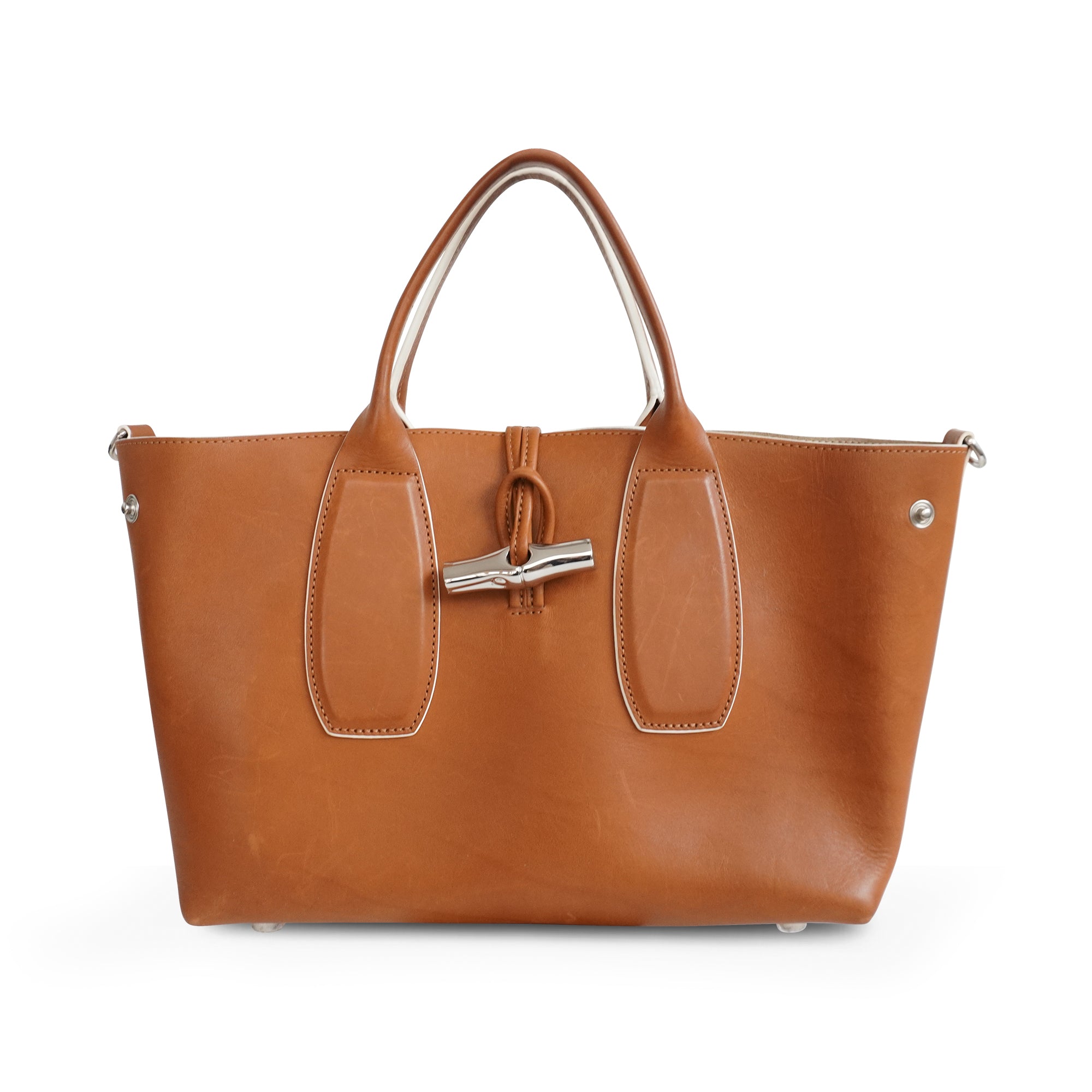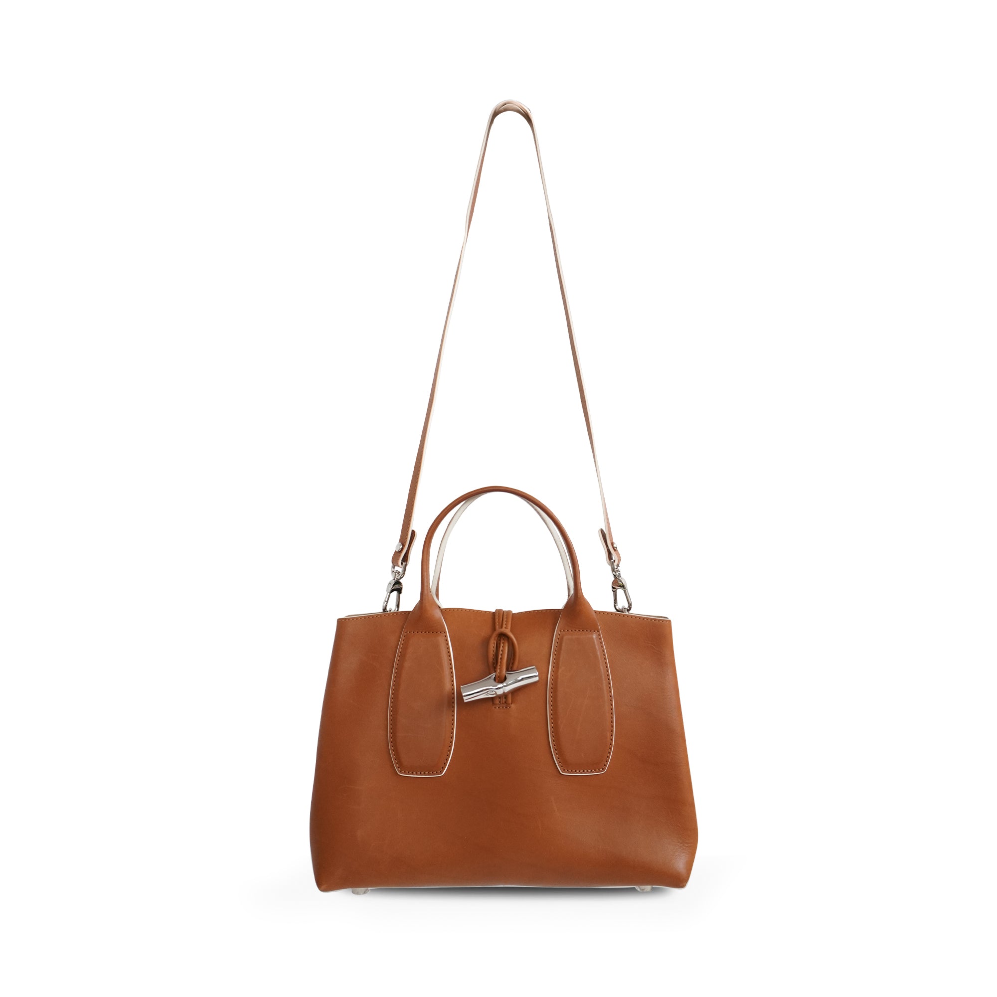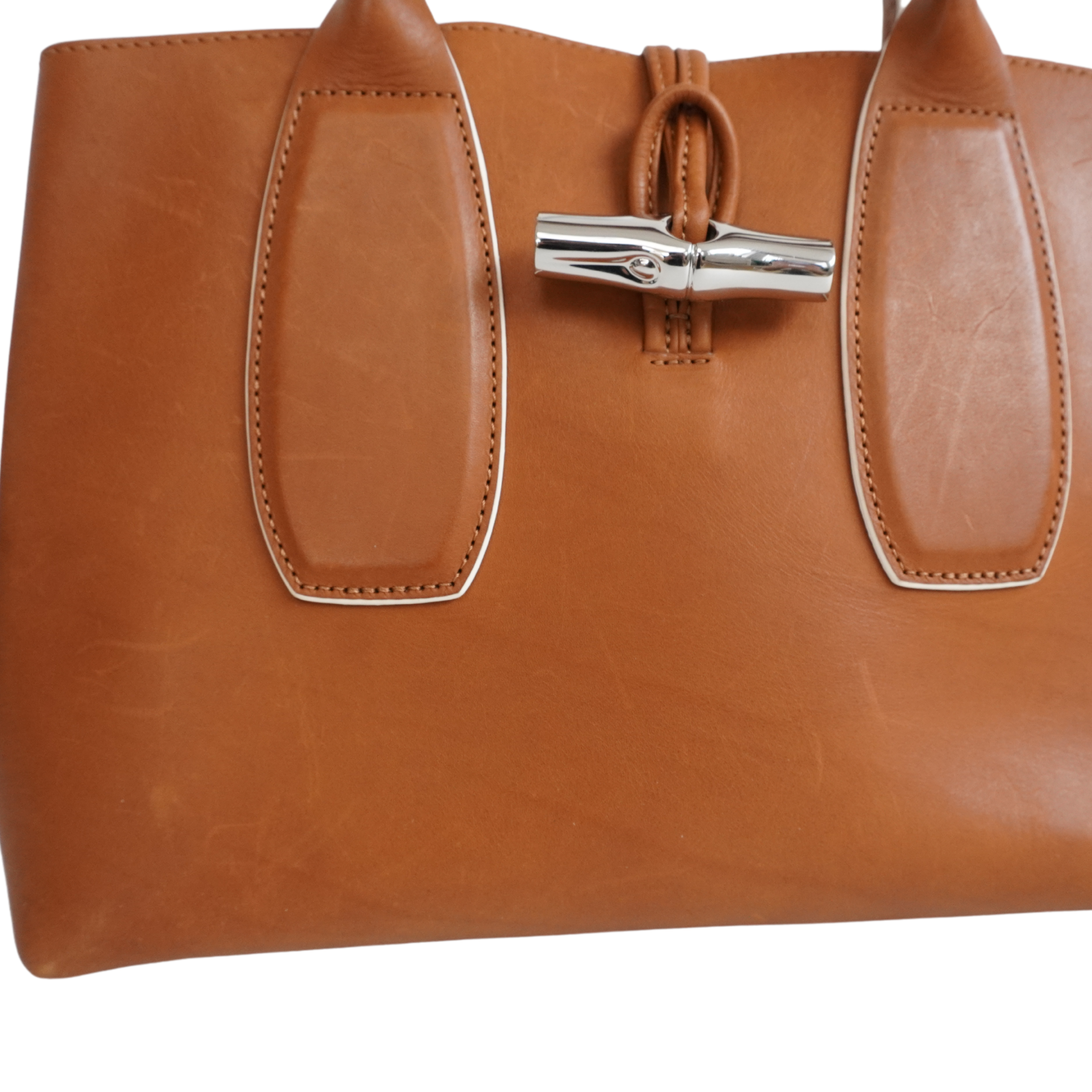 Longchamp 'Le Roseau' tote bag in smooth brown leather with white piping trim, dual rolled top handles, and a removable crossbody strap. The bag has a silver metal toggle closure, revealing an expandable suede interior with zip and slip pockets.
