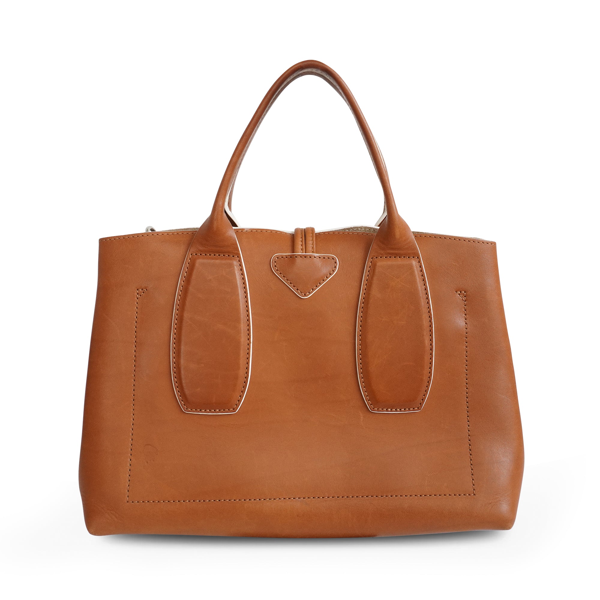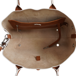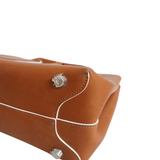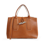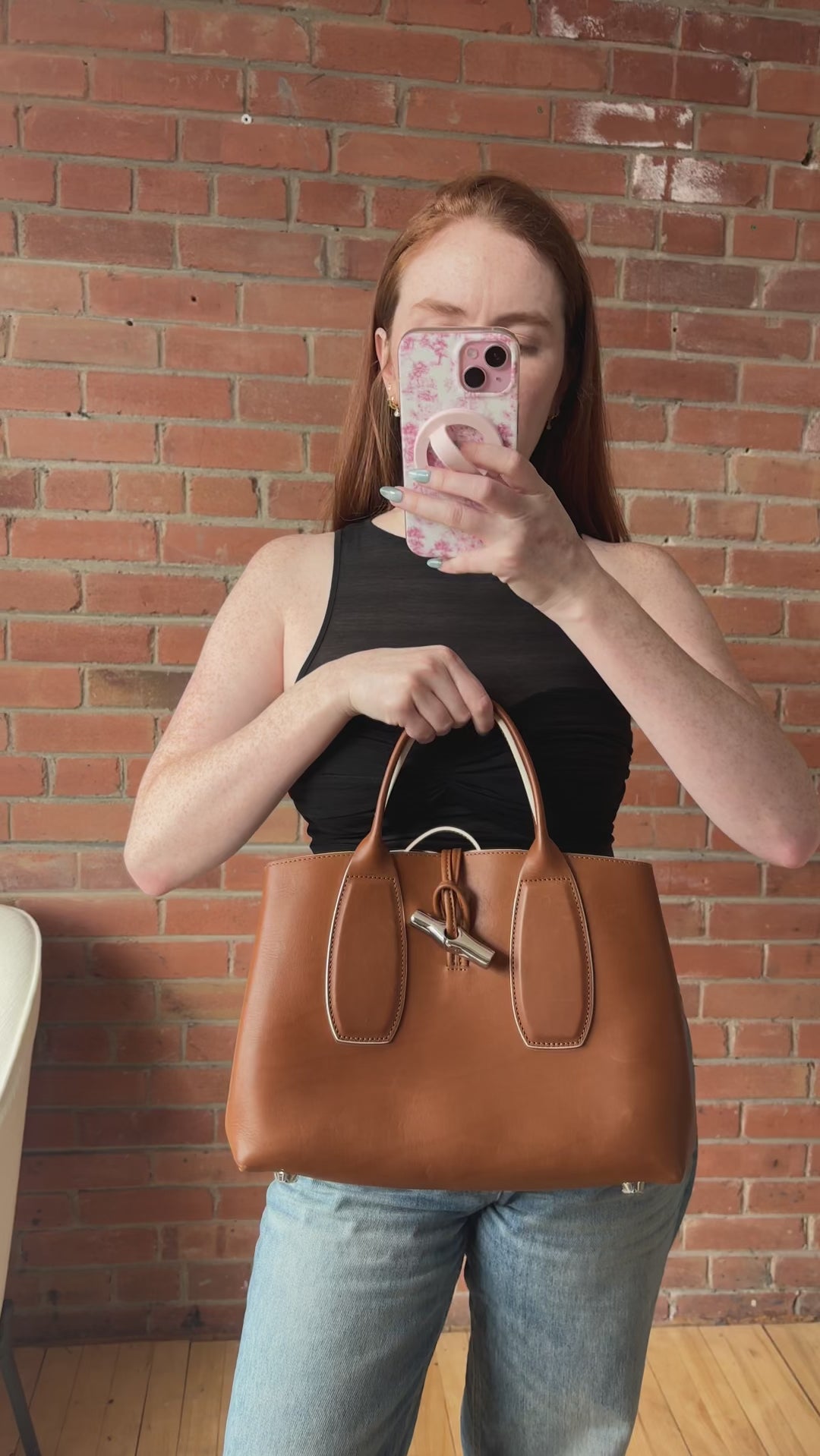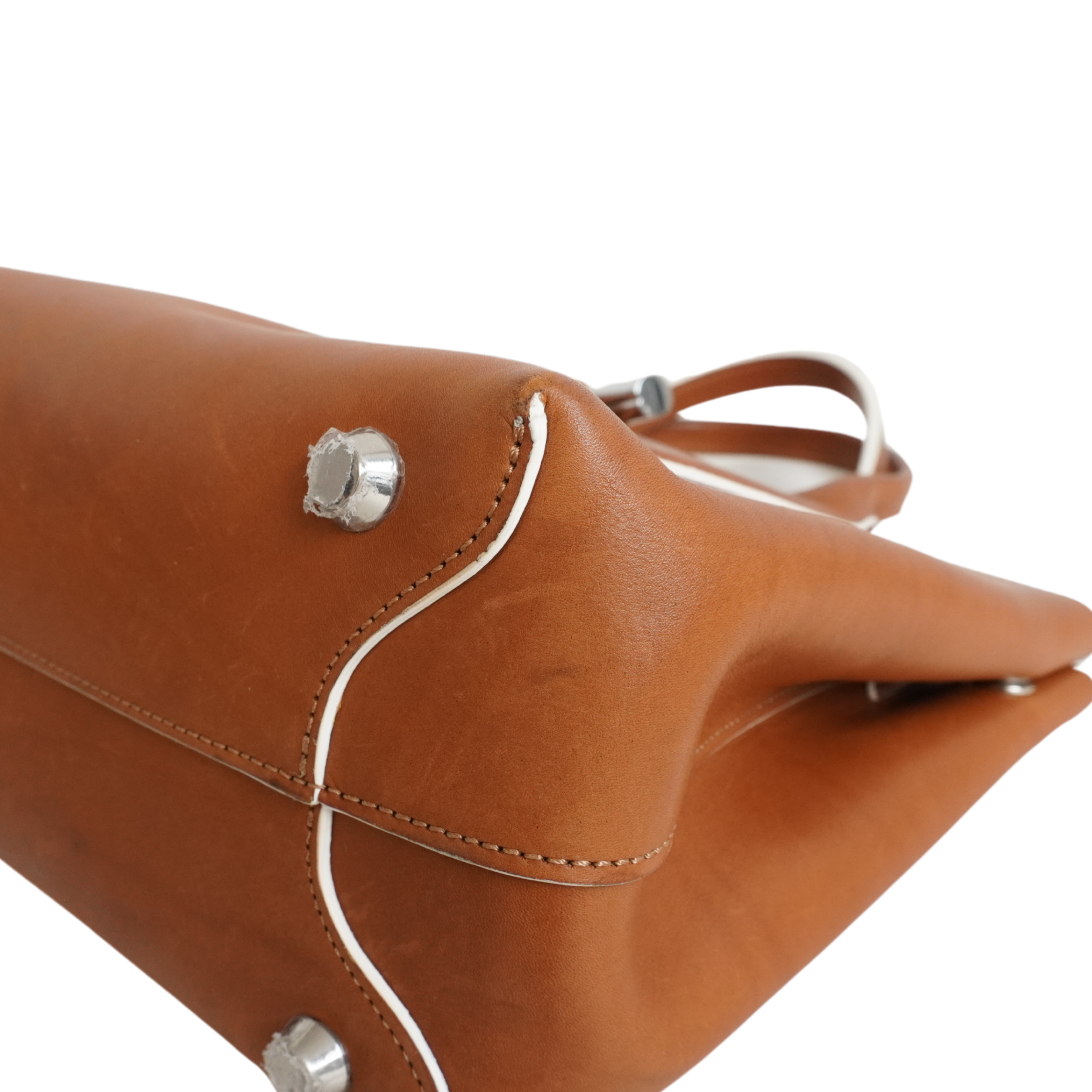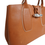 Longchamp 'Le Roseau' tote bag in smooth brown leather with white piping trim, dual rolled top handles, and a removable crossbody strap. The bag has a silver metal toggle closure, revealing an expandable suede interior with zip and slip pockets.