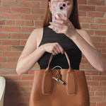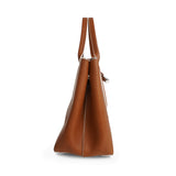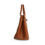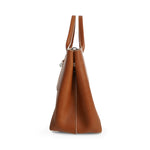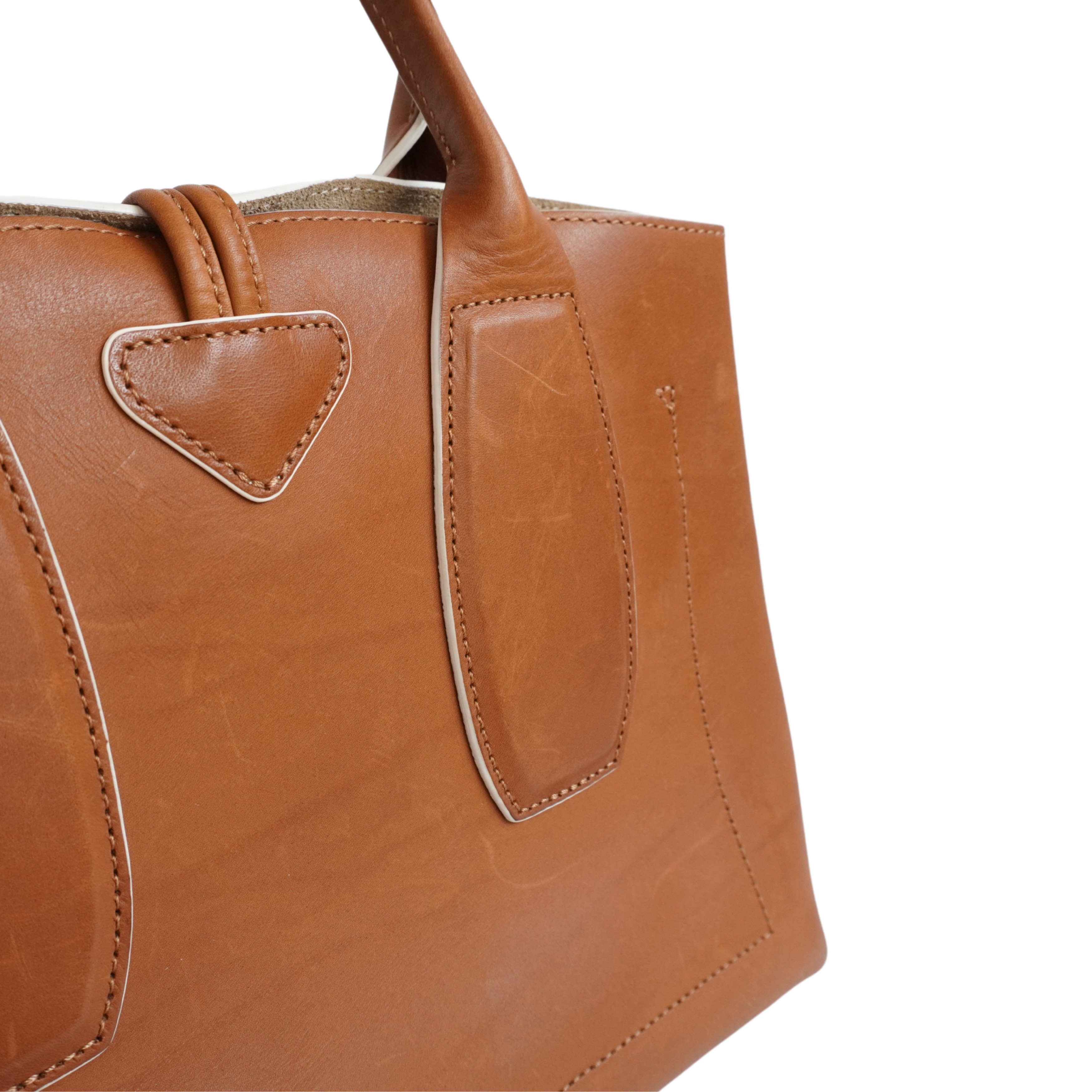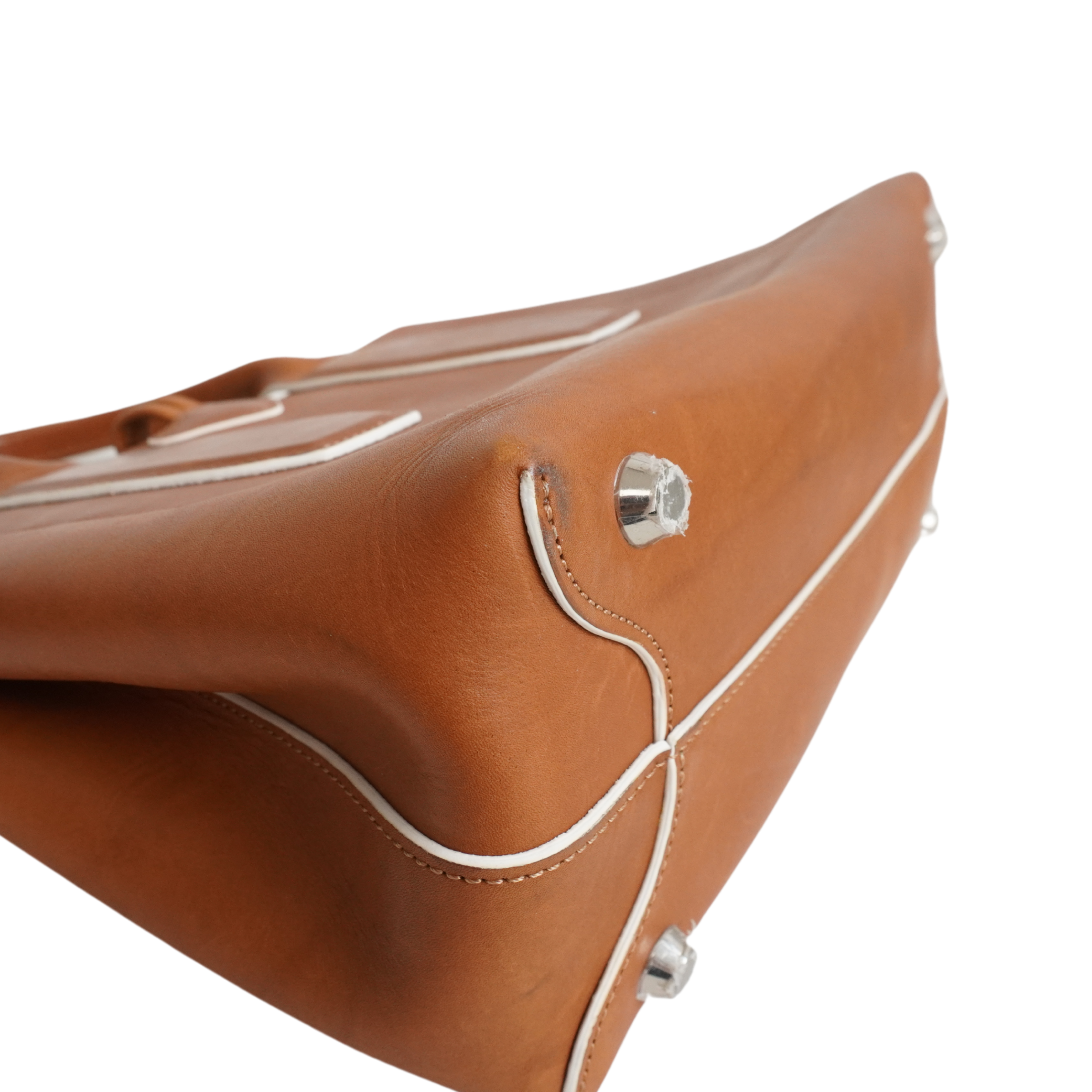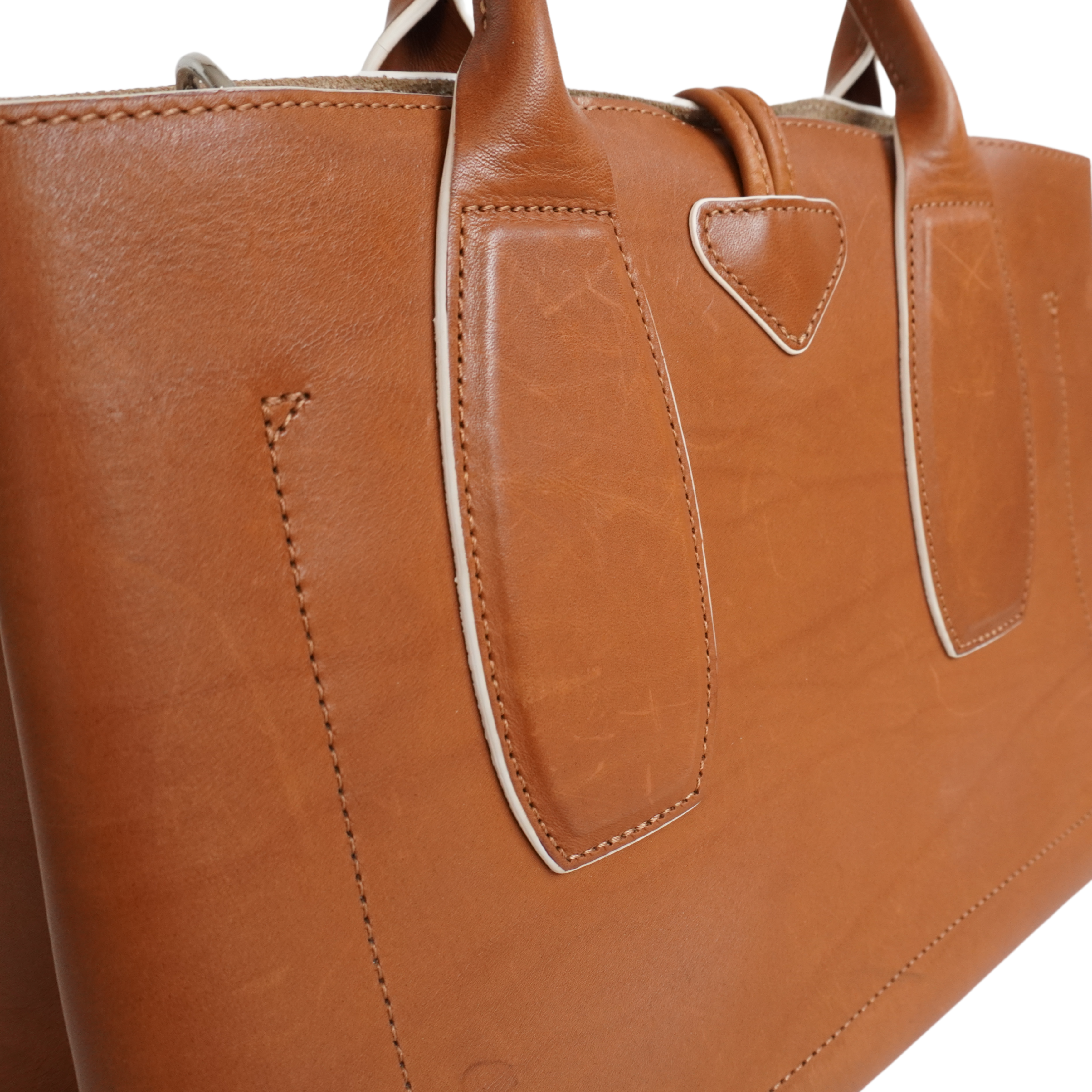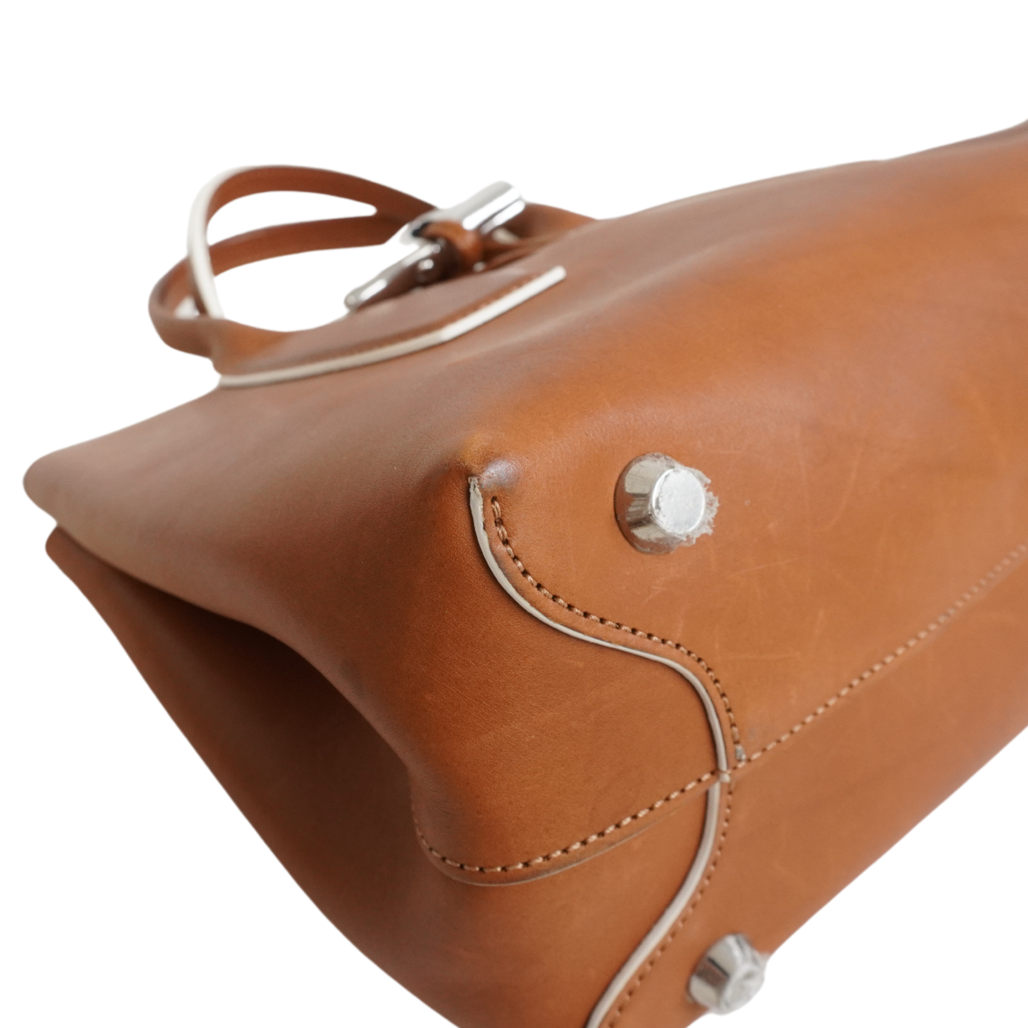 Longchamp 'Le Roseau' tote bag in smooth brown leather with white piping trim, dual rolled top handles, and a removable crossbody strap. The bag has a silver metal toggle closure, revealing an expandable suede interior with zip and slip pockets.