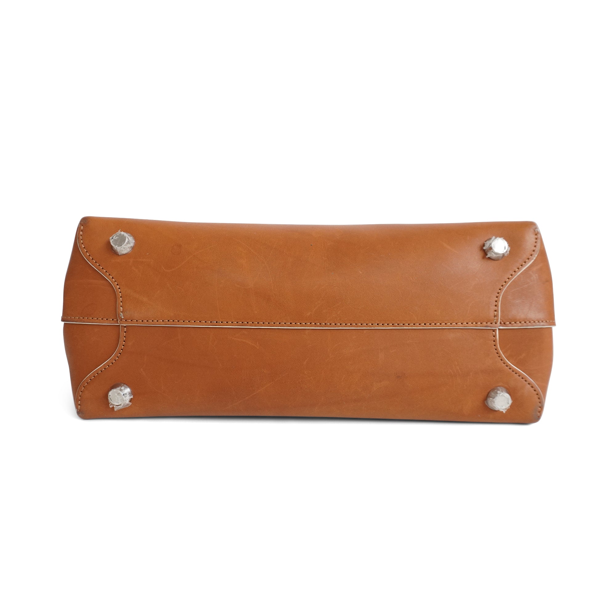 Good. Scratching throughout exterior leather, watermarks in back, wear to bottom corners and metal feet, hairline scratching in metal hardware, light wear to interior.