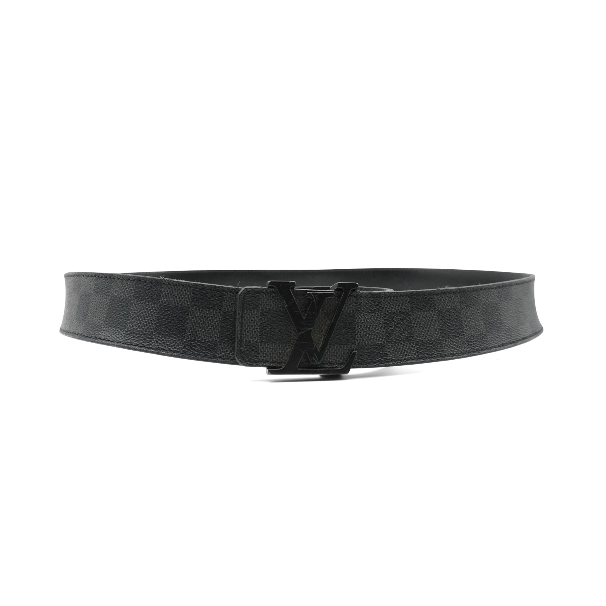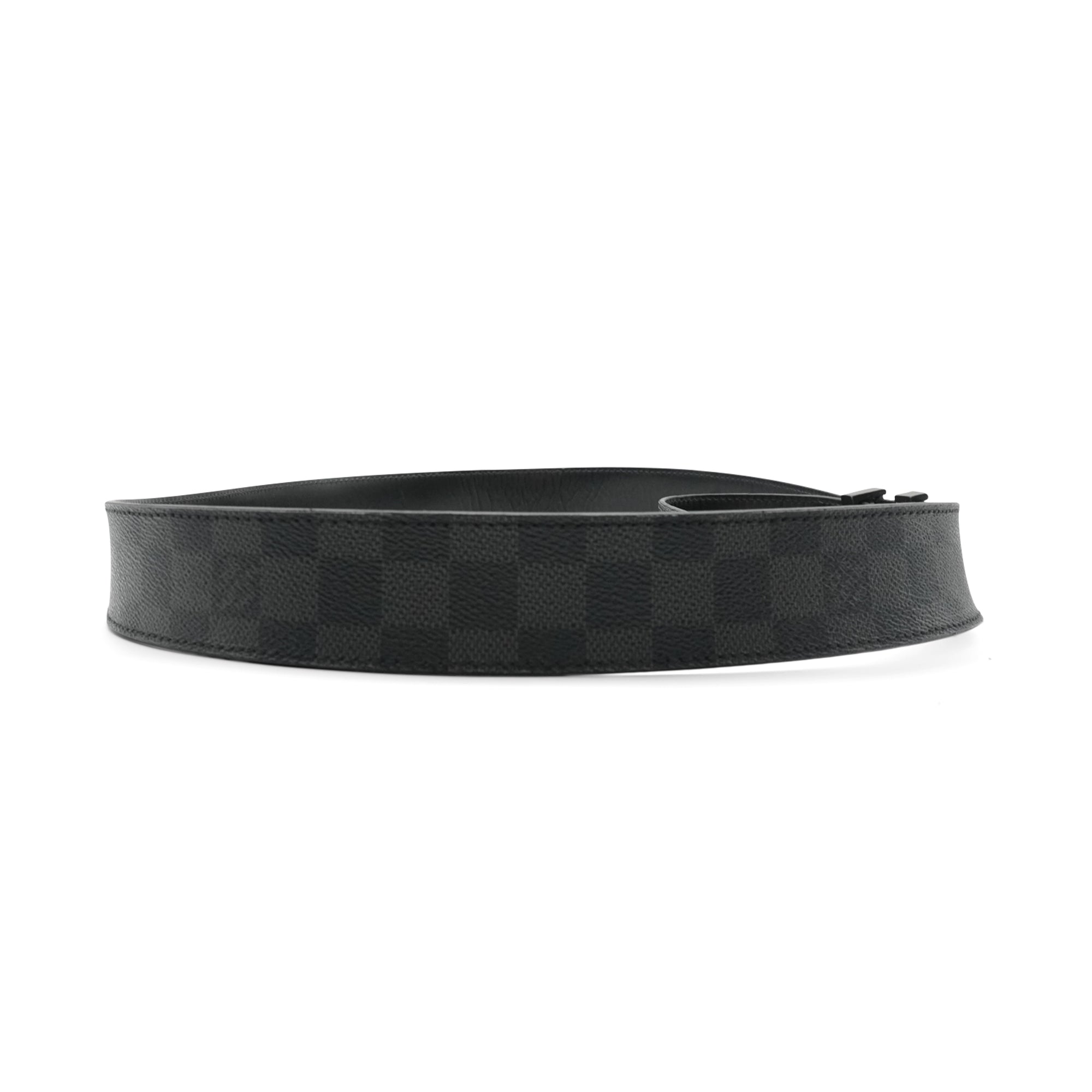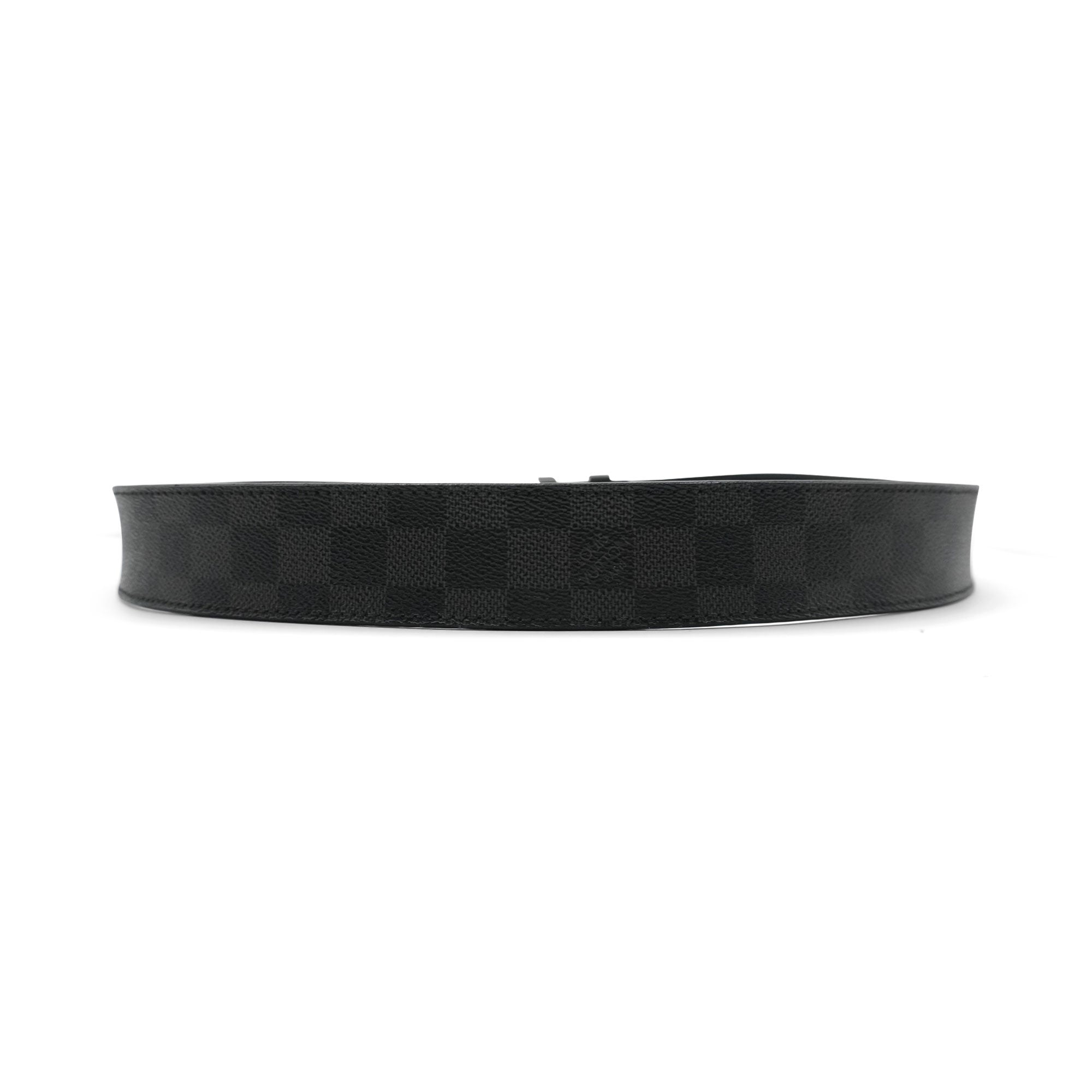 Louis Vuitton belt in graphite damier monogram printed coated canvas with an LV initial buckle.