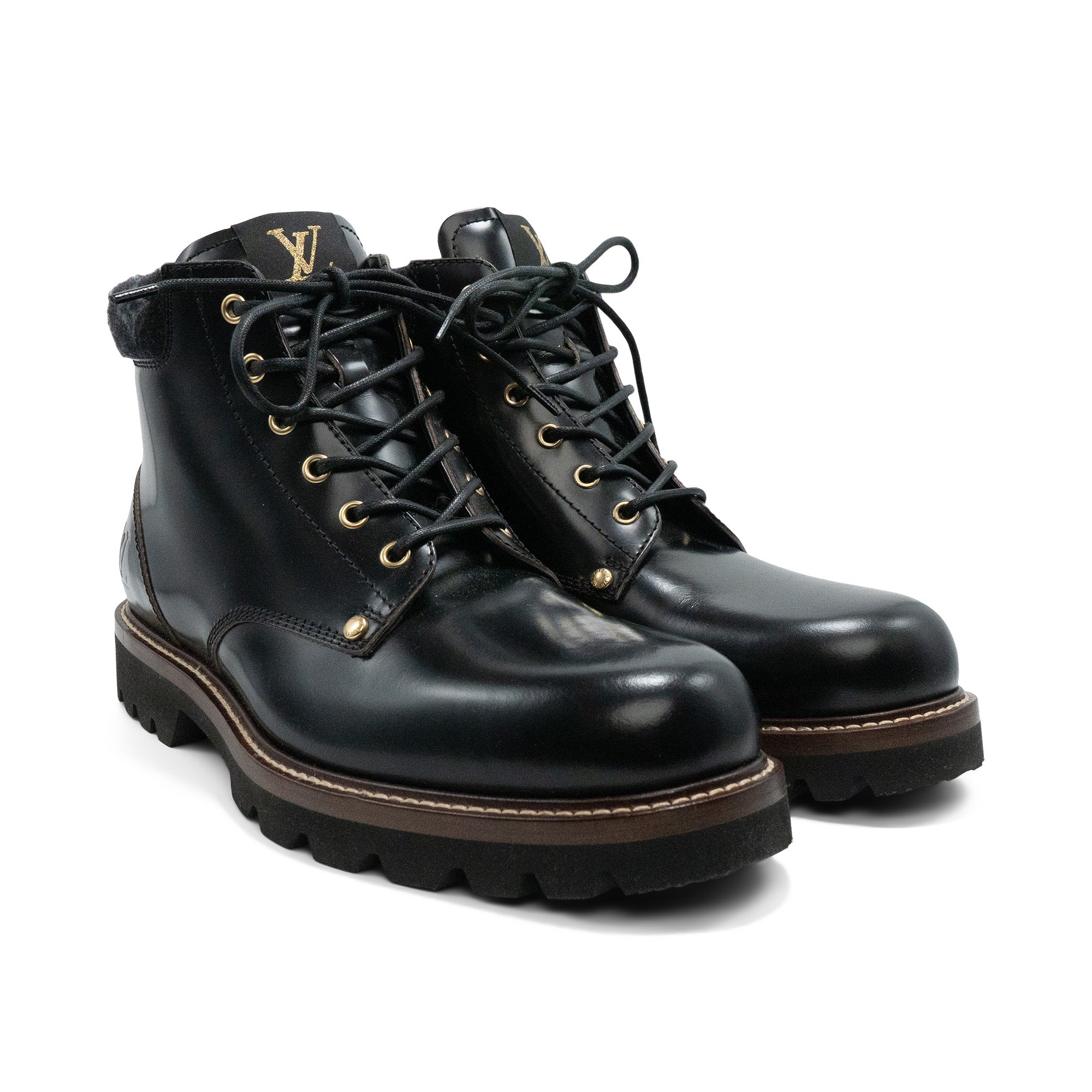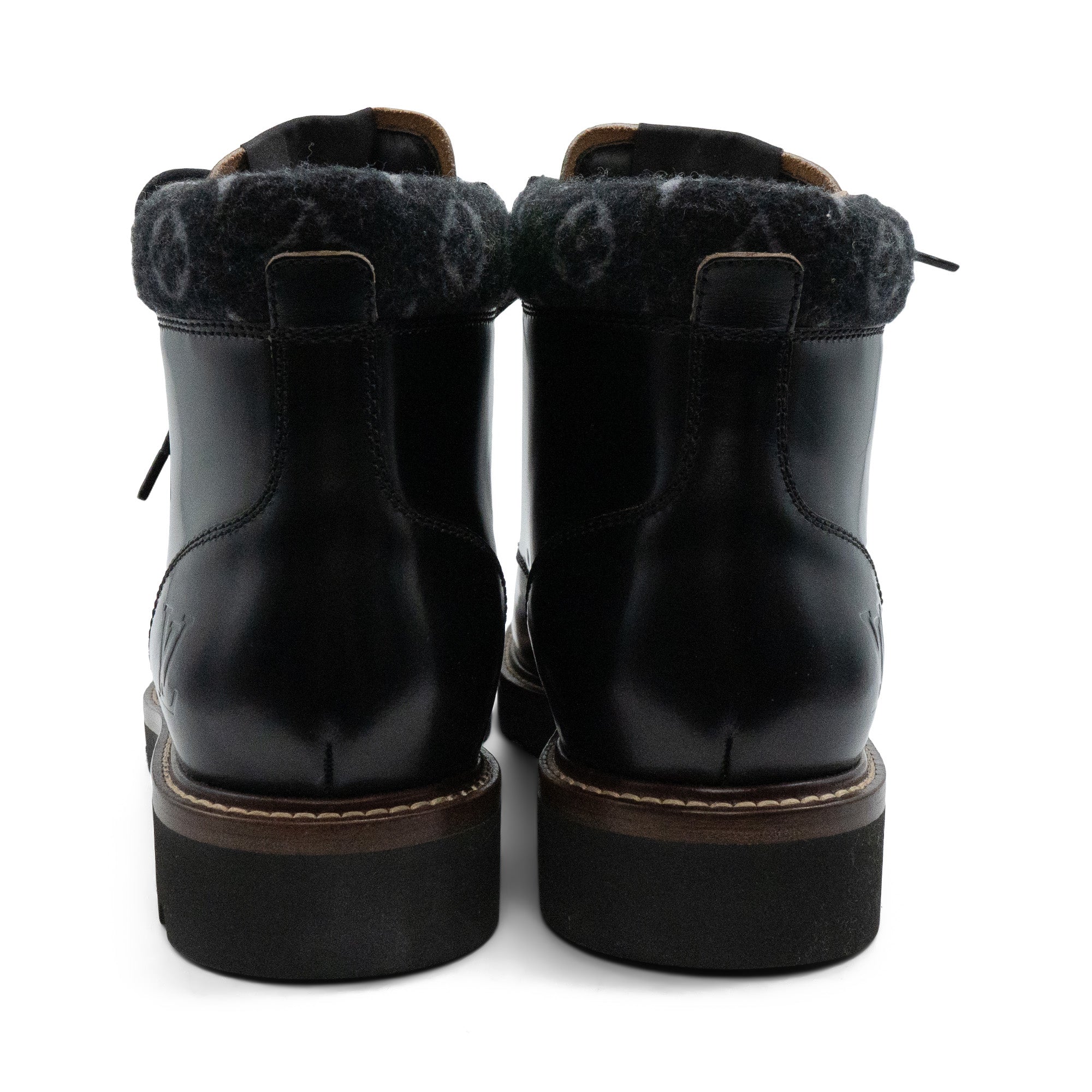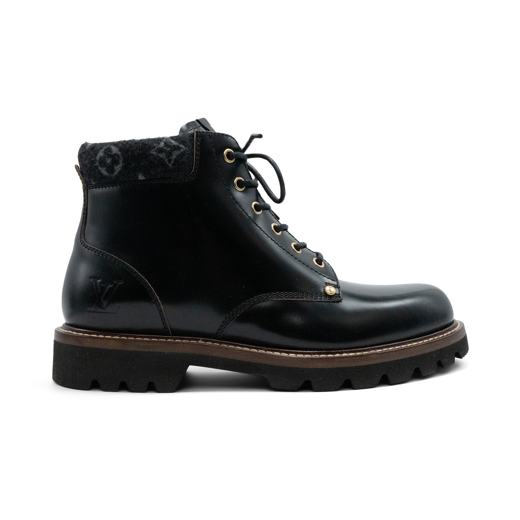 Louis Vuitton combat boots in smooth black leather with grey monogram wool ankle detail, brown and black sole with beige topstitching and gold eyelets with round laces.