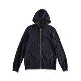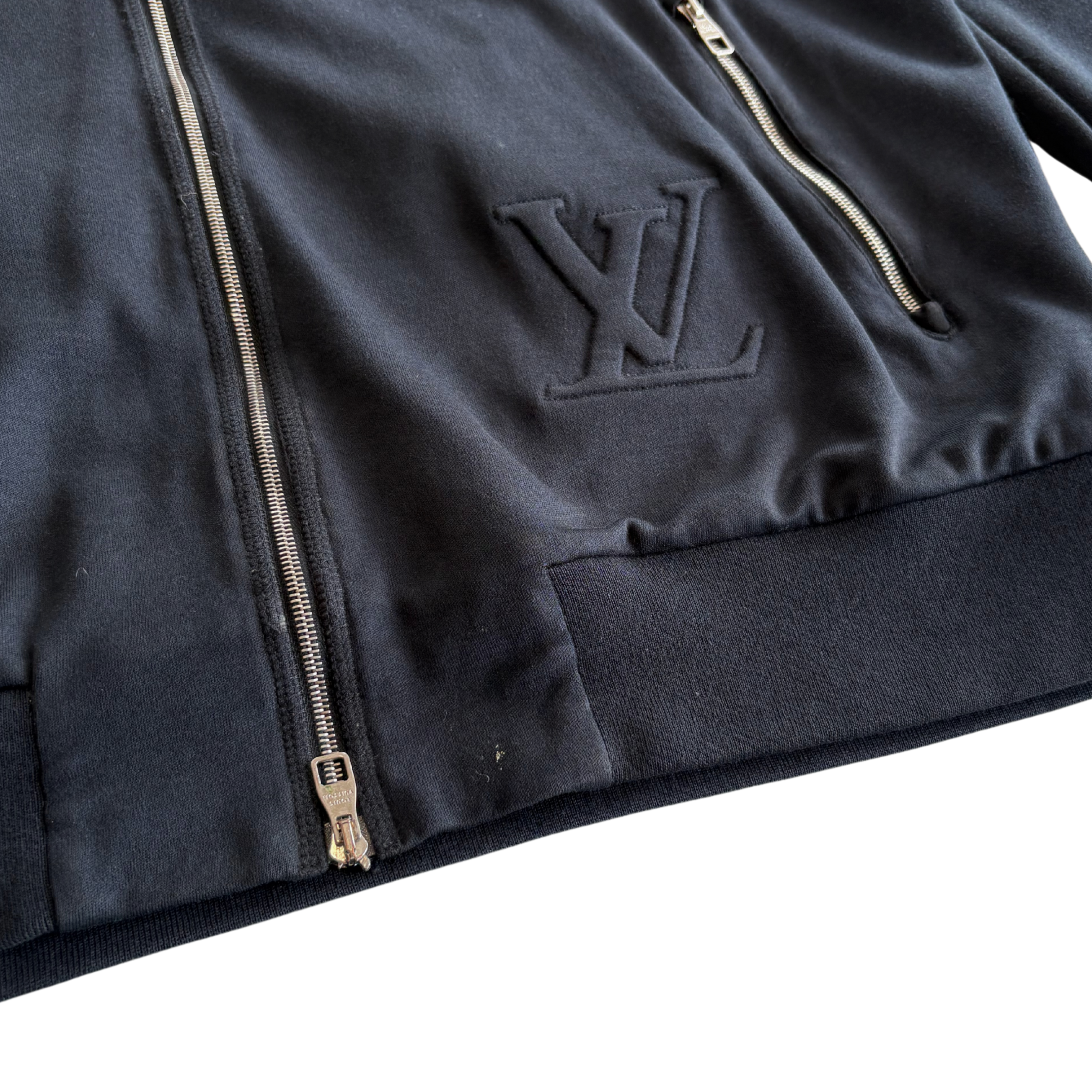 Louis Vuitton hoodie in navy cotton with damier printed hoodie lining and embossed LV logo at the left hem. Features a two-way zipper and front zip pockets.
