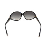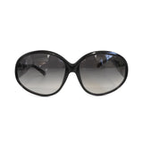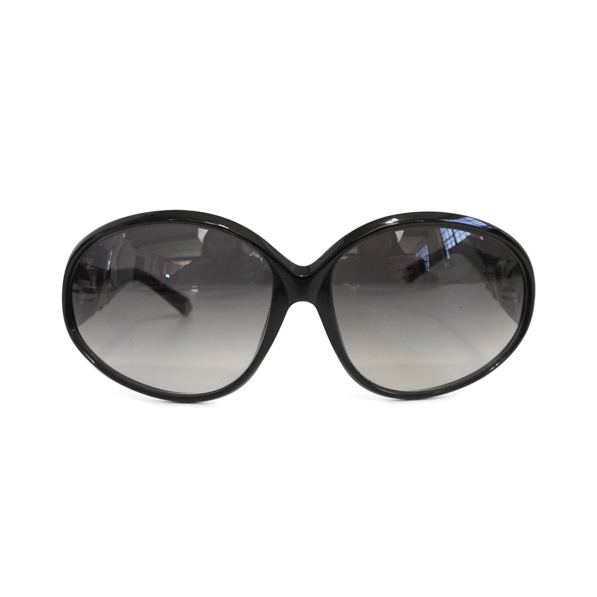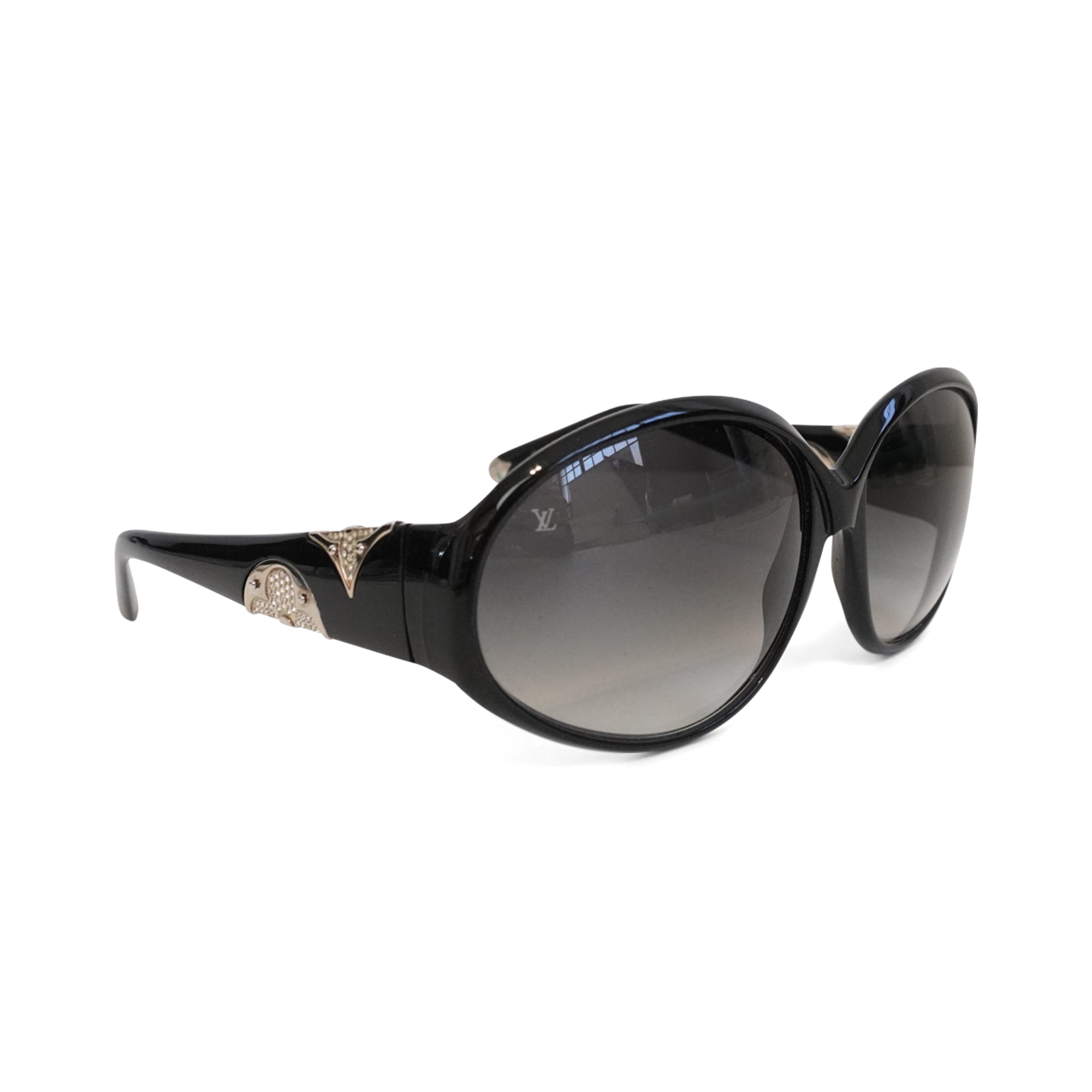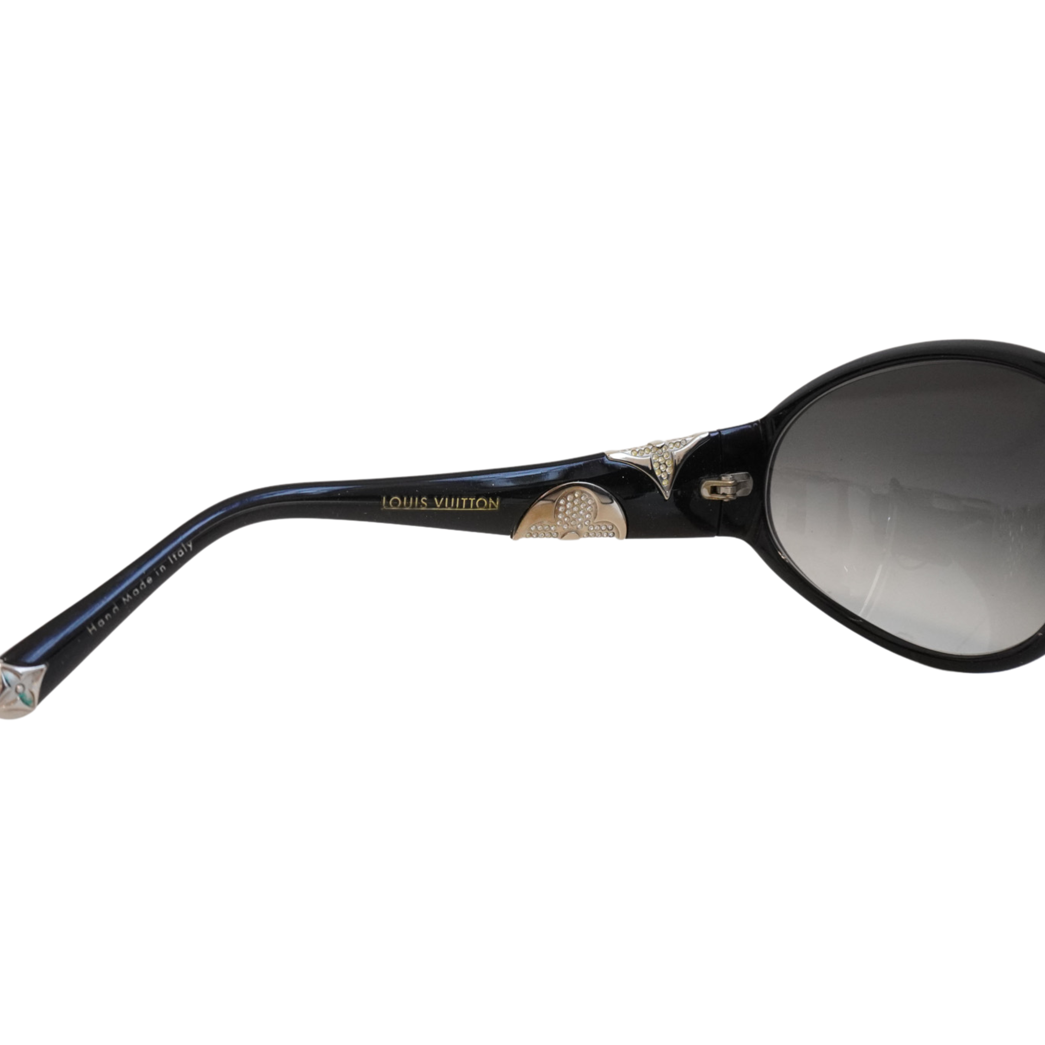 Louis Vuitton 'Iris' sunglasses in black glitter acetate with a rounded down-turned lens and silver rhinestone 'LV fleur' embellishments on the arms.