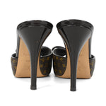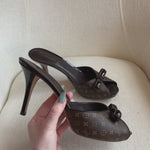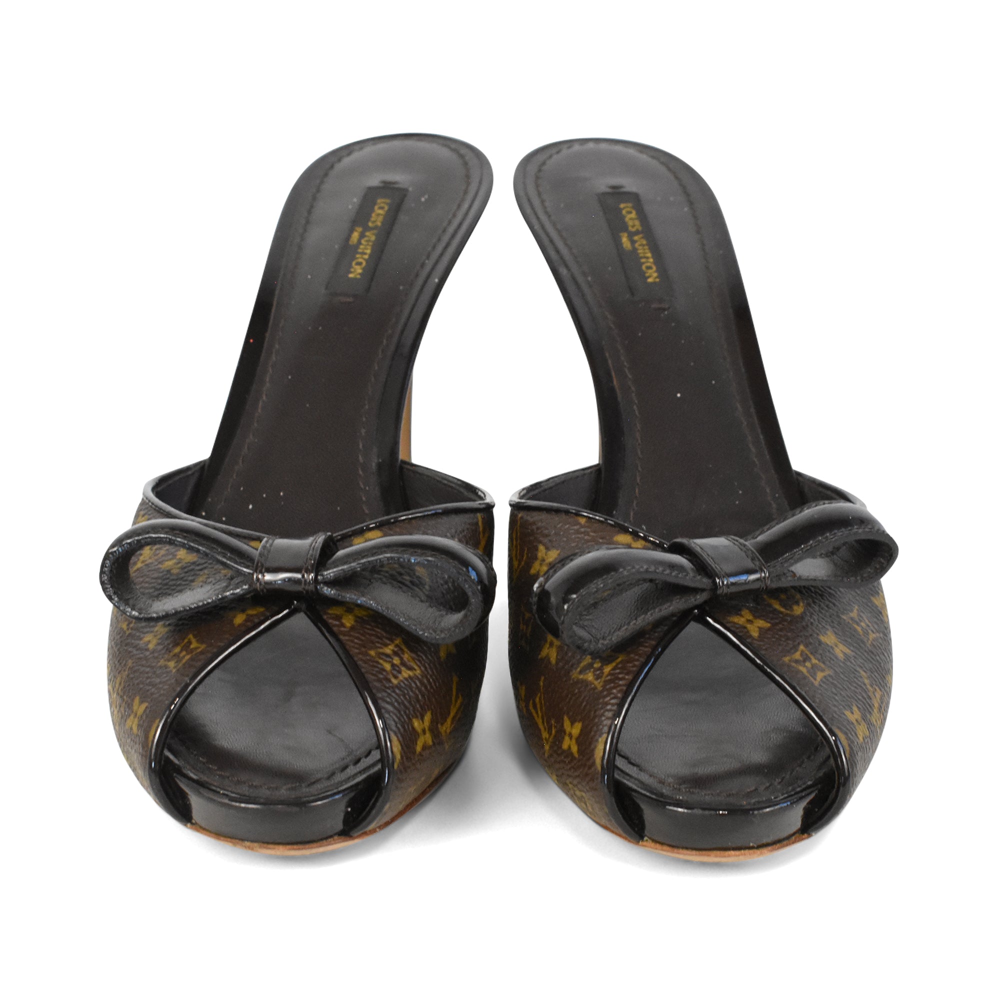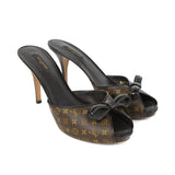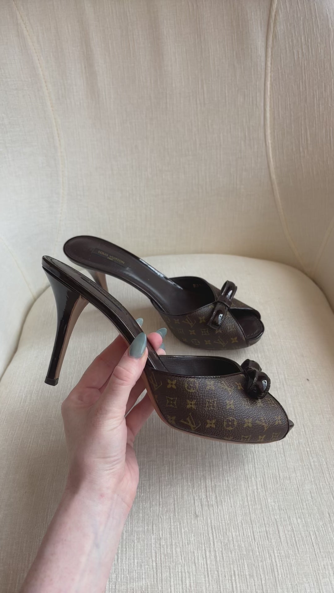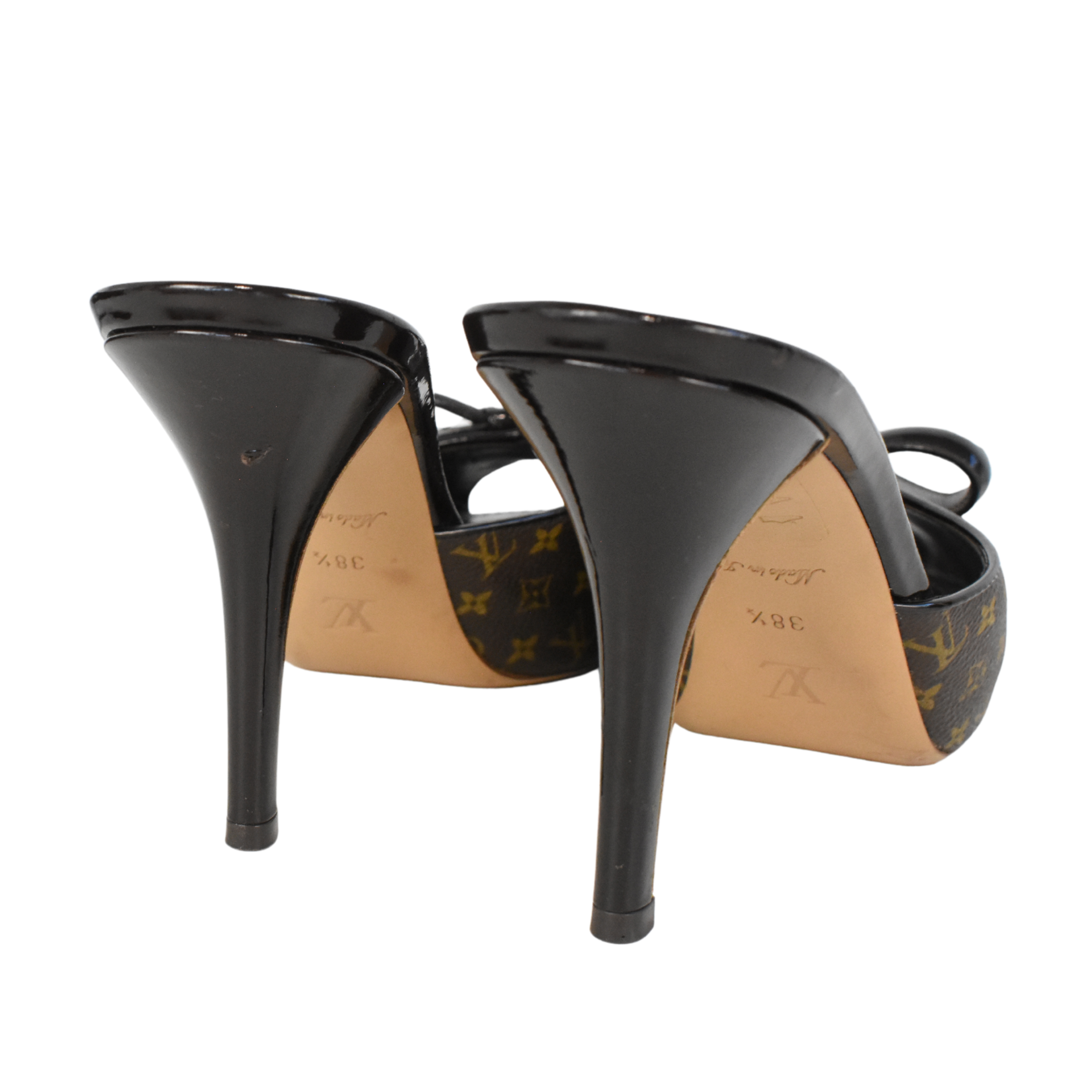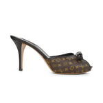 Louis Vuitton 'Malibu' peep-toe heels in brown monogram coated canvas with brown patent leather trim and a patent bow on the toes.