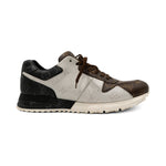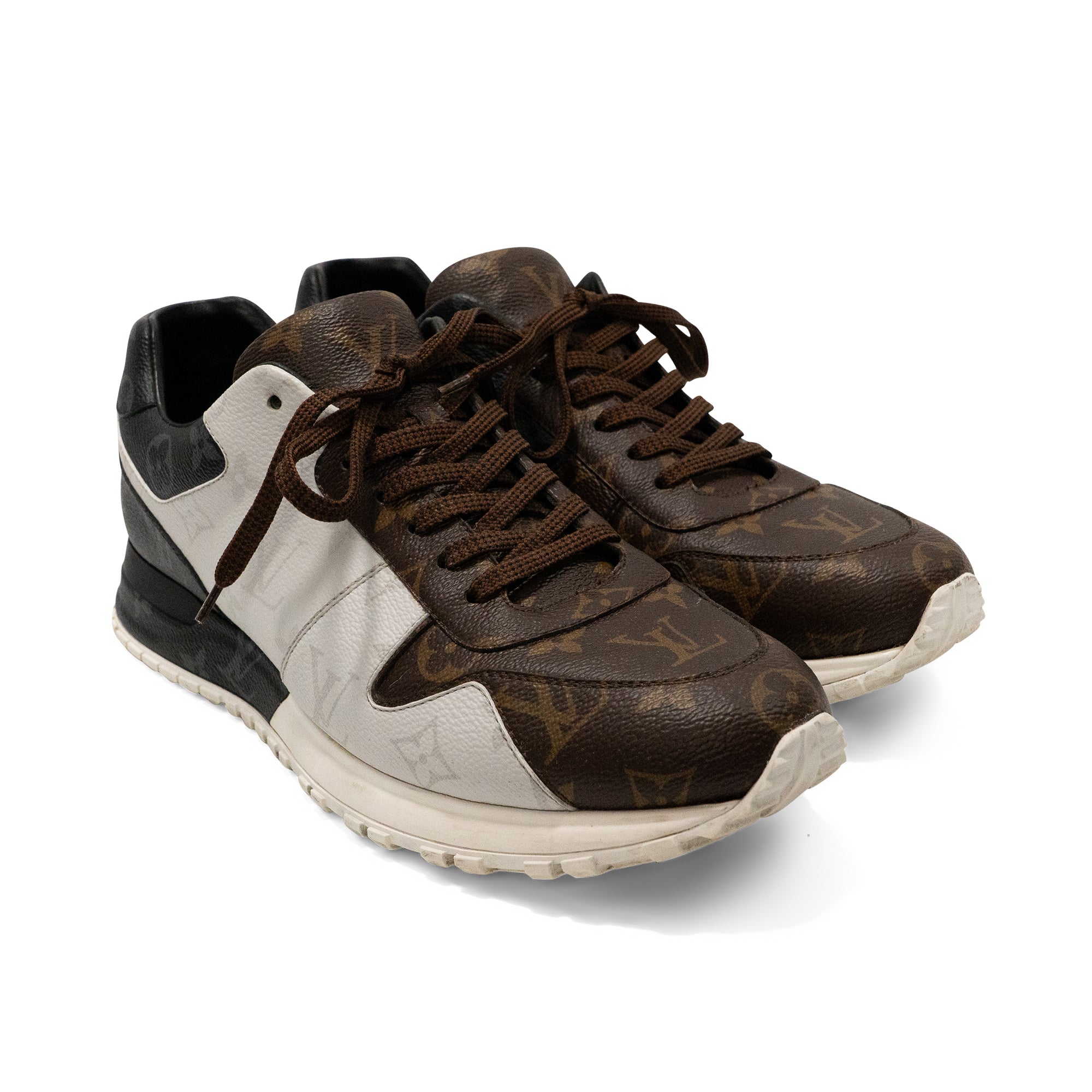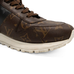 Louis Vuitton 'Run Away' low top sneakers in brown, black and off white monogram panelled coated canvas with brown flat laces and thick sole.