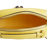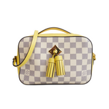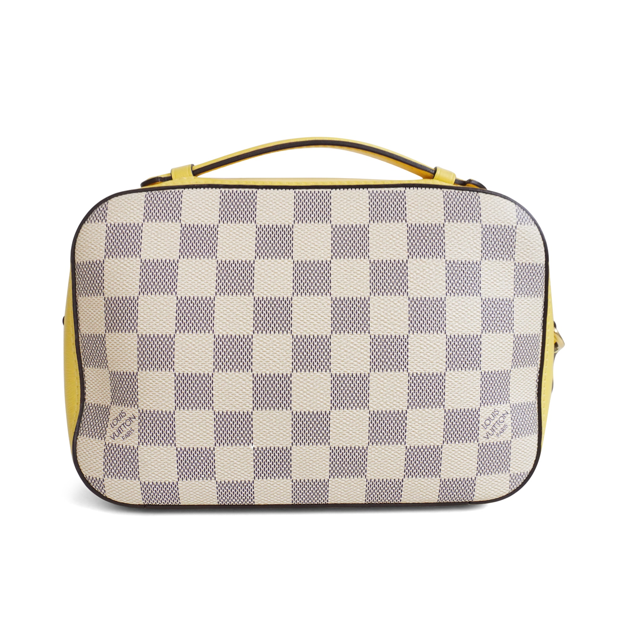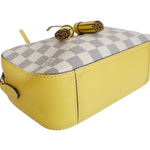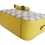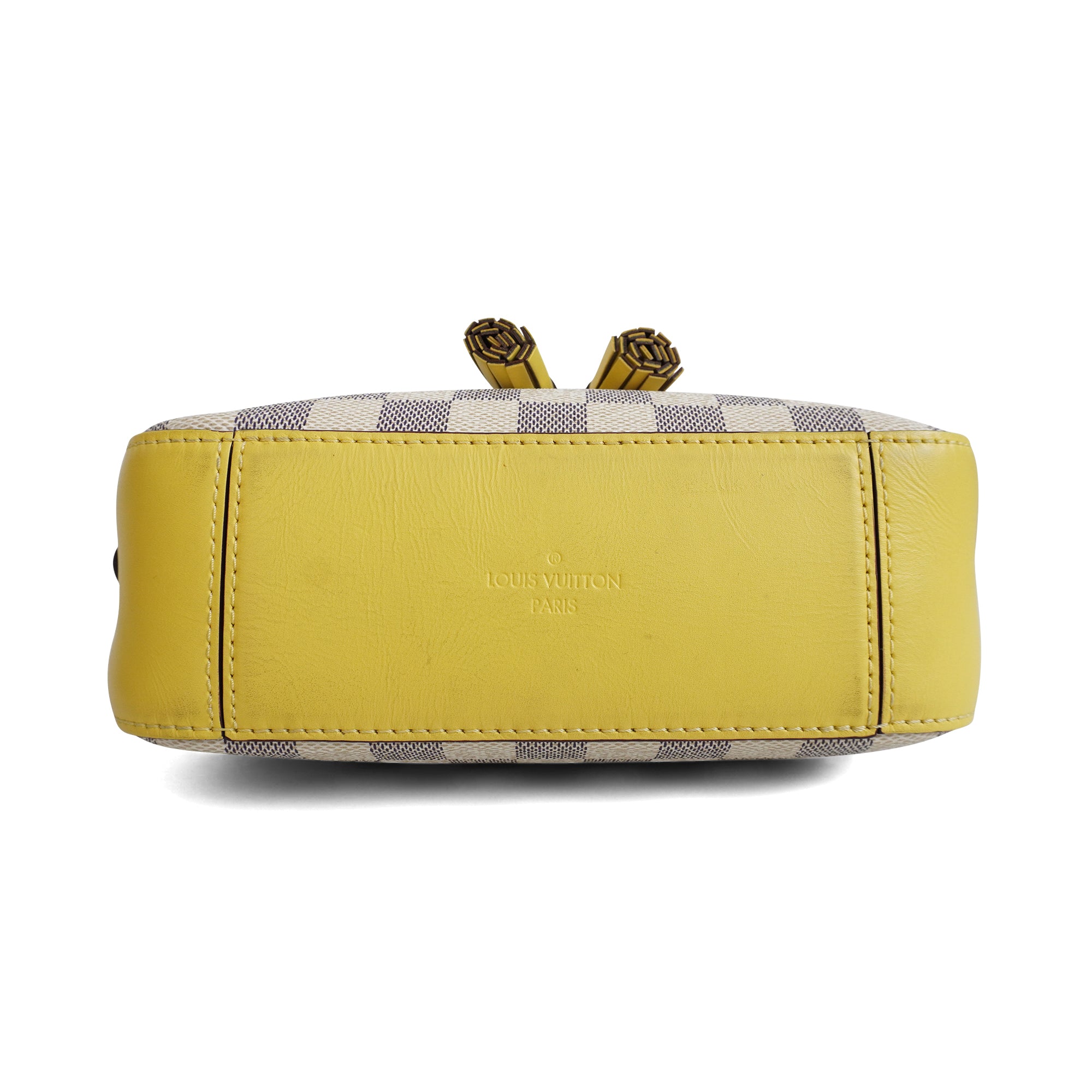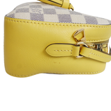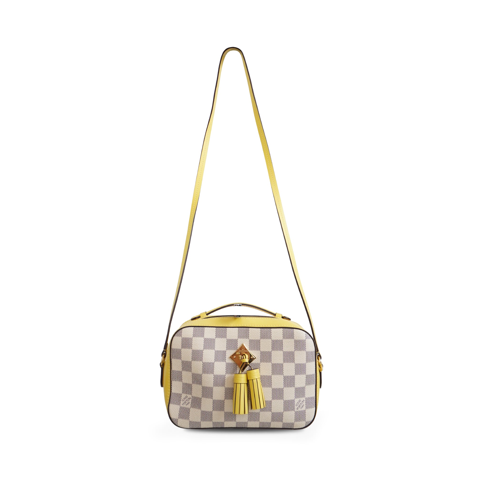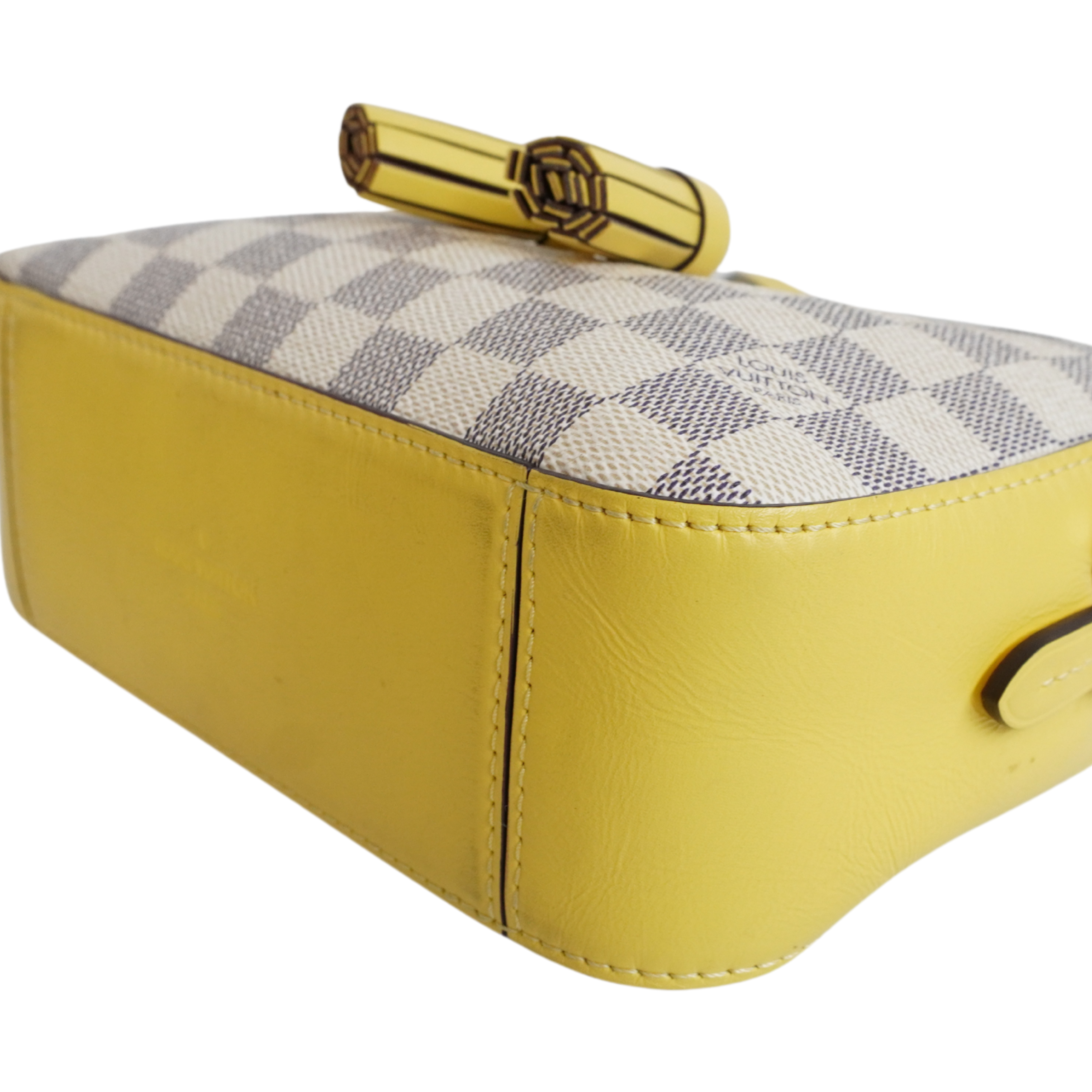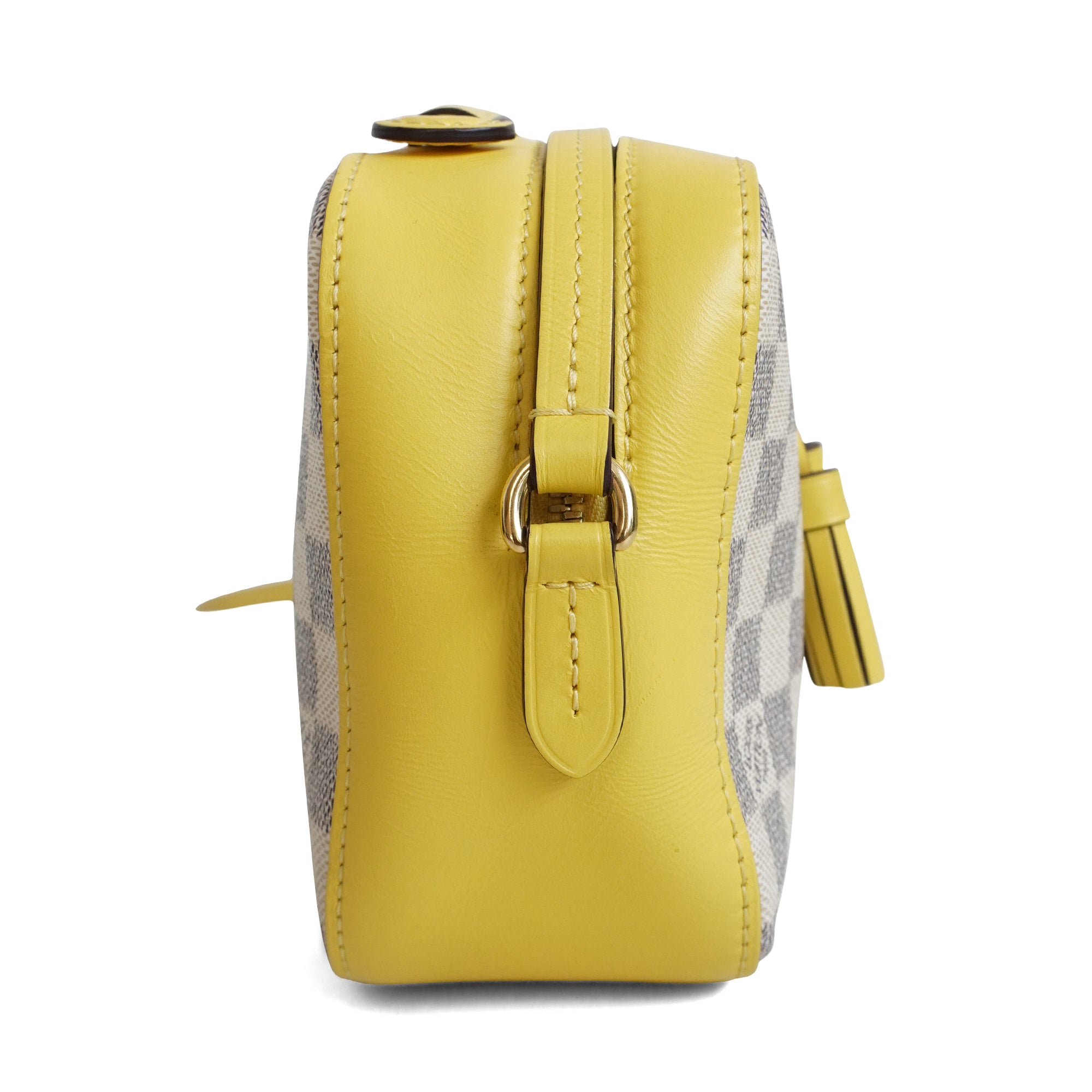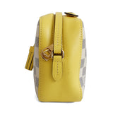 Louis Vuitton 'Saintonge' camera bag in damier azur coated canvas with yellow leather accents and a gold logo plaque with two leather tassels. The bag has a retractable top handle in addition to a leather crossbody strap. Features a two-way zipper closure and yellow fabric lining with interior slip pocket.