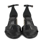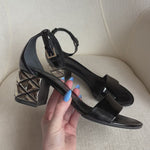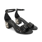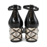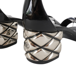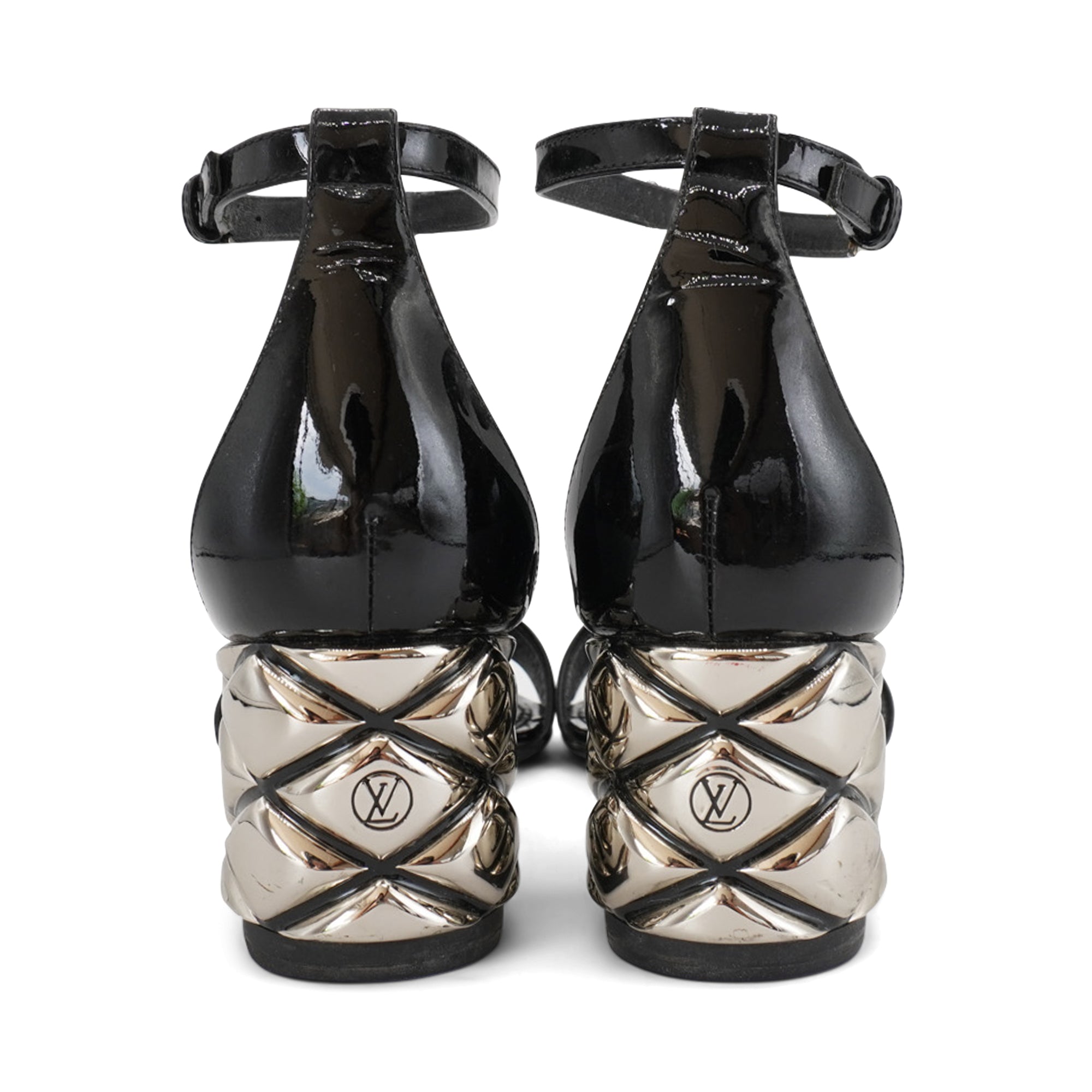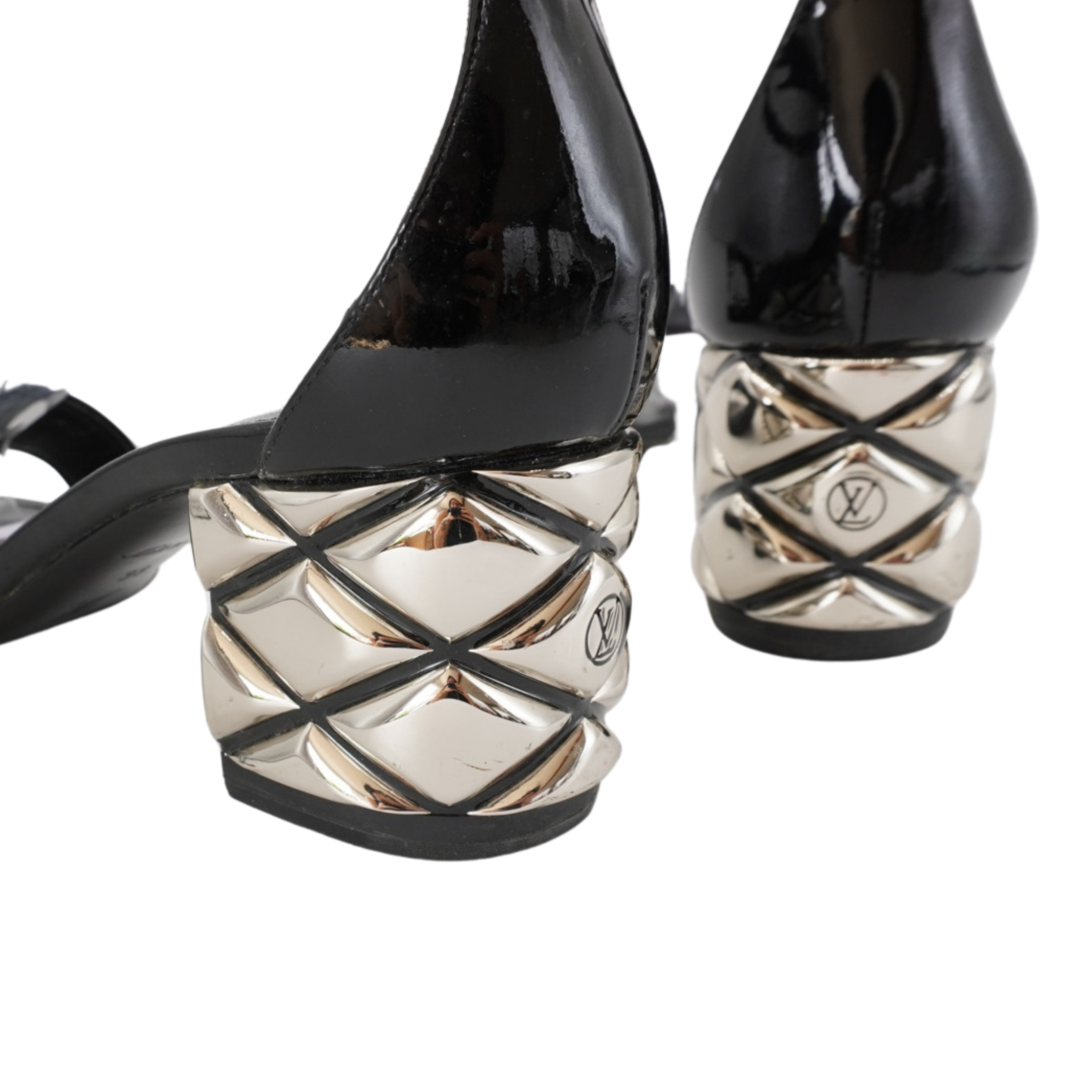 Louis Vuitton 'Silver Light' sandals in black patent leather with a silver quilted metal heel.