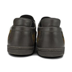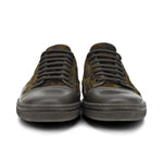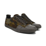 Louis Vuitton low-top sneakers in brown leather with army green camouflage suede. Features green elastic panels around the ankles, a brown heel tab, and brown flat laces.