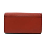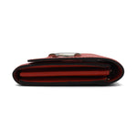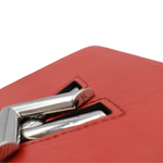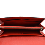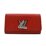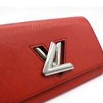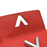 Louis Vuitton 'Twist' flap wallet in red epi leather with silver LV turnlock closure. The interior is lined with red taiga leather and features 12 card slots, one slip pocket, and a centre zip pocket.