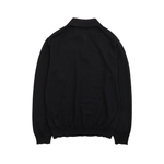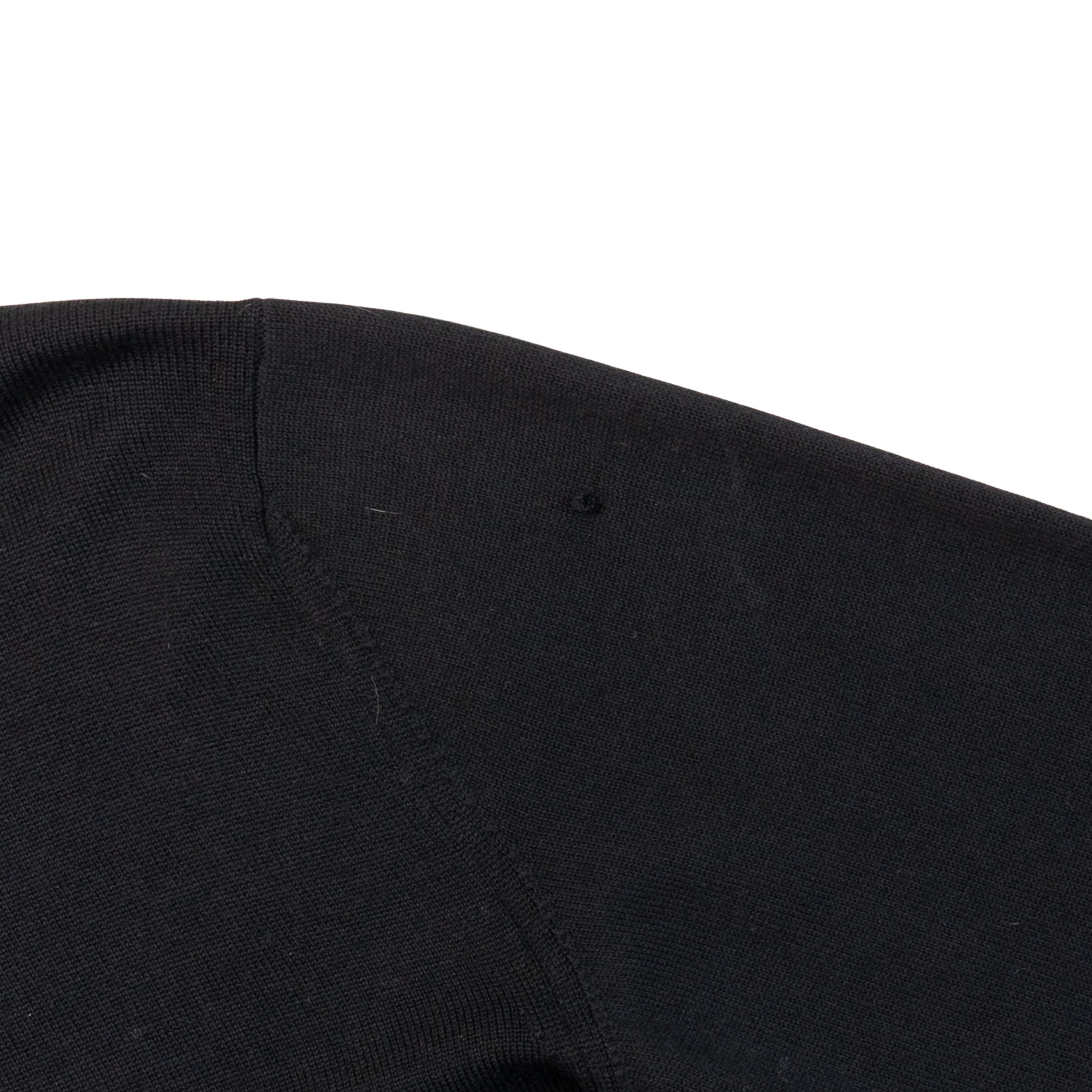Louis Vuitton 'Virgil Homage Dove' black wool polo with a light blue, intarsia knit peace dove graphic on front to commemorate Virgil Abloh. Features three white mother of pearl buttons down front, a small spread collar, ribbed cuffs at wrists and bottom hem, and a small light blue 'LV' logo near the hem.