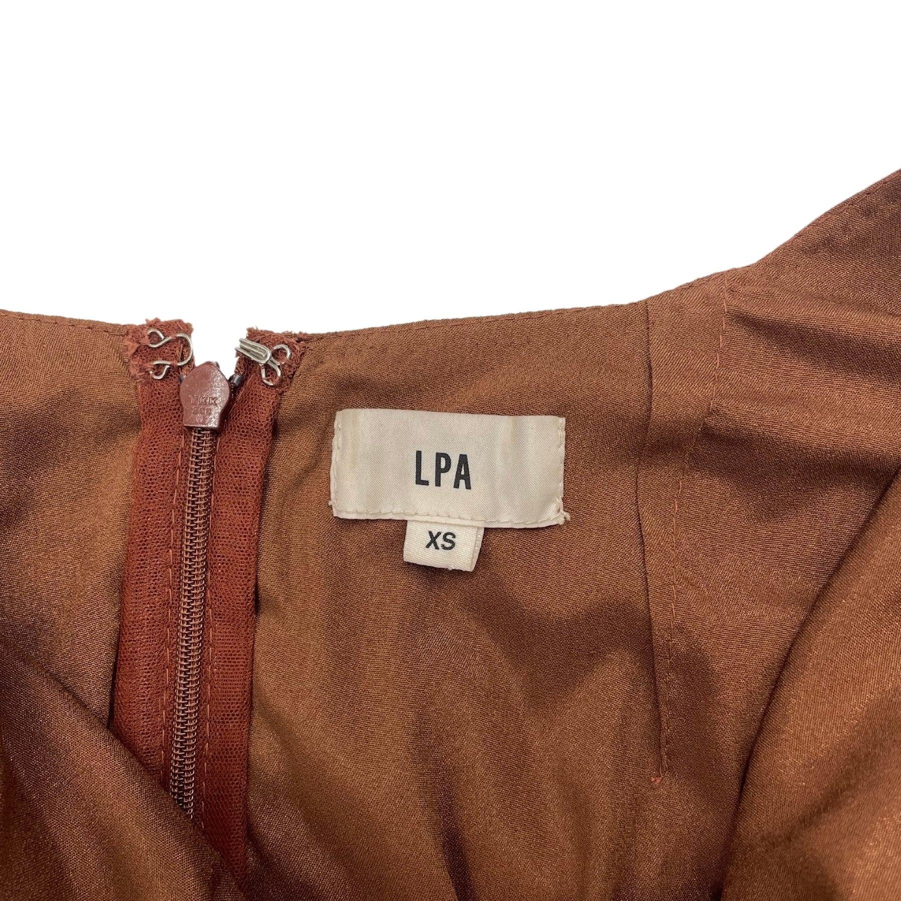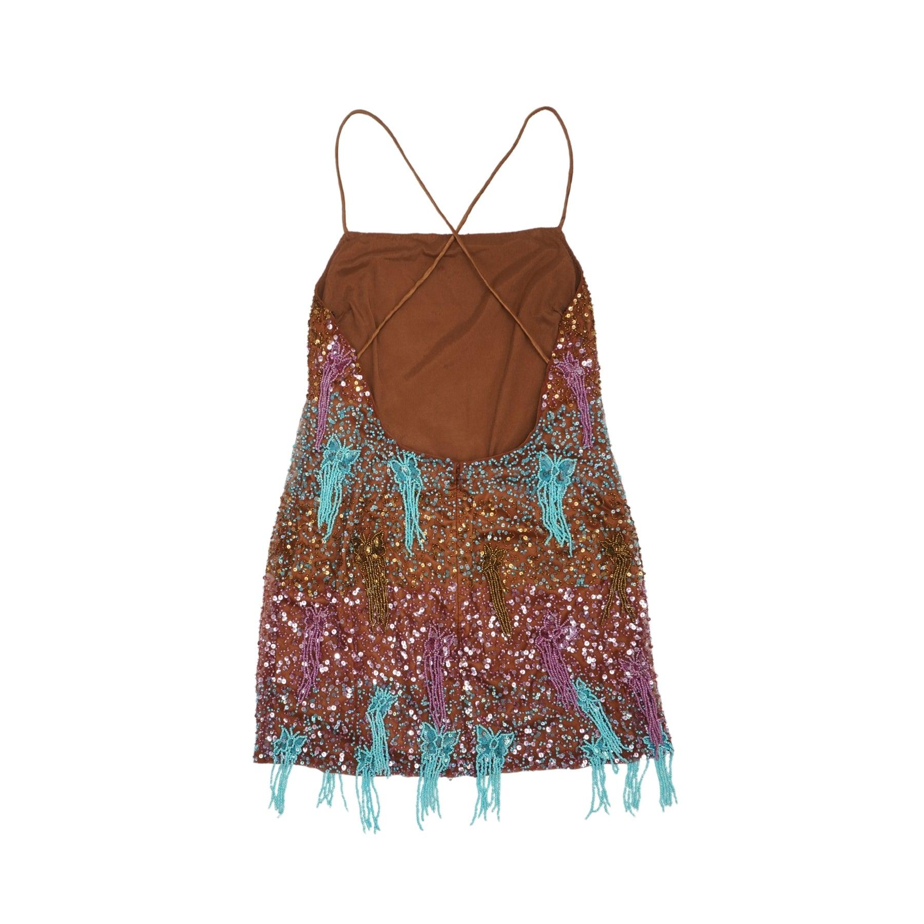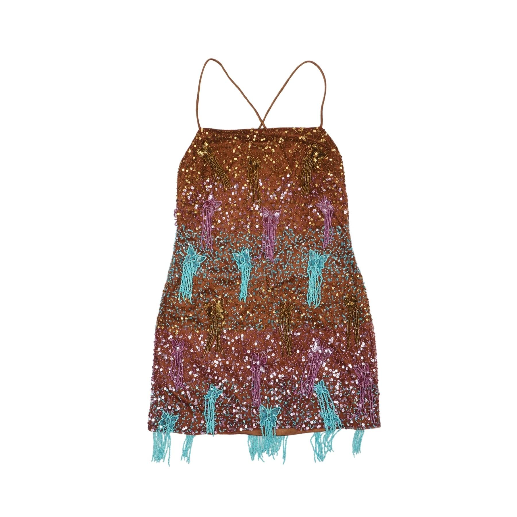 LPA mini dress in brown satin with a beaded mesh overlay with blue, purple and bronze beads and sequins and fringe butterfly appliqués.