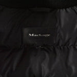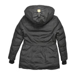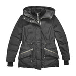 Mackage nylon parka jacket in black. Features a double layered zip, button closure, hood, drawstring at waist, and leather trim detailing.