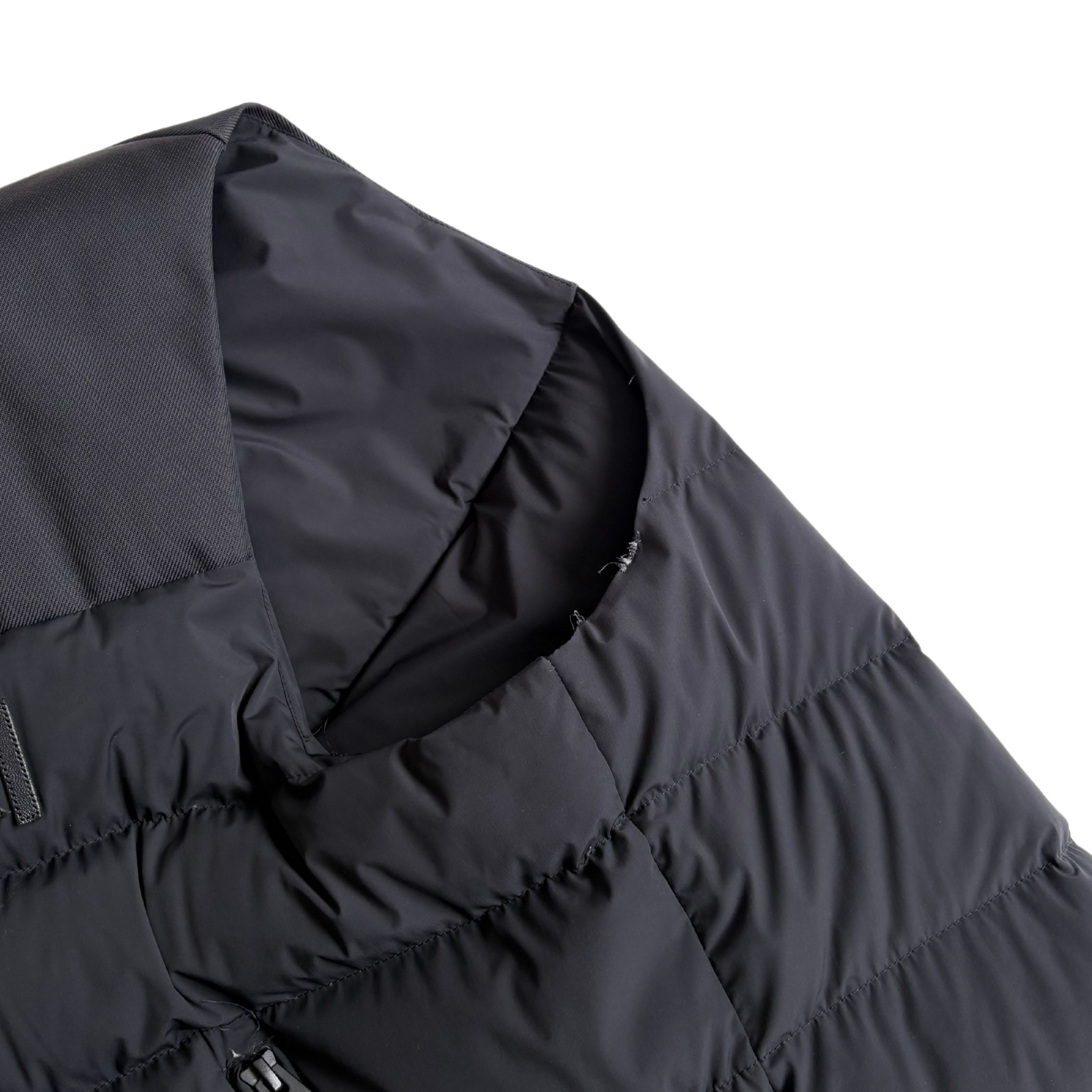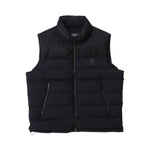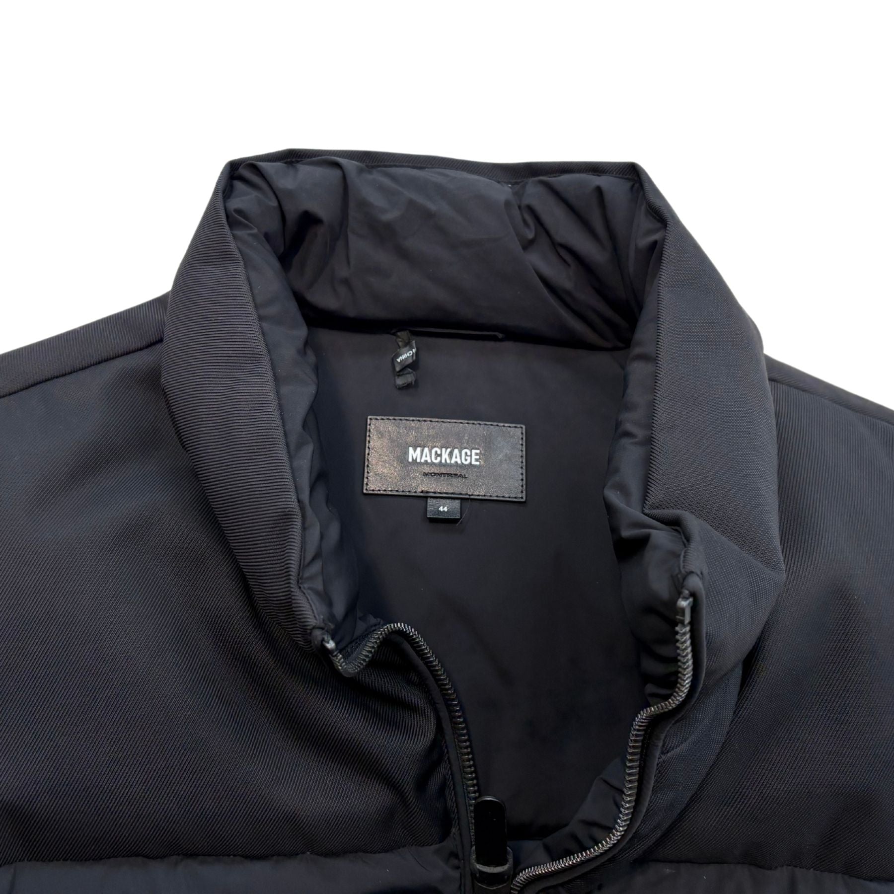 Mackage puffer vest in black nylon with a woven nylon front and back top yoke. Featuring a black 'M' Logo on the chest front in black leather.