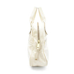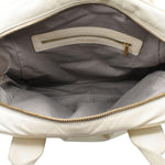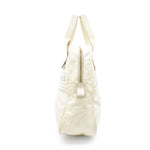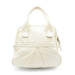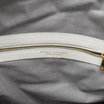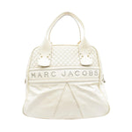 Marc Jacobs Tote Bag in cream leather with a grommets logo in silver hardware, quilted panel and pleated detailing. Features dual top handles, top zip closure in gold hardware and inner grey canvas lining with an inner zip pocket.