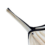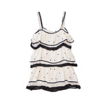 Marc Jacobs tiered ruffle mini dress in white silk with embroidered navy polka dots., navy ribbon trim, and gold chain link detail within the trim.