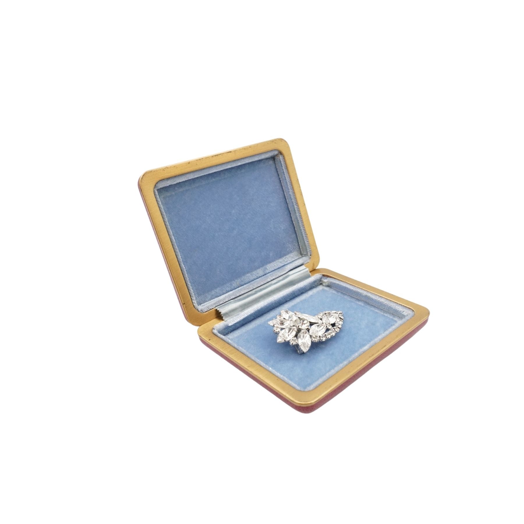 Margaret Row 'Diamontage' ornate leaf brooch in silver-tone hardware. Includes a red leather box.