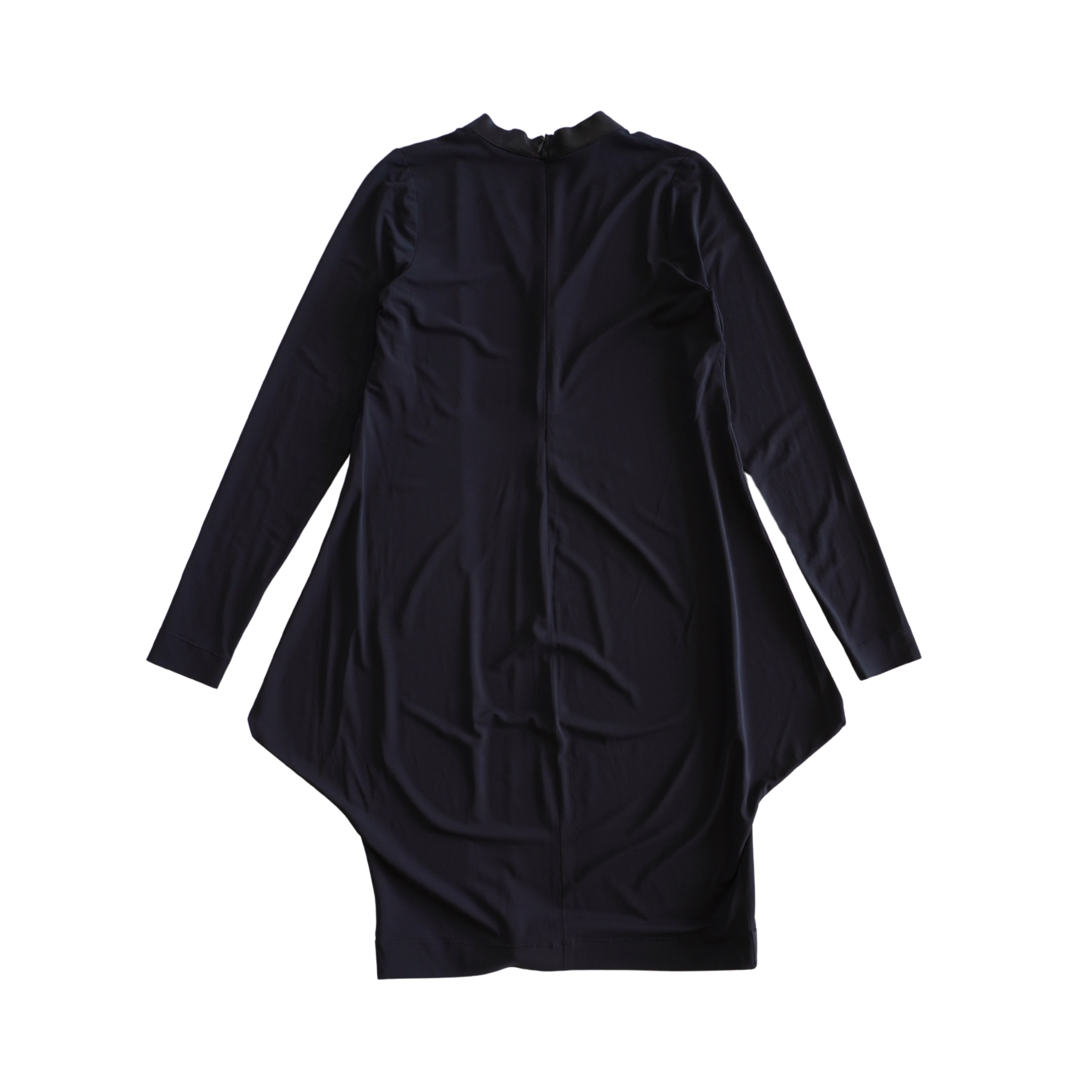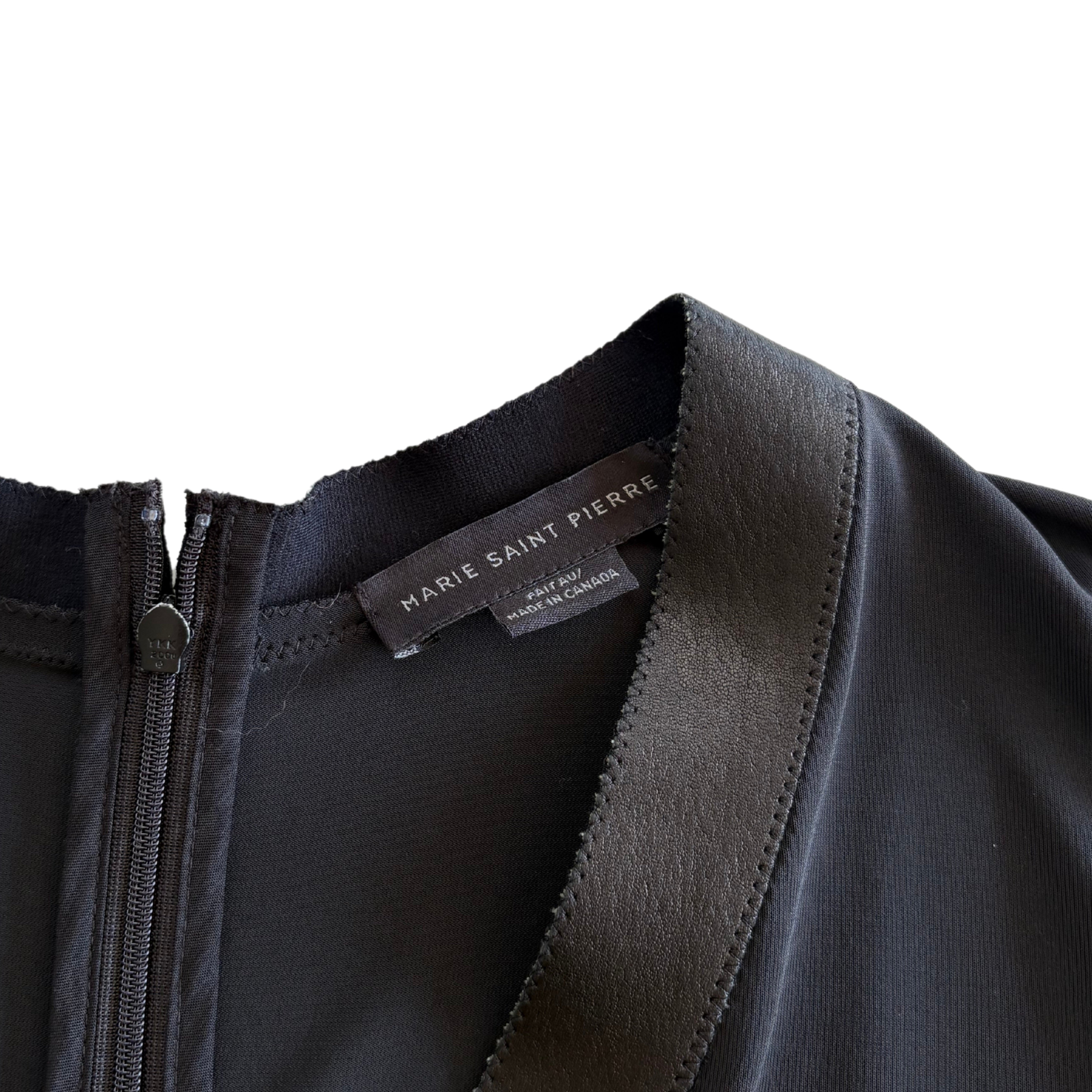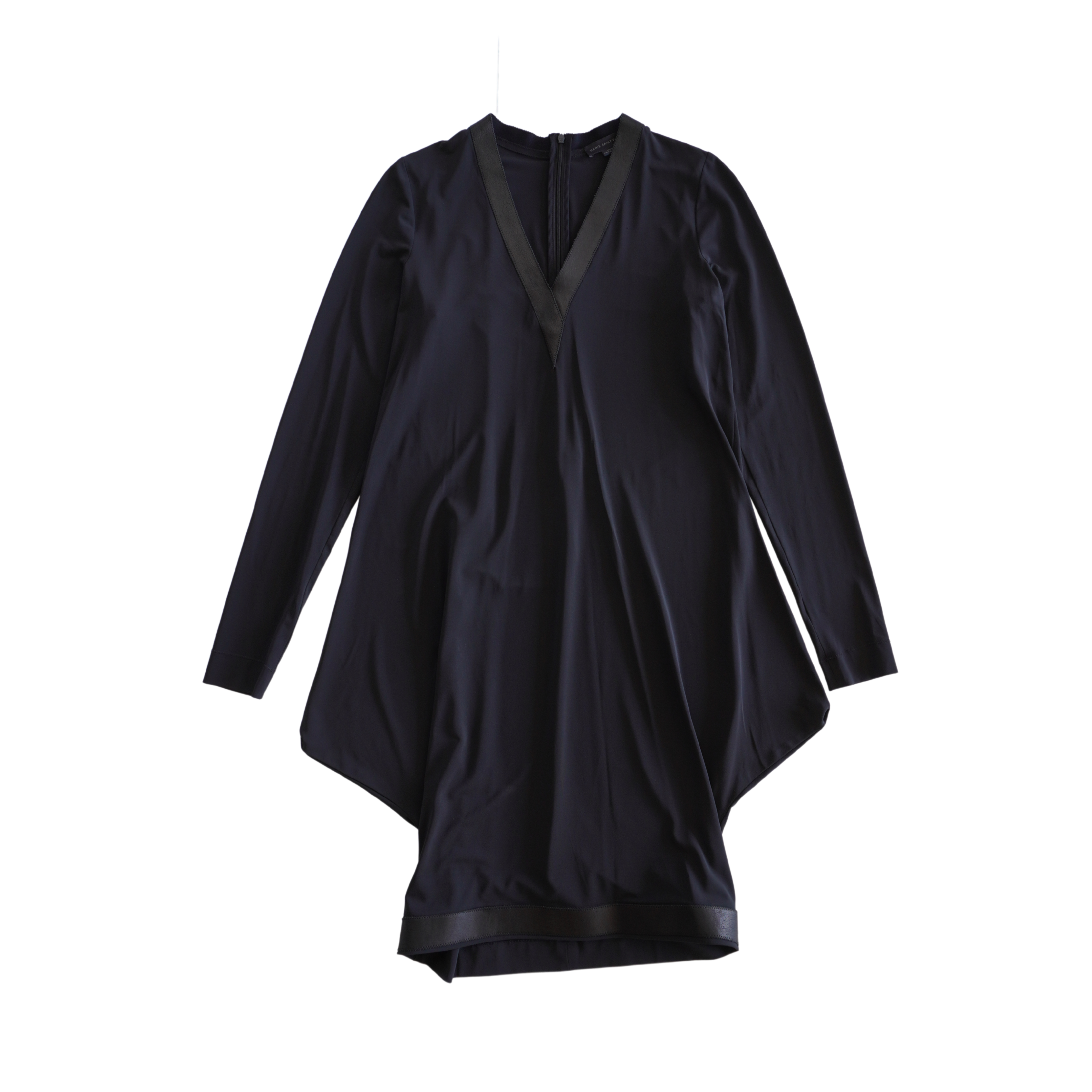 Marie Saint Pierre long-sleeve shift dress in black with an asymmetrical hem, a v-neckline, and a black leather trim at the collar and hem.