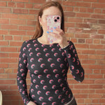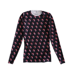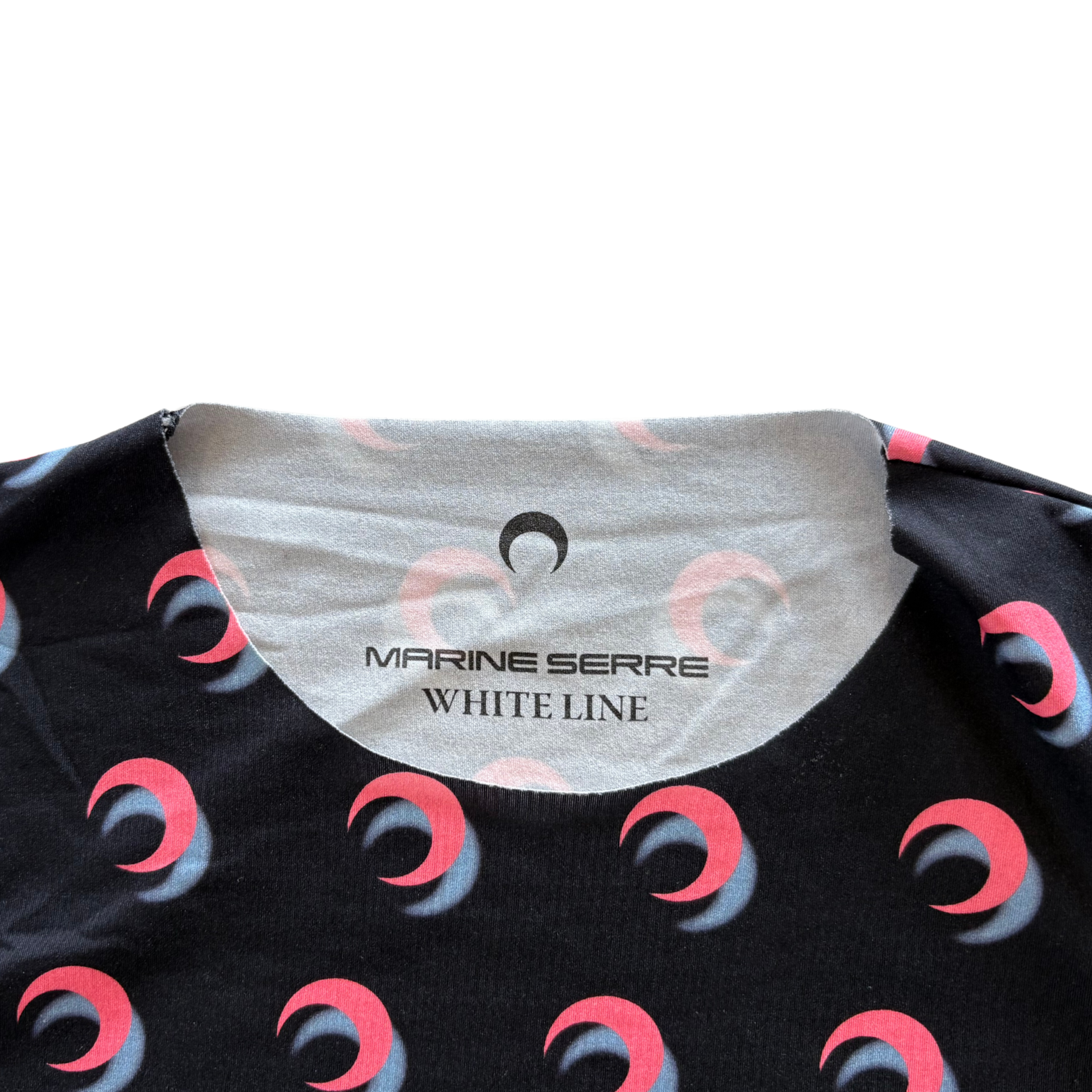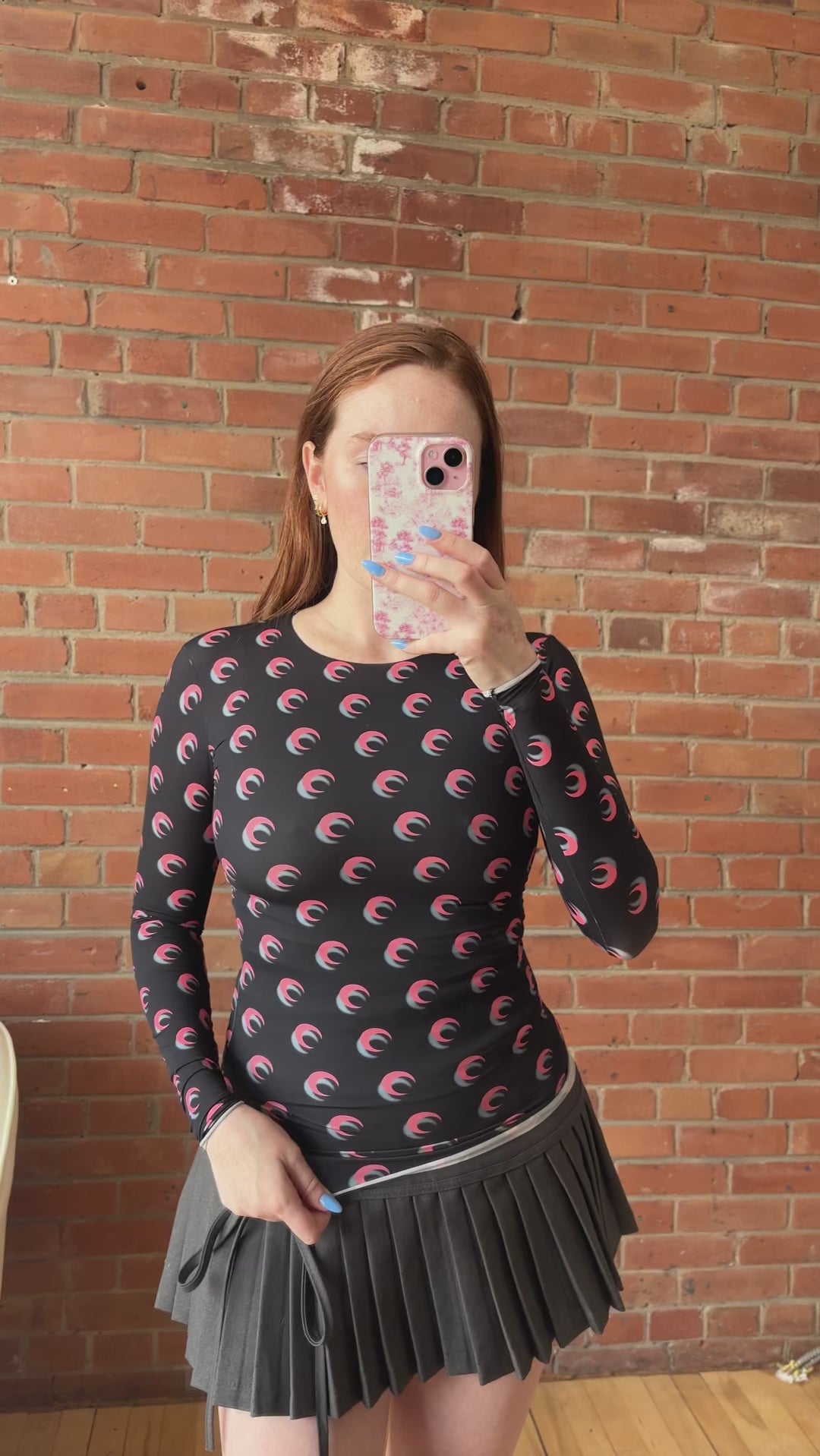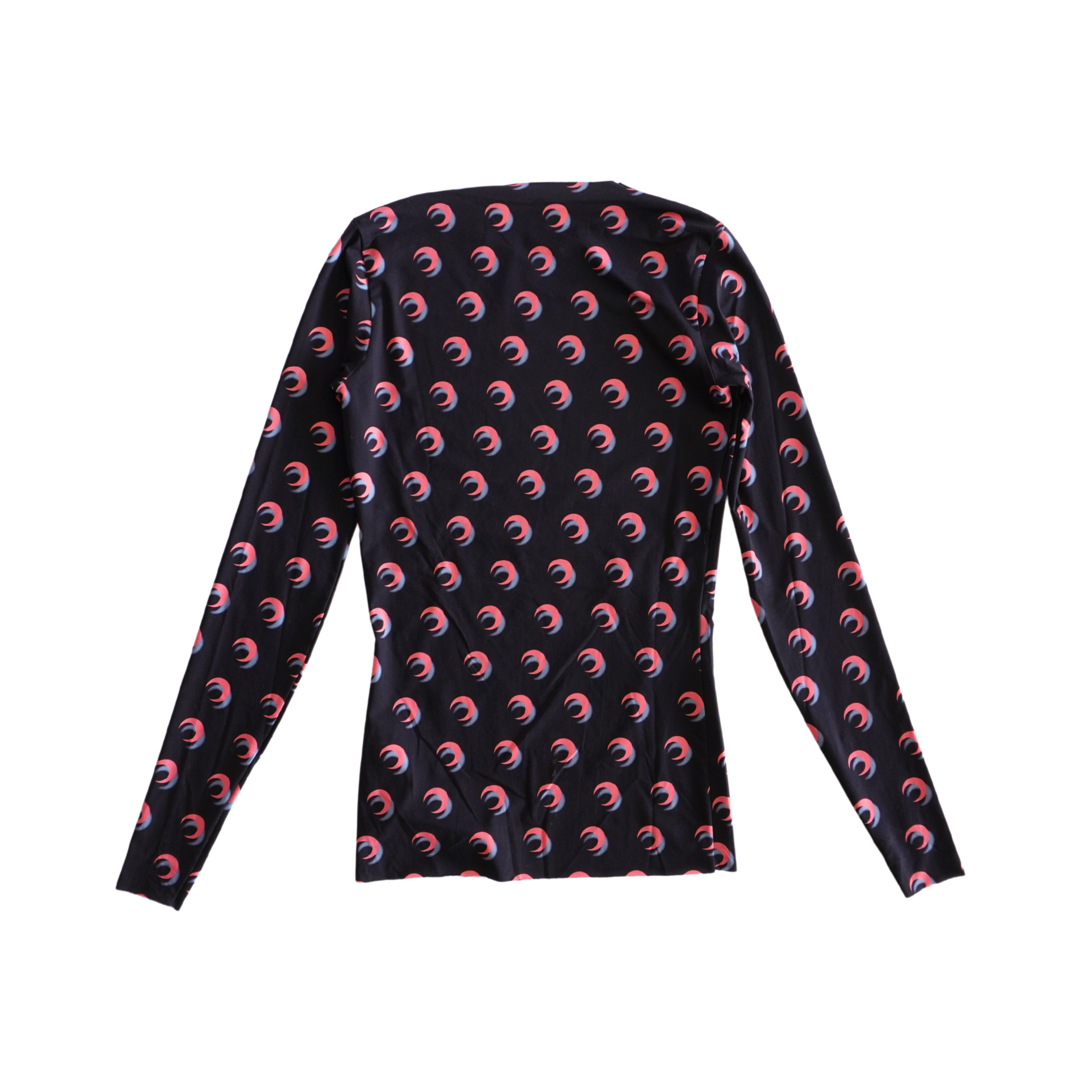 Marine Serre long-sleeve jersey top in black stretch poly with an all-over pink and blue signature moon print.