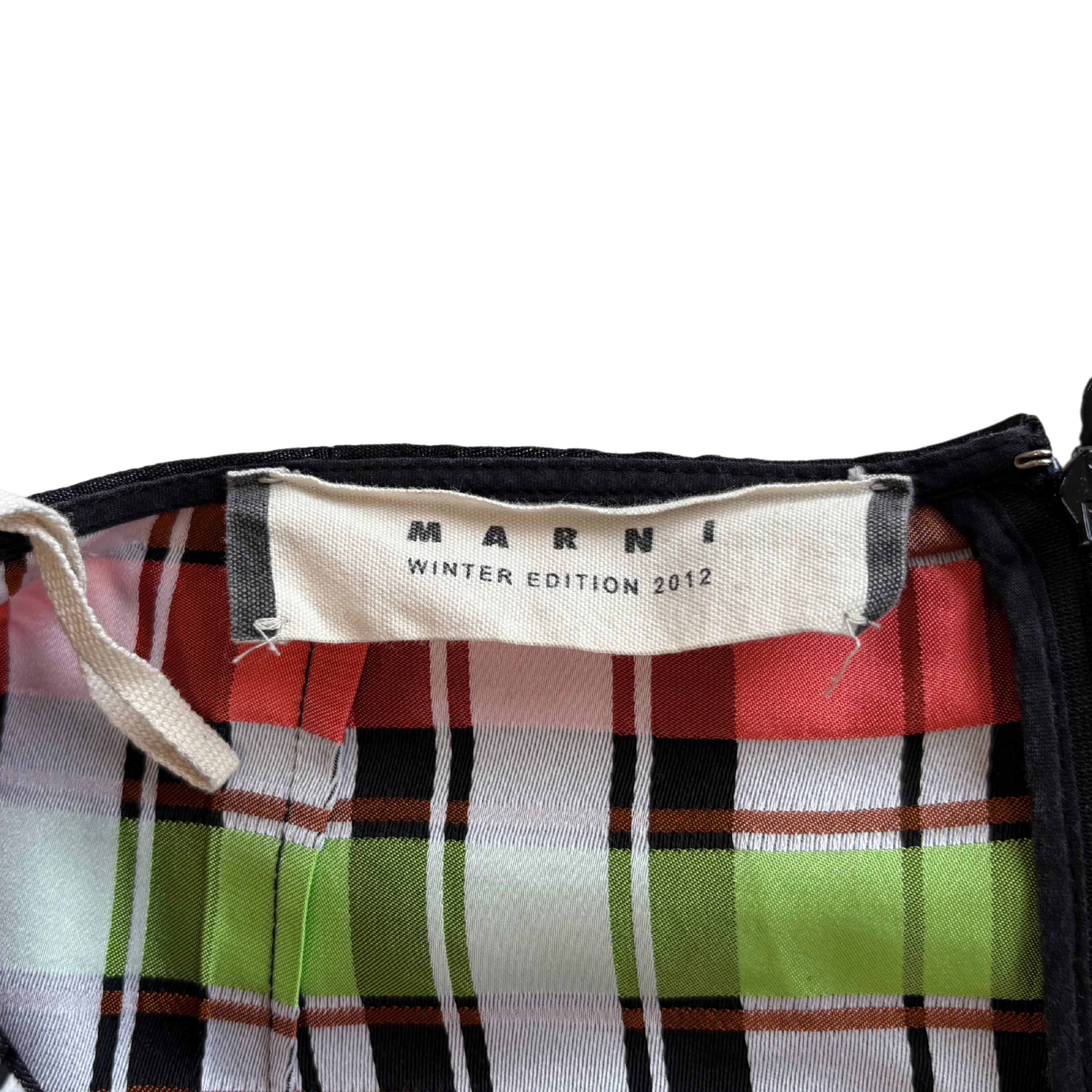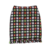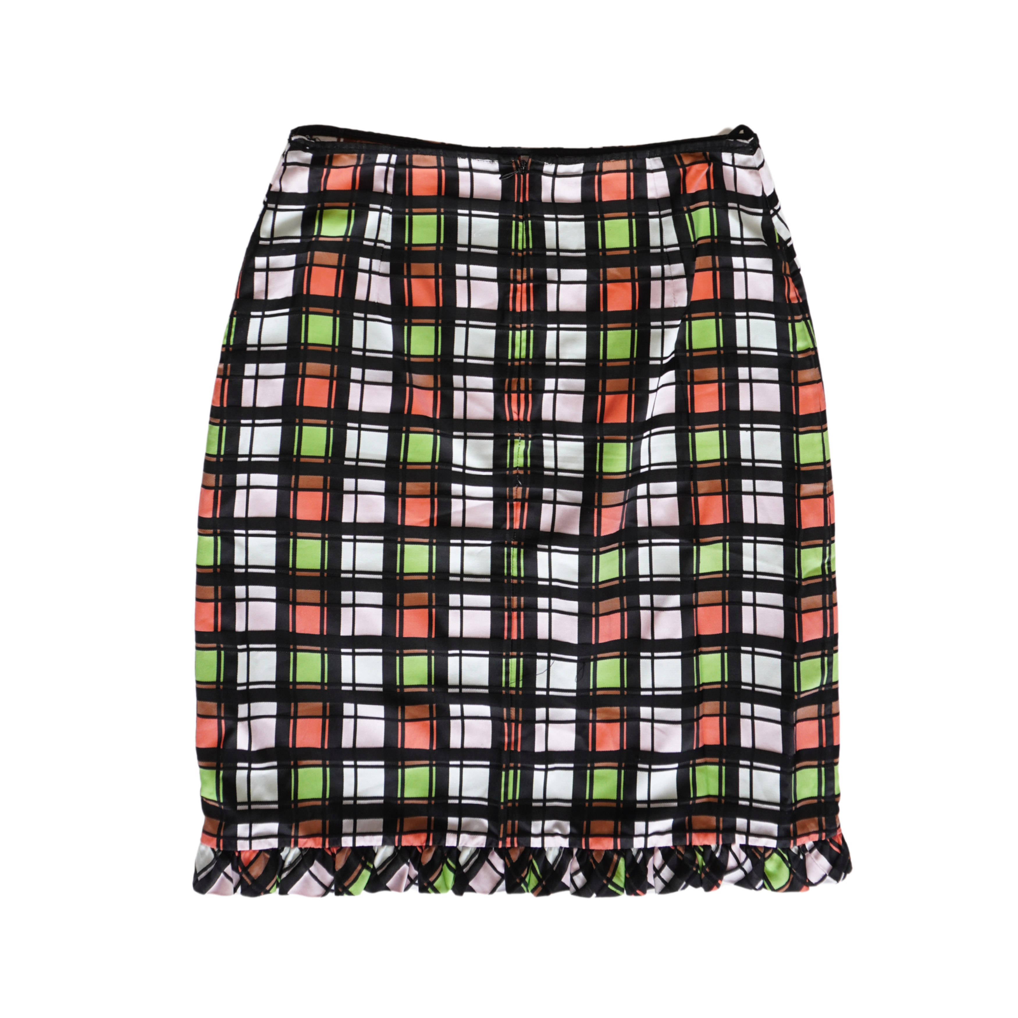 Marni pencil skirt in a green, white, salmon multicolour checkered print with a frill hem trim and invisible zipper closure.