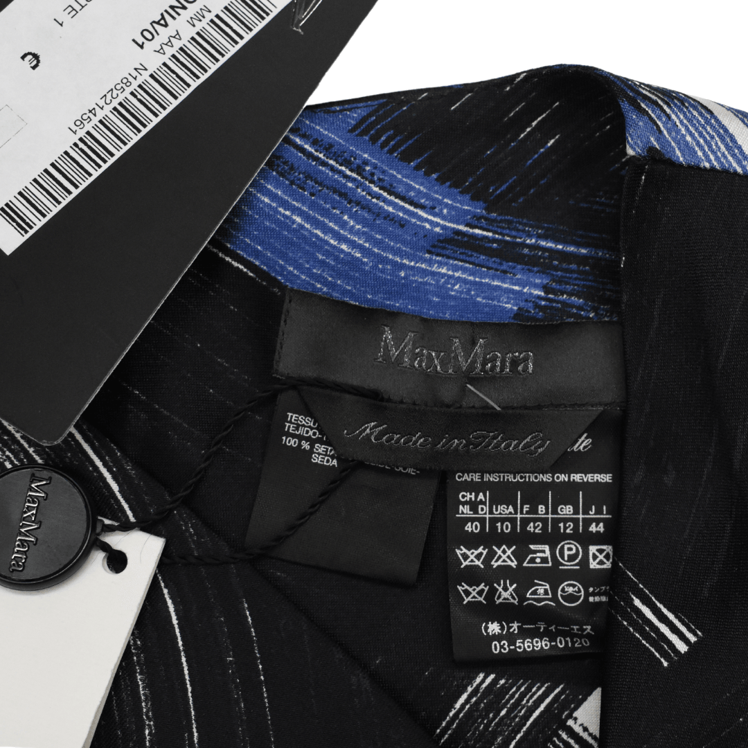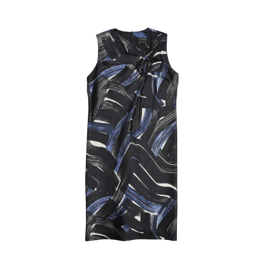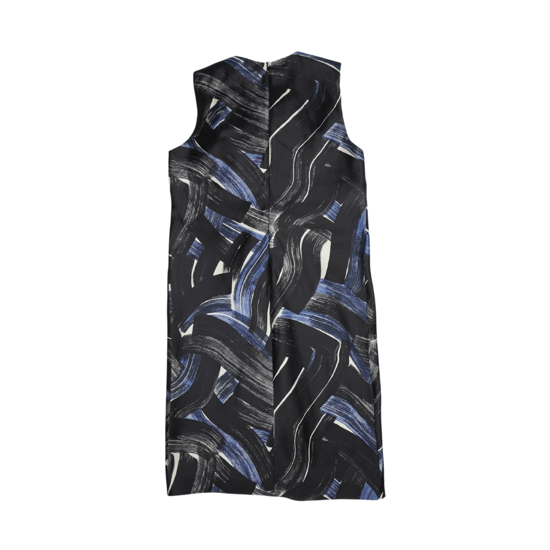 Max Mara shift dress in black silk with a blue and white brush strokes print. Features a knot detail on the collar and an invisible back zip closure.