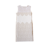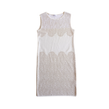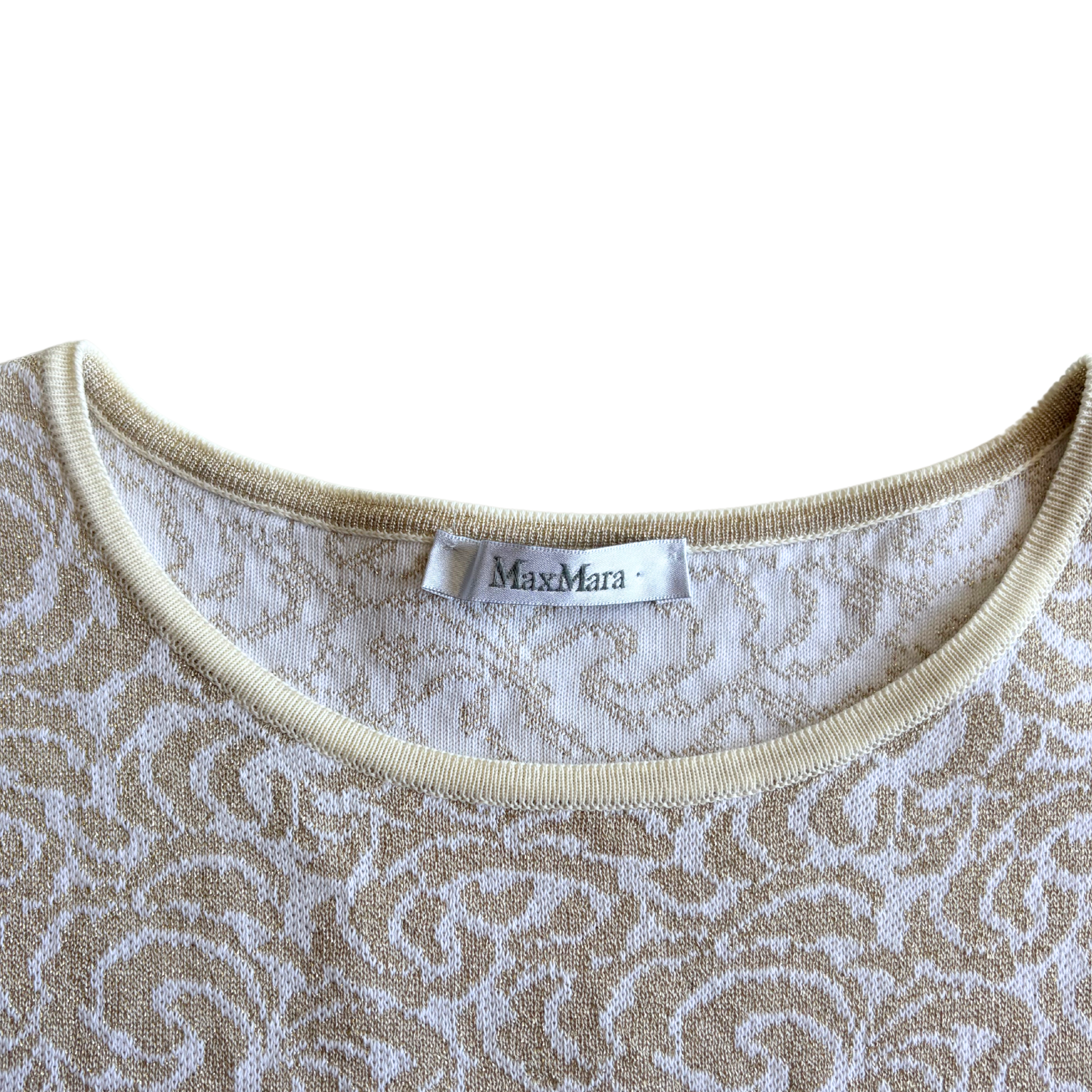 Max Mara fitted dress in cream, white and metallic gold knit cotton blend with a jacquard weave floral print.