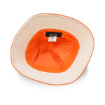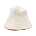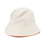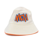 MCM bucket hat in white canvas with orange piping and orange and blue embroidered graphic logo.