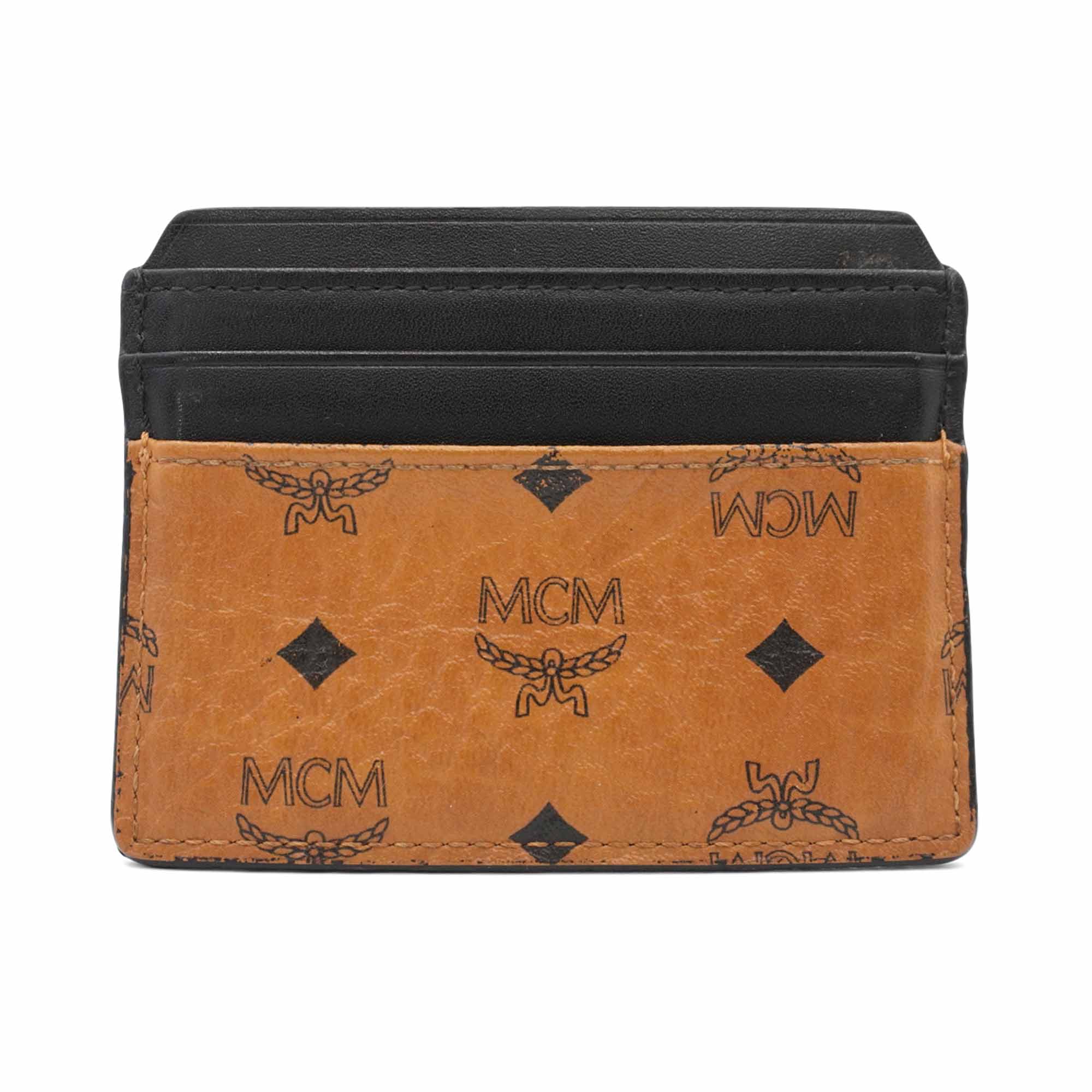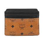 MCM cardholder wallet in brown monogram printed coated canvas with black leather card slots.