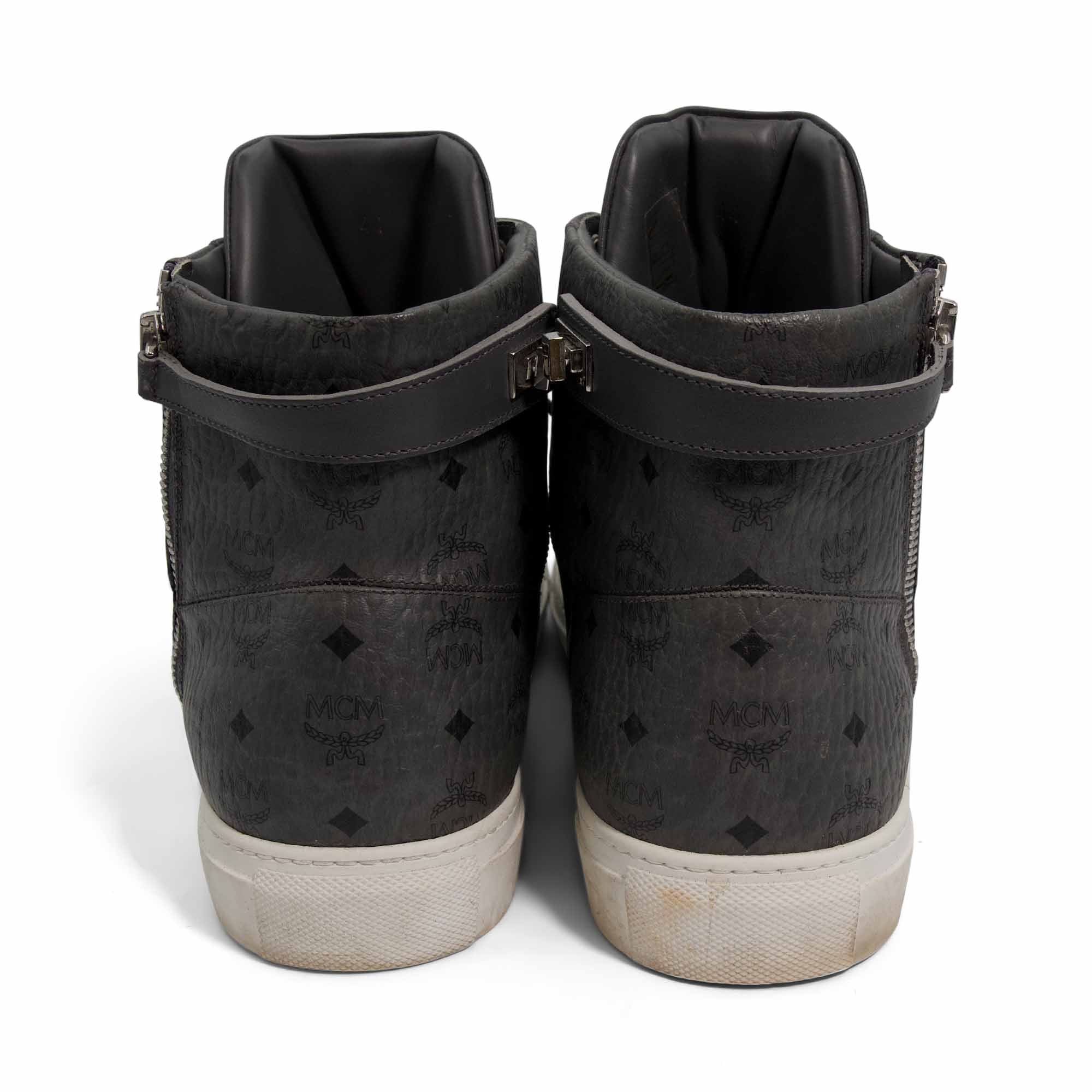 MCM high-top sneakers in grey monogram printed coated canvas with silver zip details on the sides, a turn-lock at the back, and white rubber soles.