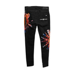 Amiri Skinny Jeans in black cotton with red, blue and orange tie dye detailing. Features front zip closure in silver hardware and white embroidered logo on the back pocket.
