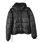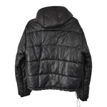McQ by Alexander McQueen black quilted leather puffer jacket with an insulated hood and zipper down the front with wind flap that snaps down.