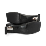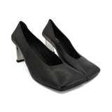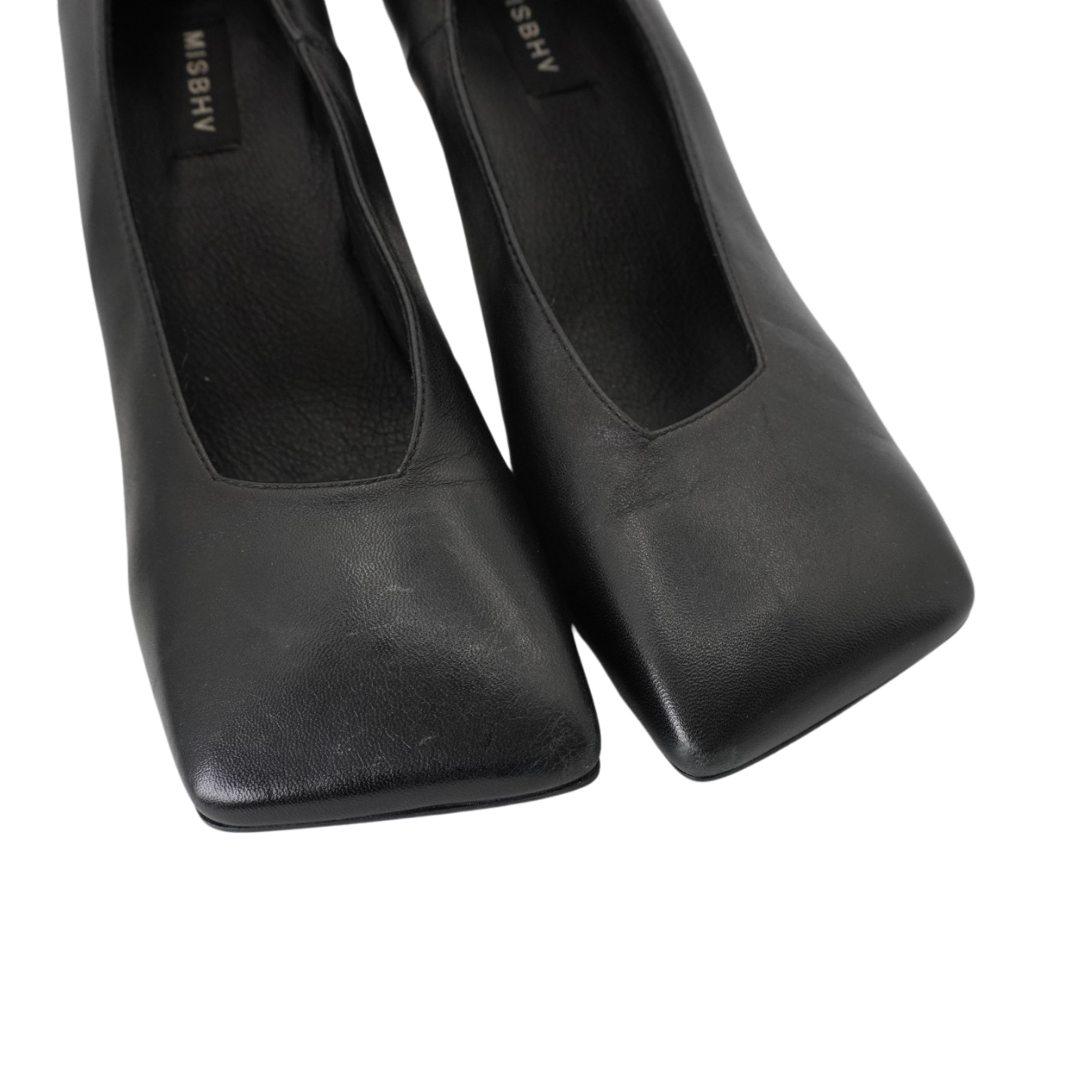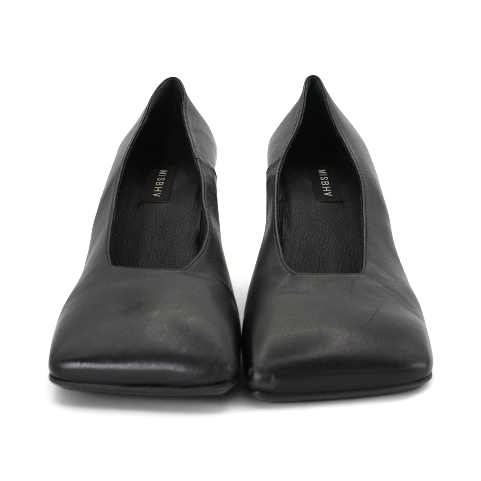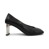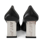 Misbhv 'Metal Bar' square toe pumps in smooth black leather with logo engraved silver metal heels.