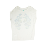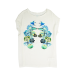 Missoni tunic top in cream silk with a lightweight knit linen back panel and a blue, green and yellow fish graphic on the chest.