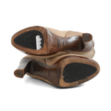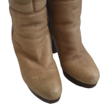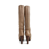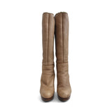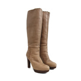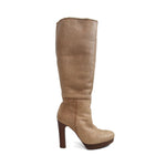 Miu Miu knee-high boots in light beige-brown sheepskin leather with a shearling lining, a stacked wooden heel, and an almond toe.