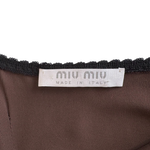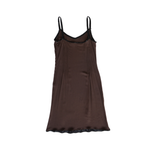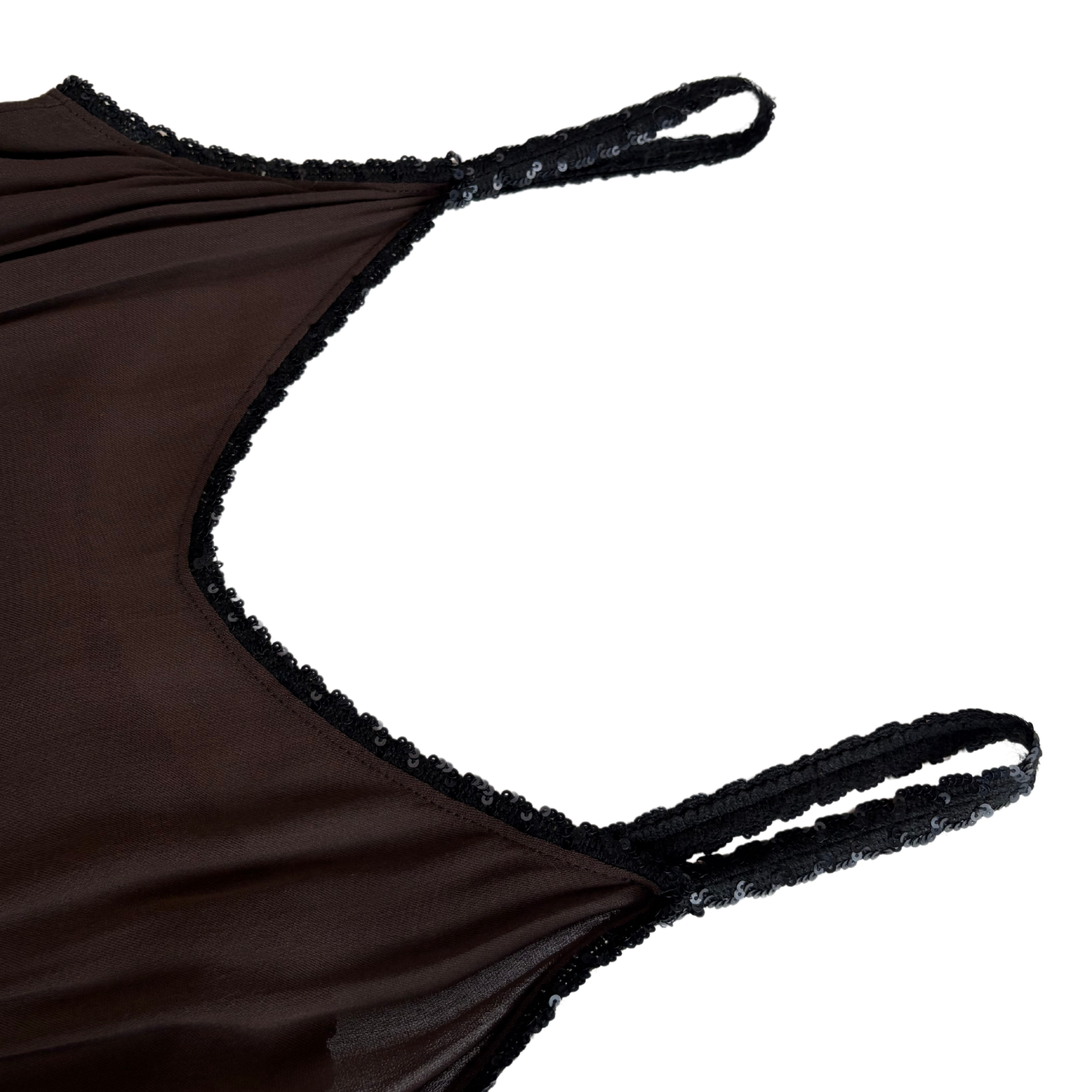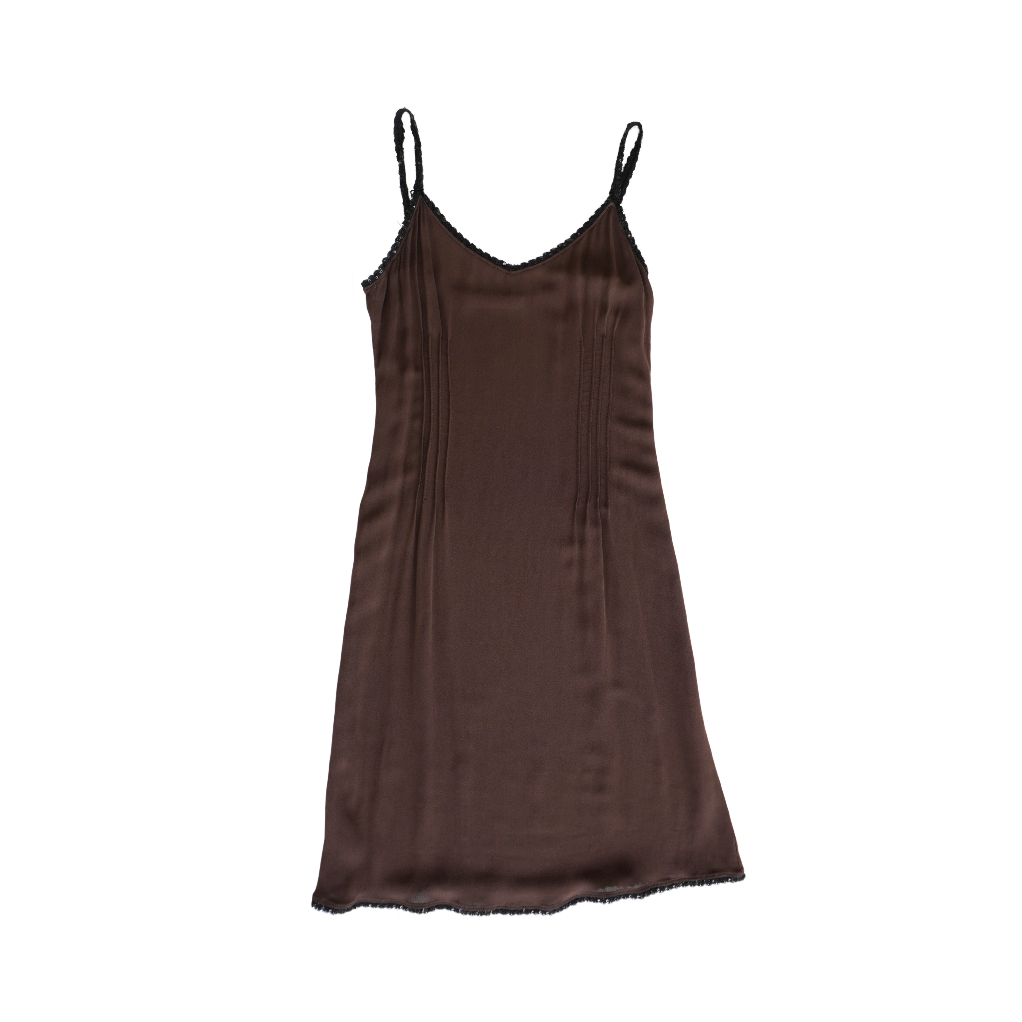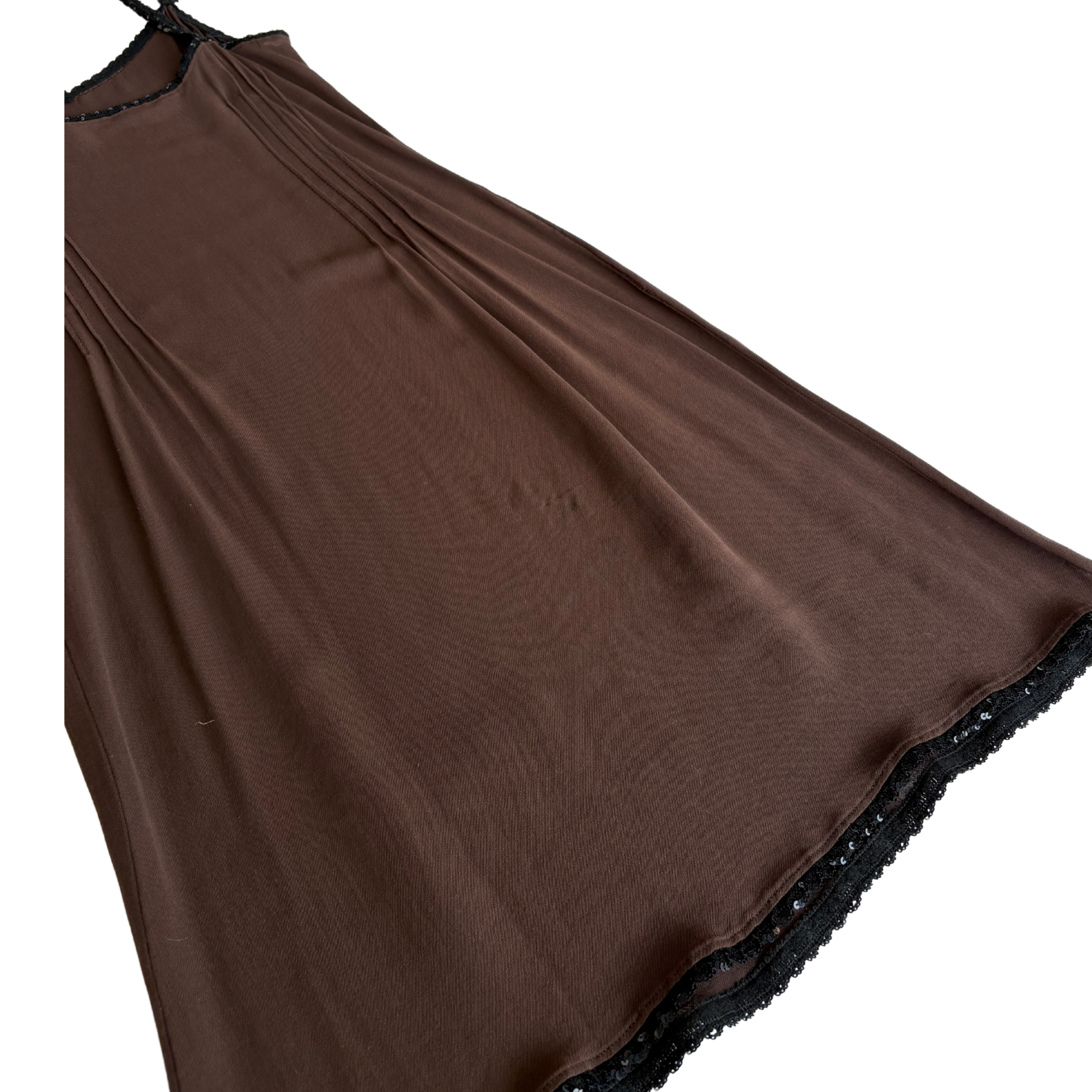 Miu Miu vintage slip dress in brown viscose with front and back pleats, black sequin trim and straps, and a side seam invisible zipper.