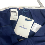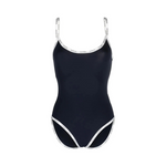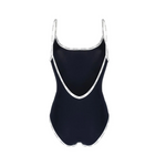 Moncler one-piece bathing suit in navy blue with white trim. Features a low-cut back, black rubber logo monogram on the white trim, and classic full-coverage bottoms.