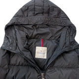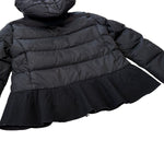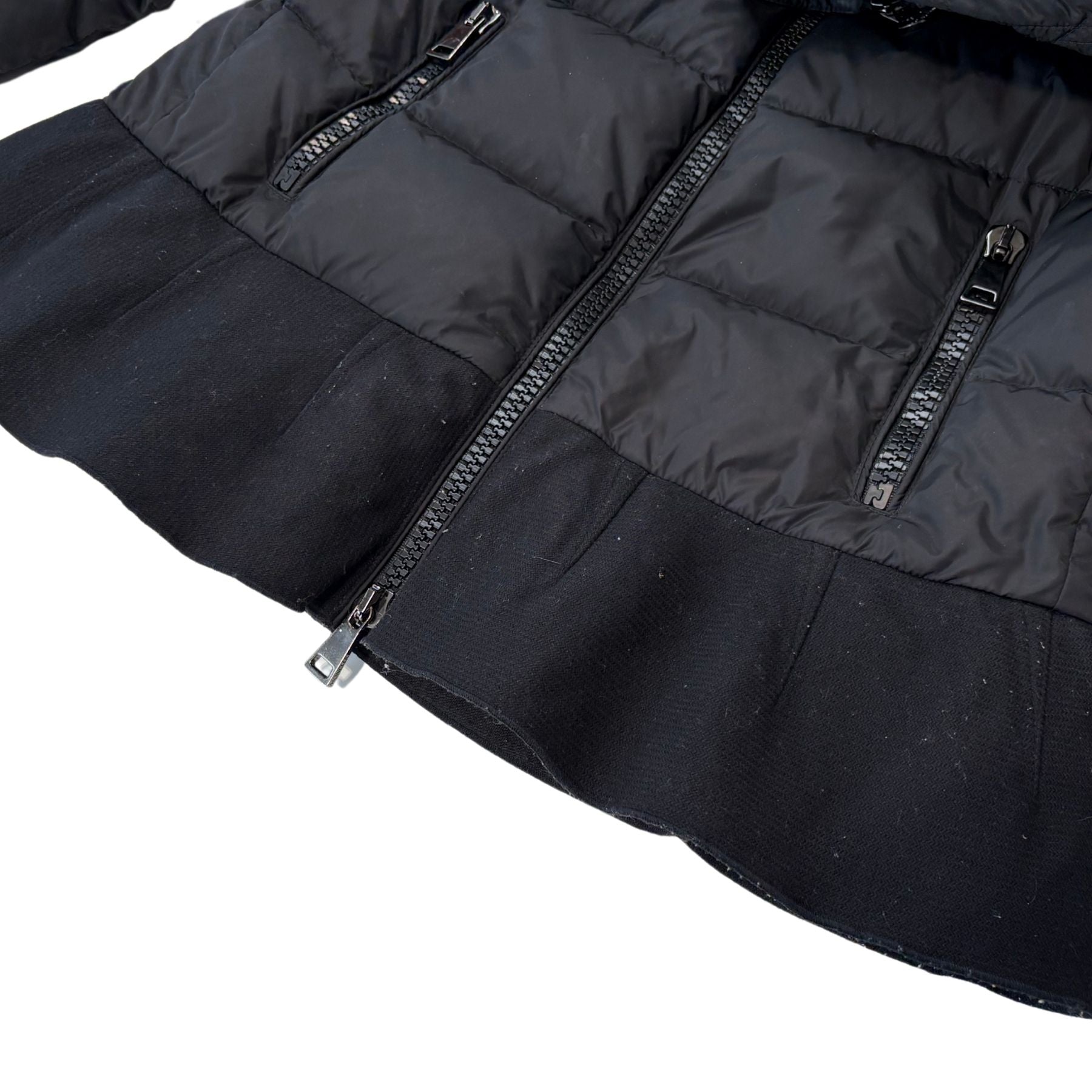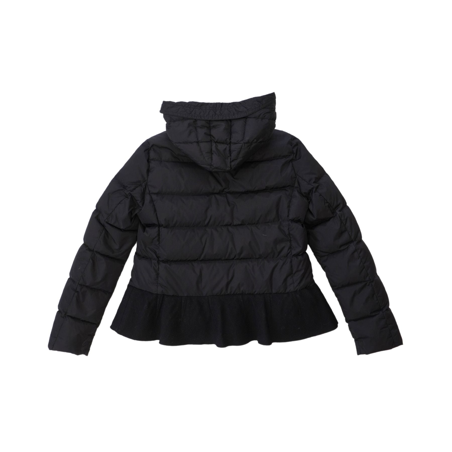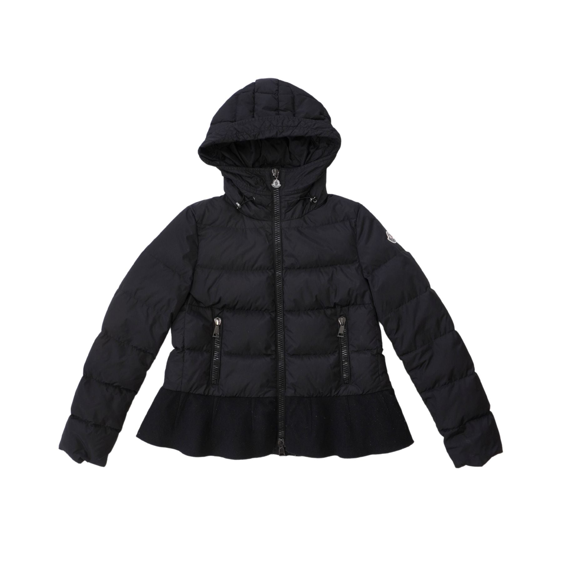Moncler 'Nesea' puffer jacket in black nylon with a wool felt peplum trim. The jacket has a front zip opening in gunmetal hardware, black zip pockets, a drawstring hood, and a signature logo patch on the arm.