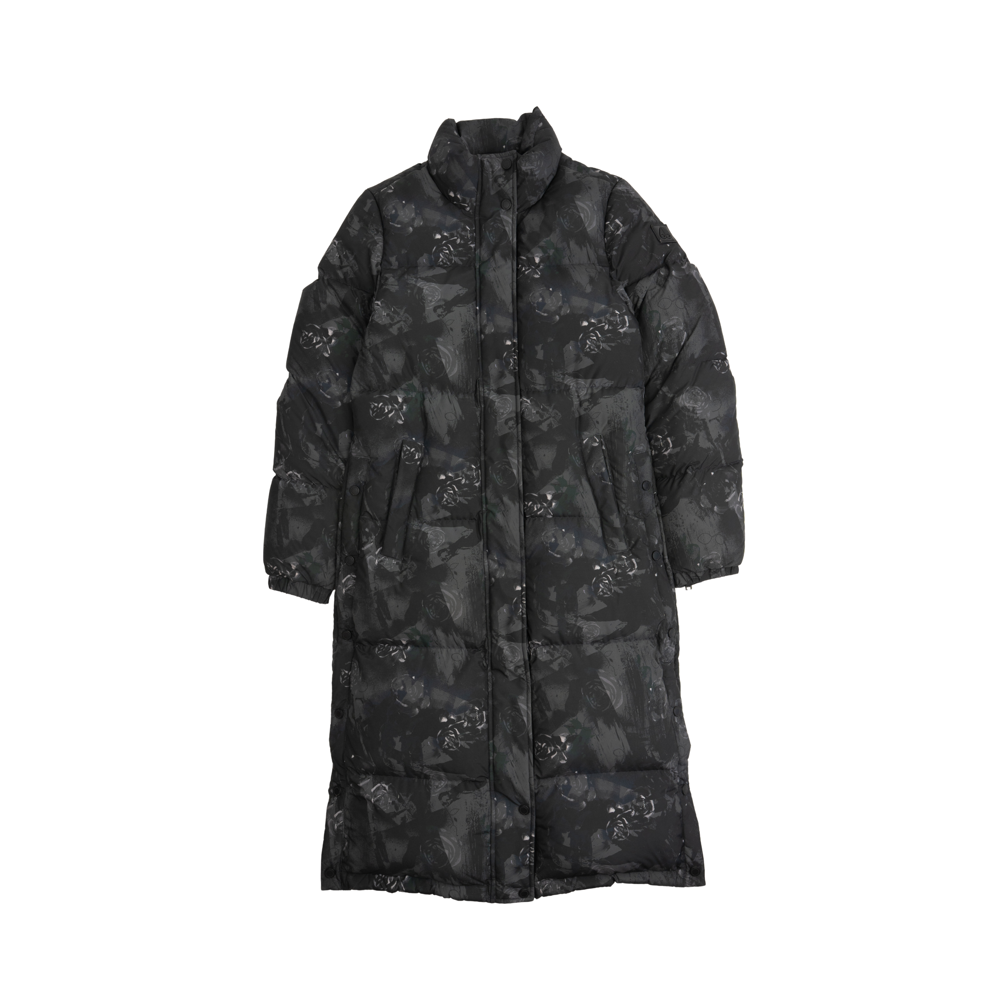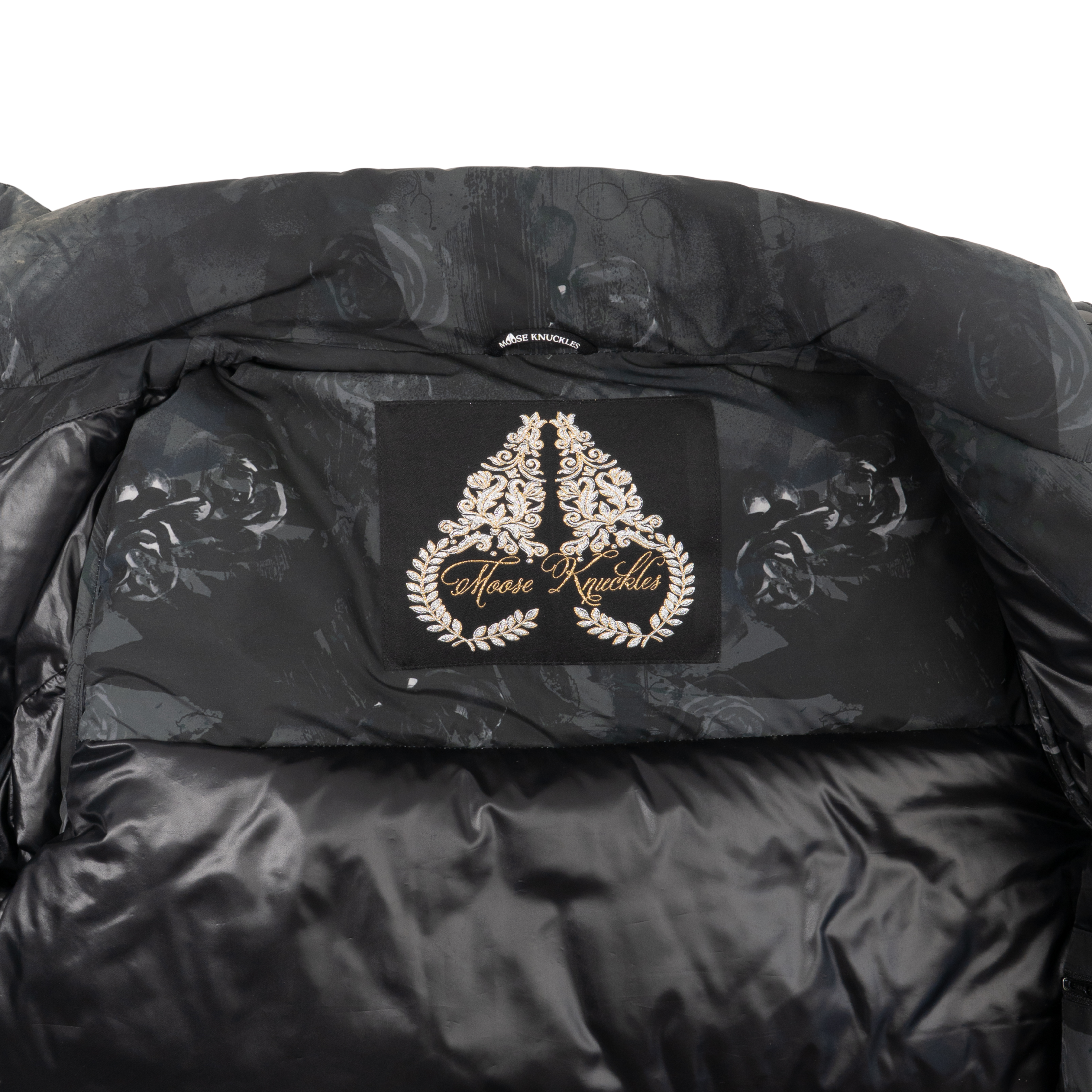 Moose Knuckles maxi parka jacket in black and grey tonal rose print with full front zipper and snap button placket, two front slip pockets and stand collar. Features snap vents on the sides for mobility and zippers on the inner sleeves.