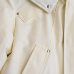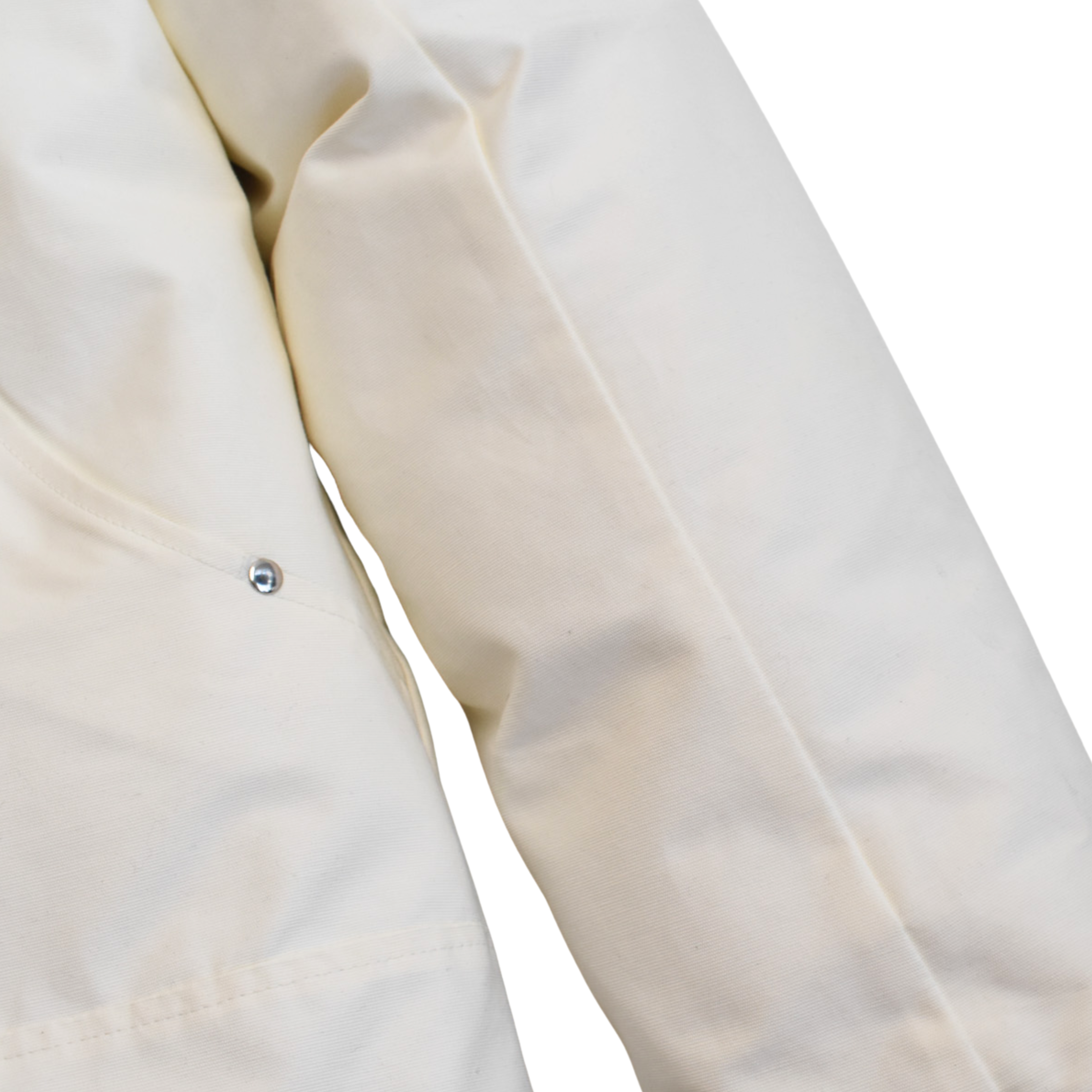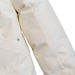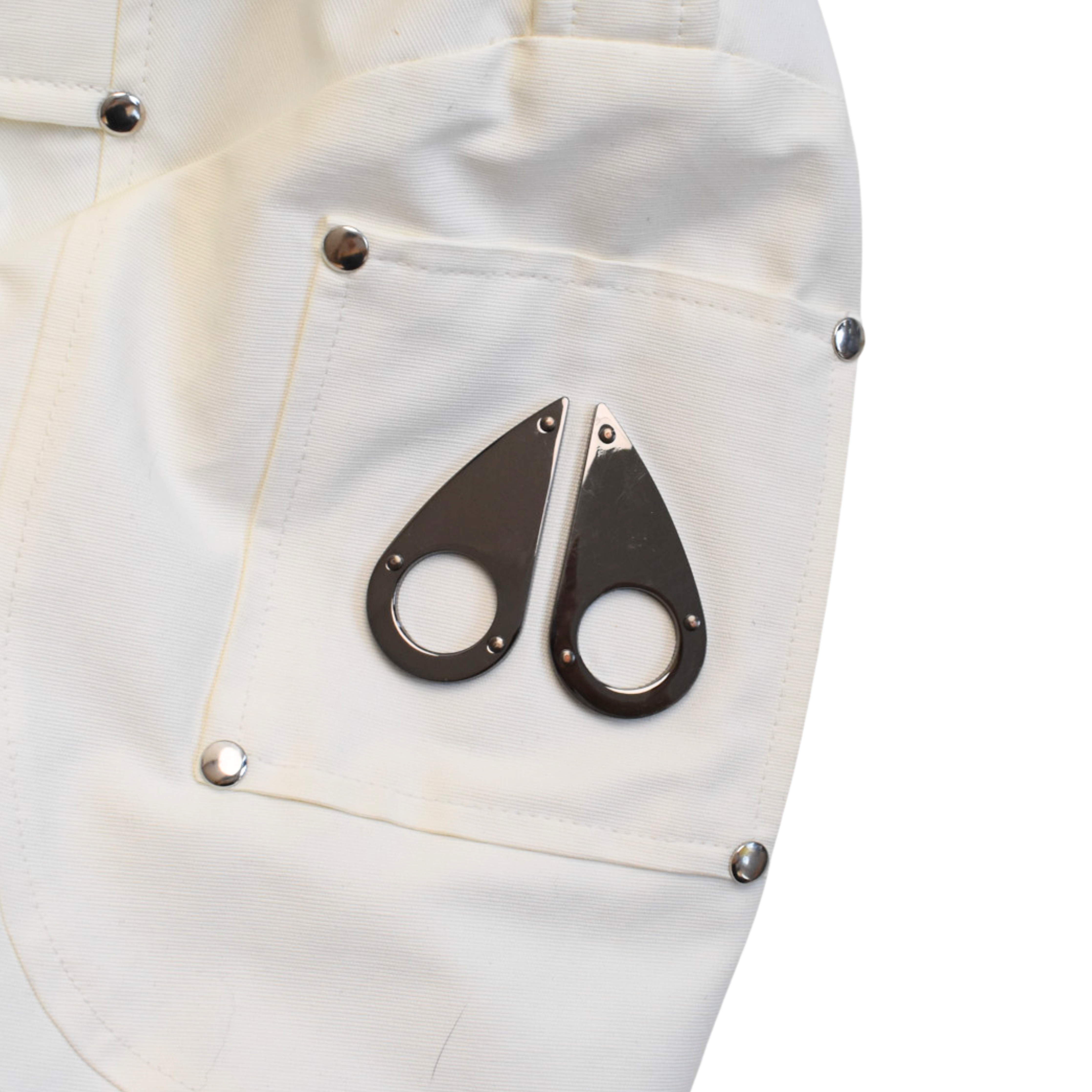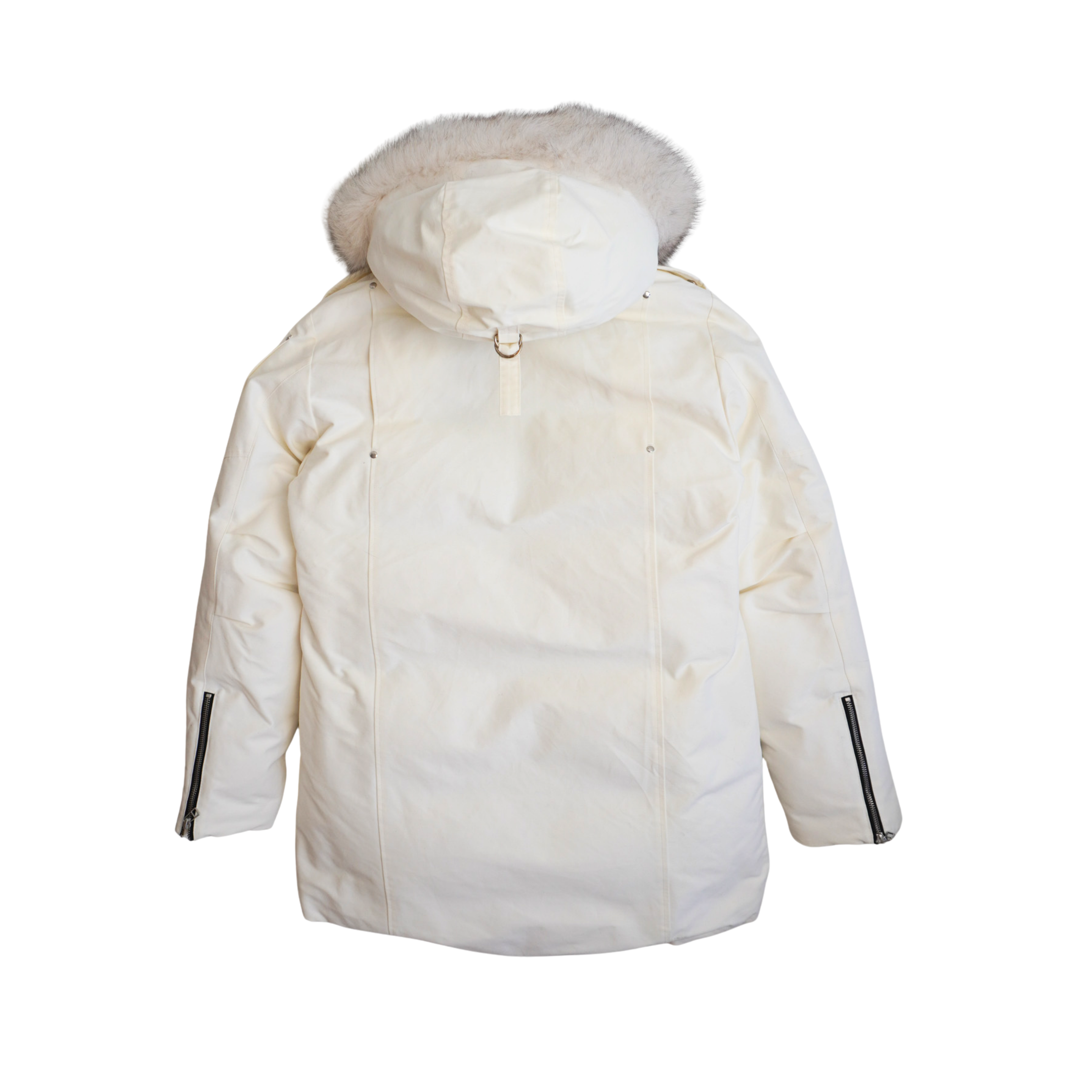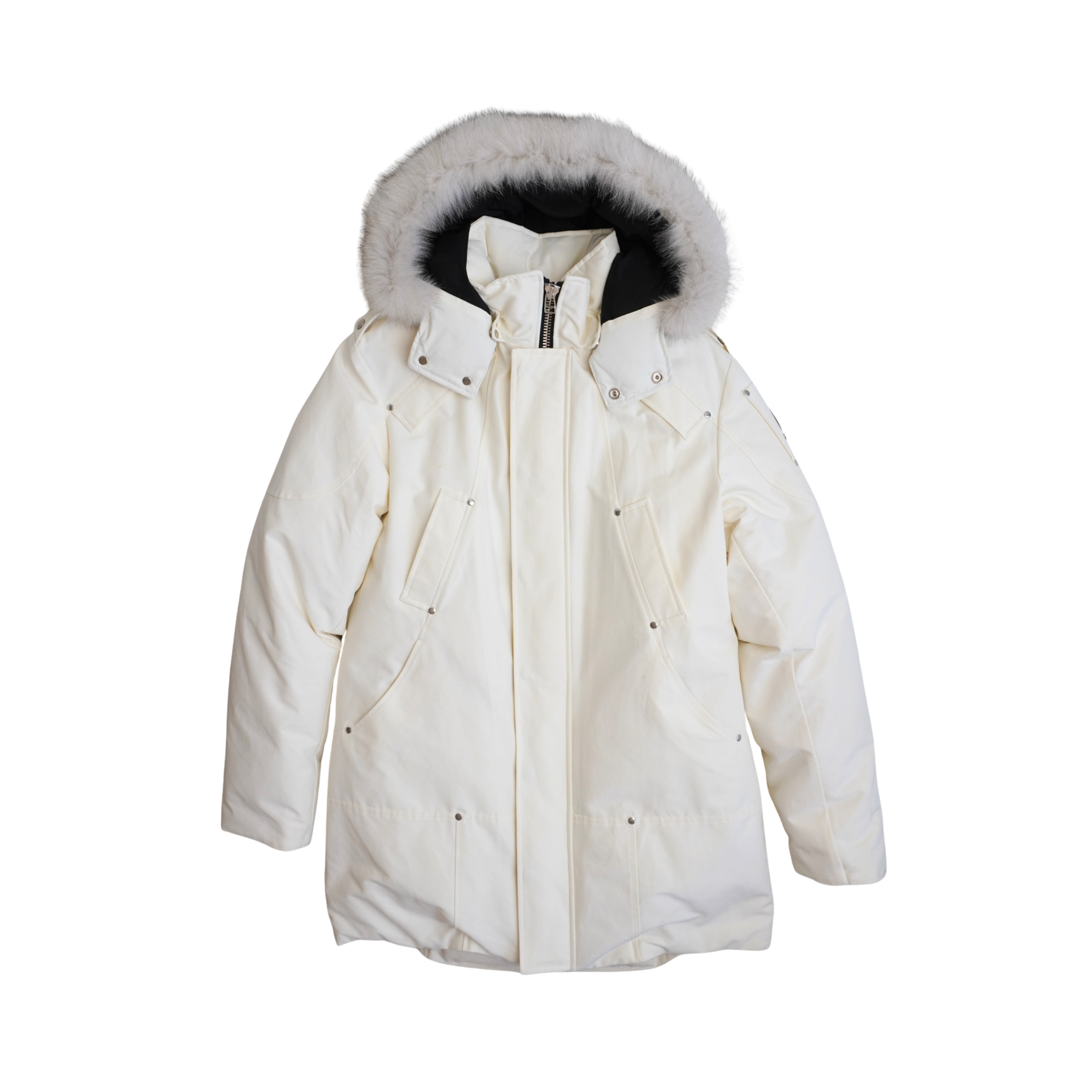 Moose Knuckles 'Stirling' Parka jacket in white nylon. Features a removable hood with light grey trim, zipper and snaps up front, four hand pockets on front, zipper sleeve gussets, and chrome silver metal logo on arm.