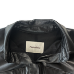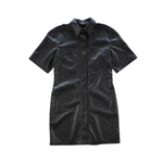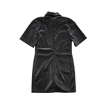 Nanushka short sleeve shift dress in black faux leather with a front button-down closure and chest pockets.