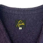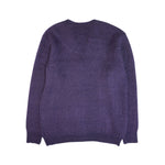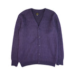 Needles oversized cardigan sweater in purple knit mohair with a v-neckline, ribbed cuffs, and purple marbled buttons.