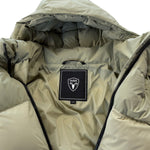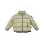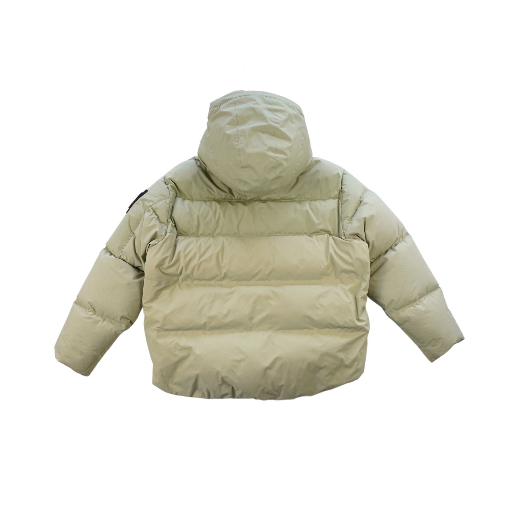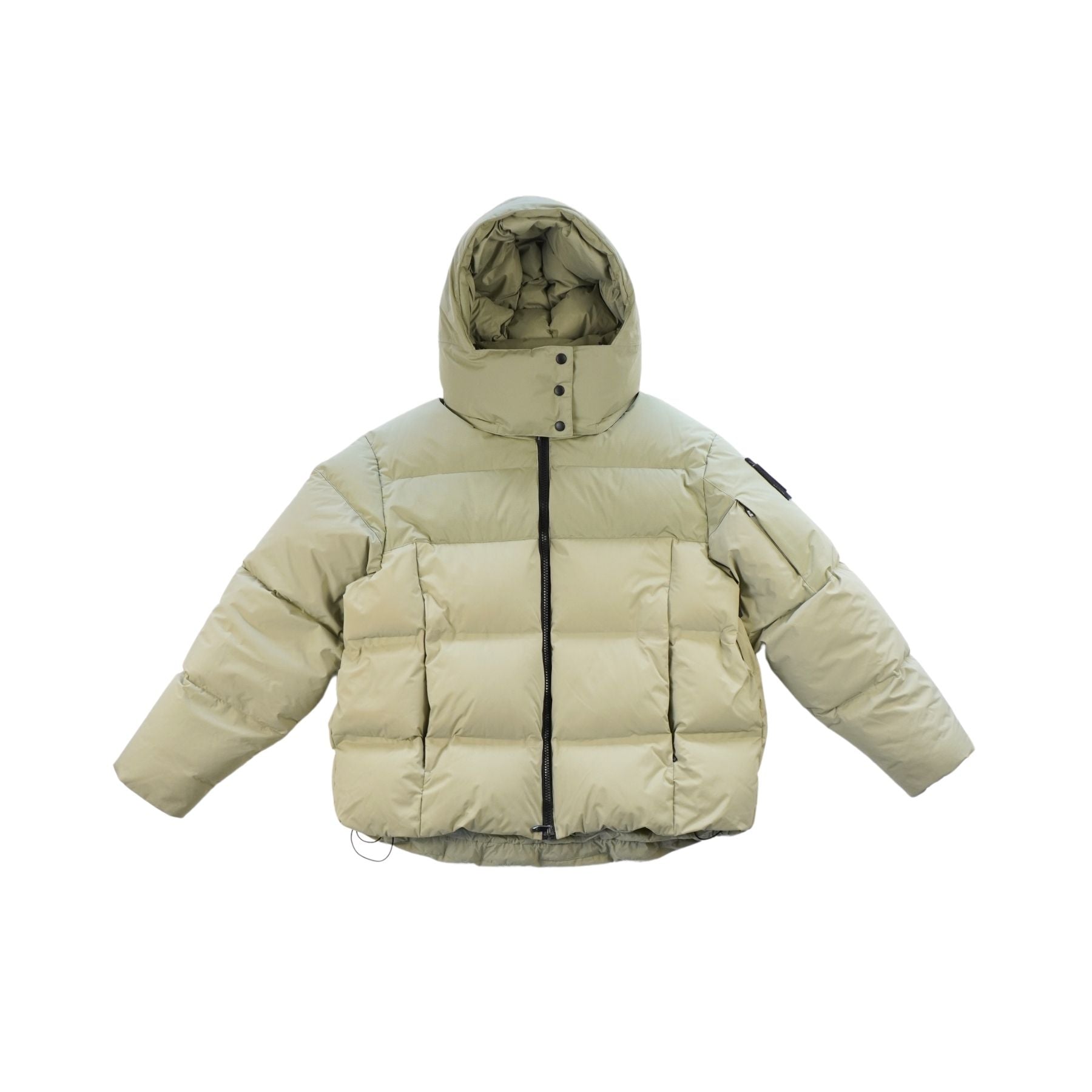 Nobis 'Una' puffer jacket sage green nylon with a front zip opening in black hardware, side zip pockets, adjustable vent openings on the side seam, and a detachable hood.