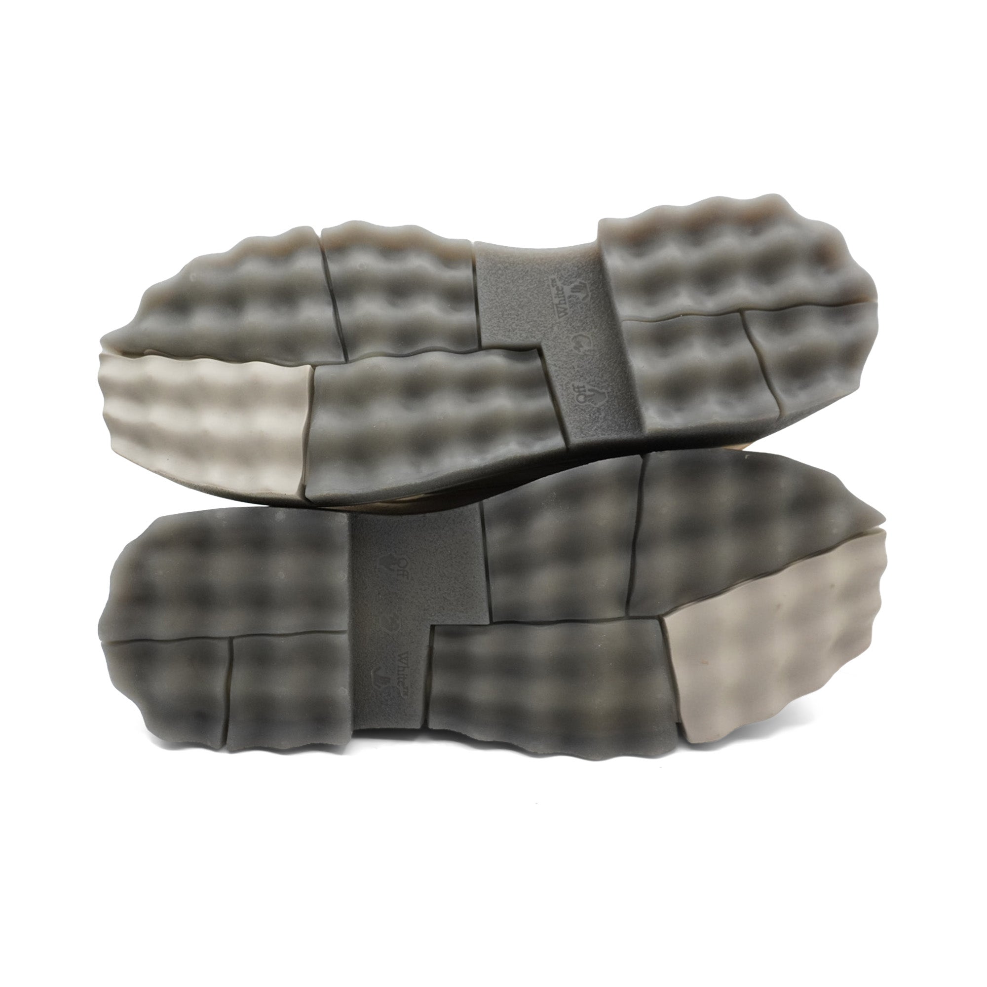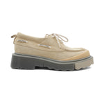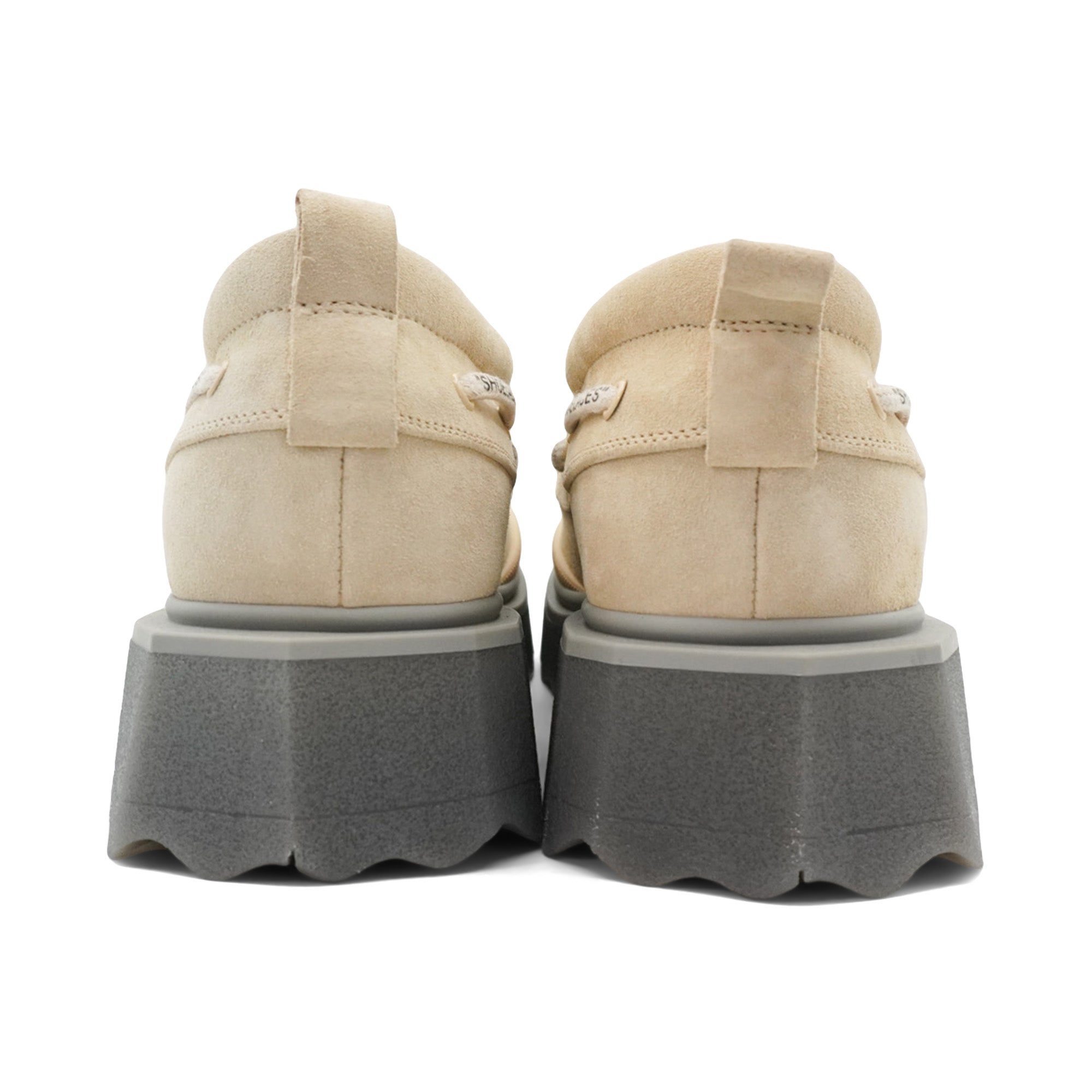 Off-White 'Boat' Shoe in cream suede with thick grey geometric sole and black text on the laces.